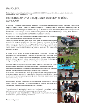 IPA POLSKA Źródło: http://www.ipapolska.pl/ipa/aktualnosci/327,PIKNIK-RODZINNY-z-okazji-Dnia-Dziecka-w-Usciu-Gorlickim.html Wygenerowano: Środa, 8 marca 2017, 17:50 PIKNIK RODZINNY Z OKAZJI „DNIA DZIECKA” W UŚCIU GORLICKIM W sobotę 1 czerwca 2013 roku na stadionie sportowym w miejscowości Uście Gorlickie,członkowie Regionu IPA Gorlice i Zarządu Terenowego NSZZ Policjantów w Gorlicach oraz wspólnie z pracownikami Gminnego Ośrodka Kultury w Uściu Gorlickim i Gminnej Komisji Rozwiązywania Problemów Alkoholowych w Uściu Gorlickim zorganizowali „Piknik Rodzinny”z okazji „Dnia Dziecka”. Patronat nad imprezą objął także Wójt Gminy Uście Gorlickie. W pikniku brały udział dzieci z gminy Uście Gorlickie i całego powiatu gorlickiego oraz dzieci funkcjonariuszy służb mundurowych wraz z rodzicami. Na szczęście pogoda dopisała, dzięki czemu mogły odbyć się wszystkie zaplanowane atrakcje. Na program składały się liczne gry i zabawy sportowe, konkursy zręcznościowe, zawody strzeleckie, występy zespołów dziecięcych i młodzieżowych, pokazy samochodów rajdowych, przejażdżka zaprzęgiem konnym. Zorganizowana była loteria fantowa, rozstawiono stoiska z watą cukrową, balonami, plac zabaw oraz zjeżdżalnię dla dzieci. W trakcie pikniku odbyły się pokazy działań Policji, szczególnie z użyciem psa służbowego oraz pokazy strażaków z Jednostki Ochotniczej Straży Pożarnej w Uściu Gorlickim. Strażacy pokazali akcję ratunkową podczas wypadku drogowego oraz działania w trakcie gaszenia pożaru, zaprezentowali również sprzęt niezbędny przy akcji gaśniczej, a będący na wyposażeniu strażackiego wozu bojowego. Na scenie amfiteatru wystąpiła grupa KYOKUSHIN z Biecza z pokazem walk karate, wystąpiła również Młodzieżowa Orkiestra Dęta z Brunar z koncertem muzycznym. Na deskach amfiteatr odbył się spektakl teatralny wystawiony przez Teatr Moralitet z Krakowa, spektakl poruszał problem uzależnień wśród dzieci i młodzieży. Z ogromnym zainteresowaniem wśród dzieci spotkała się strzelnica sportowa , zorganizowana przez członków IPA Region Gorlice. Skorzystało z niej 130 dzieci , każde po zakończonym strzelaniu otrzymywało swoją tarczę strzelniczą, dyplom uczestnictwa oraz okolicznościowy medal. Tegorocznemu „Piknikowi Rodzinnemu” przyświecało hasło bezpieczeństwa dzieci na drodze, edukacja związana z udzielaniem pierwszej pomocy medycznej oraz profilaktyka w walce z uzależnieniami wśród dzieci i młodzieży. Po emocjonujących rywalizacjach sportowych i konkursach można było wspólnie biesiadować przy prawdziwej kuchni polowej z grochówką oraz grillu. W imprezie brało udział około 150 dzieci i 200 dorosłych, wszystkie dzieci otrzymały okolicznościowe upominki i dyplomy uczestnictwa. Aleksander Szymański Przewodniczący Regionu IPA Gorlice Ocena: 0/5 (0) Tweetnij