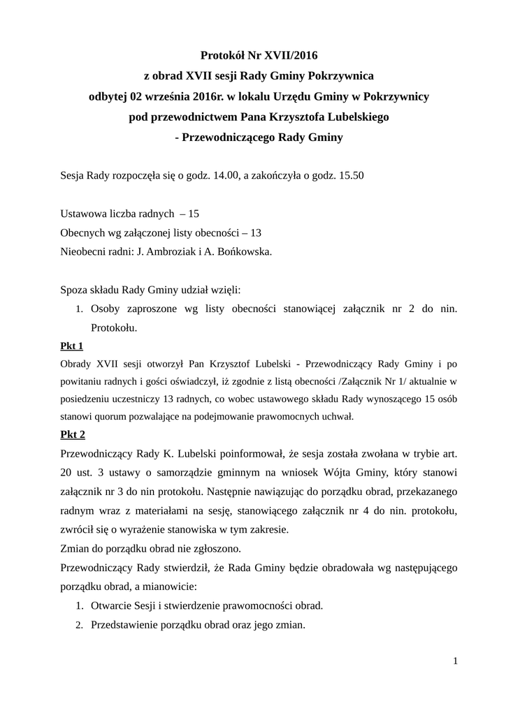 Protokół Nr XVII/2016 z obrad XVII sesji Rady Gminy Pokrzywnica odbytej 02 września 2016r. w lokalu Urzędu Gminy w Pokrzywnicy pod przewodnictwem Pana Krzysztofa Lubelskiego - Przewodniczącego Rady Gminy Sesja Rady rozpoczęła się o godz. 14.00, a zakończyła o godz. 15.50 Ustawowa liczba radnych – 15 Obecnych wg załączonej listy obecności – 13 Nieobecni radni: J. Ambroziak i A. Bońkowska. Spoza składu Rady Gminy udział wzięli: 1. Osoby zaproszone wg listy obecności stanowiącej załącznik nr 2 do nin. Protokołu. Pkt 1 Obrady XVII sesji otworzył Pan Krzysztof Lubelski - Przewodniczący Rady Gminy i po powitaniu radnych i gości oświadczył, iż zgodnie z listą obecności /Załącznik Nr 1/ aktualnie w posiedzeniu uczestniczy 13 radnych, co wobec ustawowego składu Rady wynoszącego 15 osób stanowi quorum pozwalające na podejmowanie prawomocnych uchwał. Pkt 2 Przewodniczący Rady K. Lubelski poinformował, że sesja została zwołana w trybie art. 20 ust. 3 ustawy o samorządzie gminnym na wniosek Wójta Gminy, który stanowi załącznik nr 3 do nin protokołu. Następnie nawiązując do porządku obrad, przekazanego radnym wraz z materiałami na sesję, stanowiącego załącznik nr 4 do nin. protokołu, zwrócił się o wyrażenie stanowiska w tym zakresie. Zmian do porządku obrad nie zgłoszono. Przewodniczący Rady stwierdził, że Rada Gminy będzie obradowała wg następującego porządku obrad, a mianowicie: 1. Otwarcie Sesji i stwierdzenie prawomocności obrad. 2. Przedstawienie porządku obrad oraz jego zmian. 1 3. Podjęcie uchwały w sprawie obowiązkowego wymiaru zajęć lekcyjnych dla nauczycieli, którym powierzono stanowiska kierownicze w szkołach prowadzonych przez Gminę. 4. Podjęcie uchwały w sprawie ustalenia opłat za świadczenia udzielane w oddziałach przedszkolnych i przedszkolach prowadzonych przez Gminę Pokrzywnica. 5. Podjęcie uchwały w sprawie wyrażenia woli przystąpienia Gminy Pokrzywnica do wspólnej realizacji projektu pn. „Odnawialne źródła energii szansą poprawy jakości środowiska naturalnego w Gminach: Pokrzywnica, Obryte, Ojrzeń oraz Powiecie Pułtuskim”, planowanego do realizacji w ramach Regionalnego Programu Operacyjnego Województwa Mazowieckiego na lata 2014 – 2020. 6. Podjęcie uchwały w sprawie zmian uchwały budżetowej Gminy Pokrzywnica na rok 2016. 7. Podjęcie uchwały w sprawie udzielenia pomocy finansowej w formie dotacji celowej dla Powiatu Pułtuskiego na 2016r. 8. Podjęcie uchwały w sprawie udzielenia pomocy finansowej w formie dotacji celowej dla Powiatu Pułtuskiego na 2017r. 9. Podjęcie uchwały w sprawie wyrażenia zgody na przystąpienie Gminy Pokrzywnica do partnerskiego projektu: „Elektronizacja usług administracyjnych 5 JST z województwa mazowieckiego”. 10. Wolne wnioski i oświadczenia. 11. Zamknięcie sesji. Ad 3 Inspektor ds. oświaty G. Kłosiewicz poinformowała, że dyrektorowi i wicedyrektorowi szkoły oraz nauczycielowi pełniącemu inne stanowisko kierownicze w szkole, a także nauczycielowi, który obowiązki kierownicze pełni w zastępstwie nauczyciela, któremu powierzono stanowisko kierownicze, obniża się tygodniowy obowiązkowy wymiar godzin zajęć w zależności od wielkości i typu szkoły oraz warunków pracy lub zwalnia się ich od obowiązku realizacji zajęć w ramach pensum (art. 42 ust. 6 ustawy Karta Nauczyciela). Art. 42 ust. 7 pkt 2 Karty Nauczyciela deleguje rady gmin do określenia zasad udzielania i rozmiaru tych zniżek w drodze uchwały. Z tego względu, że nauczyciel 2 będący dyrektorem szkoły poza prowadzeniem zajęć lekcyjnych piastuje funkcję dyrektora szkoły, może być zwolniony z realizacji pensum lub może korzystać ze zniżki godzin obowiązkowych zajęć. Poprzednio podjęta uchwała w tej sprawie nie obejmowała stanowiska dyrektora przedszkola. Należy więc ustalić pensum dla dyrektora przedszkola. Poza tym po przekształceniu szkoły w Niestępowie i likwidacji szkoły w Pokrzywnicy zmieniła się liczebność uczniów w szkołach. Z uwagi na to zachodzi konieczność podjęcia uchwały uwzględniającej zaistniałe zmiany. Następnie zapoznała radnych z projektem przedmiotowej uchwały, a mianowicie: w § 1. Uwzględniając typ szkoły, liczebność uczniów i oddziałów w szkole lub przedszkolu, obniża się tygodniowy obowiązkowy wymiar godzin zajęć dydaktycznych, wychowawczych i opiekuńczych: 1) Dla dyrektora Samorządowego Przedszkola w Pokrzywnicy – do 6 godzin tygodniowo. 2) Dla nauczycieli, którym powierzono stanowiska kierownicze w szkołach podstawowych w następujący sposób: a) w przypadku dyrektora szkoły liczącej do 100 uczniów- do 9 godzin tygodniowo, b) w przypadku dyrektora szkoły liczącej powyżej 100 uczniów - do 6 godzin tygodniowo. 3) Dla dyrektora gimnazjum – do 4 godzin tygodniowo. § 2. Rozmiar zniżki ustalony w § 1 odnosi się również do nauczycieli zajmujących stanowiska kierownicze w zastępstwie nauczycieli, którym powierzono te stanowiska, z tym, że obowiązuje ona tych nauczycieli – od pierwszego dnia miesiąca następującego po miesiącu, w którym zlecono nauczycielowi zastępstwo. § 3. Nauczycielom, którym powierzono stanowisko dyrektora szkoły lub przedszkola organ prowadzący szkołę może przydzielić godziny ponadwymiarowe w wymiarze nie przekraczającym 4 godziny tygodniowo. § 4. Traci moc uchwała Nr XIX/94/2012 Rady Gminy Pokrzywnica z dnia 18 kwietnia 2012r. w sprawie obowiązkowego wymiaru godzin zajęć lekcyjnych dla nauczycieli, którym powierzono stanowiska kierownicze w szkołach prowadzonych przez Gminę. Radny W. Król pytał, jakie zniżki obowiązywały w poprzednio podjętej uchwale? 3 Inspektor ds. oświat G. Kłosiewicz odczytała § 1 z Uchwały nr XIX/94/2012, a mianowicie: Uwzględniając typ szkoły, liczebność uczniów i oddziałów oraz specyfikę nauczanego przedmiotu, obniża się tygodniowy obowiązkowy wymiar godzin zaj