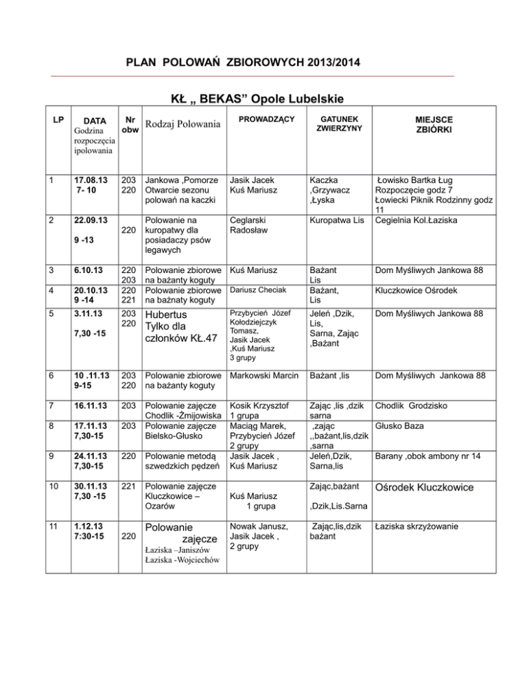PLAN POLOWAŃ ZBIOROWYCH 2013/2014 KŁ „ BEKAS” Opole Lubelskie LP Nr DATA obw Godzina rozpoczęcia ipolowania Rodzaj Polowania 1 17.08.13 7- 10 Jankowa ,Pomorze Otwarcie sezonu polowań na kaczki Jasik Jacek Kuś Mariusz Kaczka ,Grzywacz ,Łyska 2 22.09.13 Polowanie na kuropatwy dla posiadaczy psów legawych Ceglarski Radosław Kuropatwa Lis 203 220 220 9 -13 3 6.10.13 4 20.10.13 9 -14 5 3.11.13 PROWADZĄCY 220 203 220 221 Polowanie zbiorowe Kuś Mariusz na bażanty koguty Polowanie zbiorowe Dariusz Checiak na bażnaty koguty 203 220 Hubertus Tylko dla członków KŁ.47 7,30 -15 Przybycień Józef Kołodziejczyk Tomasz, Jasik Jacek ,Kuś Mariusz 3 grupy GATUNEK ZWIERZYNY MIEJSCE ZBIÓRKI Łowisko Bartka Ług Rozpoczęcie godz 7 Łowiecki Piknik Rodzinny godz 11 Cegielnia Kol.Łaziska Bażant Lis Bażant, Lis Dom Myśliwych Jankowa 88 Jeleń ,Dzik, Lis, Sarna, Zając ,Bażant Dom Myśliwych Jankowa 88 Dom Myśliwych Jankowa 88 Kluczkowice Ośrodek 6 10 .11.13 9-15 203 220 Polowanie zbiorowe Markowski Marcin na bażanty koguty Bażant ,lis 7 16.11.13 203 8 17.11.13 7,30-15 203 Polowanie zajęcze Chodlik -Żmijowiska Polowanie zajęcze Bielsko-Głusko 9 24.11.13 7,30-15 220 Polowanie metodą szwedzkich pędzeń Kosik Krzysztof 1 grupa Maciąg Marek, Przybycień Józef 2 grupy Jasik Jacek , Kuś Mariusz Zając ,lis ,dzik Chodlik Grodzisko sarna ,zając Głusko Baza ,,bażant,lis,dzik ,sarna Jeleń,Dzik, Barany ,obok ambony nr 14 Sarna,lis 10 30.11.13 7,30 -15 221 Polowanie zajęcze Kluczkowice – Ozarów Kuś Mariusz 1 grupa 11 1.12.13 7:30-15 220 Polowanie zajęcze Łaziska –Janiszów Łaziska -Wojciechów Zając,bażant Nowak Janusz, Jasik Jacek , 2 grupy Ośrodek Kluczkowice ,Dzik,Lis.Sarna Zając,lis,dzik bażant Łaziska skrzyżowanie 12 13 15 .12.13 7,30 -15 220, Polowanie na 203, bażanty koguty 221 221 Polowanie zajęcze 220 14. 24.12.13 8-14 203 220 15. 29.12.13 8-15 203 220 221 16 1.01.14 9- 16 203 220 221 203 220 221 220 203 Polowanie indywidualne na bażanty Koguty Polowanie indywidualne na bażanty koguty Zakończenie sezonu Polowań Zbiorowych 203 220 221 Polowanie na lisy w grupach roboczych Kołodziejczyk Tomasz Nowak Adam Przybycień Józef Maciąg Marek 17 18. 19. 8.12.13 9 -15 5.01.14 9- 16 12.01.14 8 -15 2 .02 14 10-15 Wójtowicz Zbigniew Nowak Adam , Kosior Zbigniew 2grupy Piłat Tadeusz Polowanie Ceglarski Wigilijne Radosław Polowanie w małych Kuś Mariusz grupach na dziki , Sobka Slwester jelenie ,sarny Kołodziejczyk Małe Szwedzkie Tomasz Nowak Janusz Maciąg Marek Bażant,lis Dom Myśliwych Jankowa 88 Zając ,lis ,dzik Kamień droga mostowa Zając ,lis ,dzik ,bażant Dom Myśliwych Jankowa 88 Dzik ,lis, Jeleń ,sarna Dom Mysliwych Jankowa 88 ------------------------- Bażant ,lis ----------------------------------------- ------------------------- Bażant ,lis ---------------------------------------- Jasik Jacek Przybycień Józef, Tomasz Kołodziejczyk Dzik ,Jeleń ,sarna ,lis Łaziska skrzyżowanie Zakończenie Dom Myśliwych Lis,bażant Dom Myśliwych Jankowa 88 Dodatkowe informacje . Polowania na kaczki z wyjątkiem polowania 17.08.2013 odbywają się w każdą sobotę i niedzielę od świtu do zmierzchu . Od 15 10 .2013r do zakończenia sezonu to jest do dnia 21 12.2013r w obwodzie 221 polujemy na kaczki dodatkowo w środy .od świtu do zmierzchu Od dnia 18.01.2014r do dnia 23 .02.2014 r na bażanty koguty polujemy indywidualnie w każdą sobotę od 10 tej do 16tej. Zarząd Koła zastrzega sobie zmiany terminu polowań zbiorowych i indywidualnych oraz zwierzyny przewidzianej do odstrzału .Spowodowane to może być warunkami atmosferycznymi i aktualizacją planu pozyskania. Zapisy na polowania zbiorowe na zające, dziki do piątku poprzedzającego polowanie zbiorowe u Łowczego Koła. Zapisy na polowanie zbiorowe na bażanty w dniu polowania u prowadzącego. Łowczy Koła