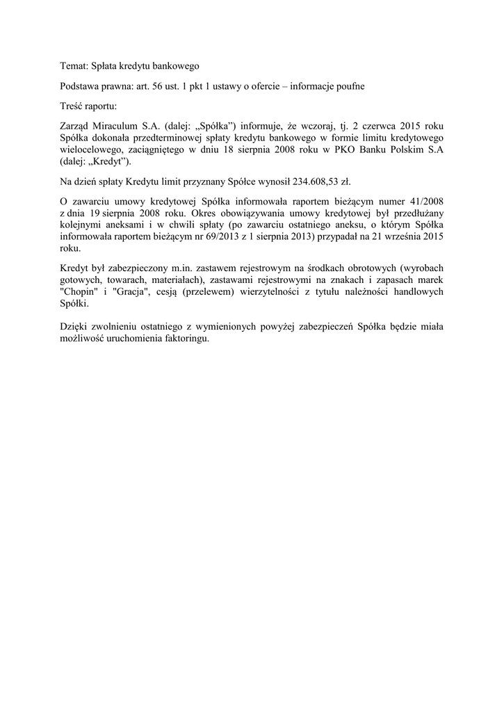 Temat: Spłata kredytu bankowego Podstawa prawna: art. 56 ust. 1 pkt 1 ustawy o ofercie – informacje poufne Treść raportu: Zarząd Miraculum S.A. (dalej: „Spółka”) informuje, że wczoraj, tj. 2 czerwca 2015 roku Spółka dokonała przedterminowej spłaty kredytu bankowego w formie limitu kredytowego wielocelowego, zaciągniętego w dniu 18 sierpnia 2008 roku w PKO Banku Polskim S.A (dalej: „Kredyt”). Na dzień spłaty Kredytu limit przyznany Spółce wynosił 234.608,53 zł. O zawarciu umowy kredytowej Spółka informowała raportem bieżącym numer 41/2008 z dnia 19 sierpnia 2008 roku. Okres obowiązywania umowy kredytowej był przedłużany kolejnymi aneksami i w chwili spłaty (po zawarciu ostatniego aneksu, o którym Spółka informowała raportem bieżącym nr 69/2013 z 1 sierpnia 2013) przypadał na 21 września 2015 roku. Kredyt był zabezpieczony m.in. zastawem rejestrowym na środkach obrotowych (wyrobach gotowych, towarach, materiałach), zastawami rejestrowymi na znakach i zapasach marek "Chopin" i "Gracja", cesją (przelewem) wierzytelności z tytułu należności handlowych Spółki. Dzięki zwolnieniu ostatniego z wymienionych powyżej zabezpieczeń Spółka będzie miała możliwość uruchomienia faktoringu.