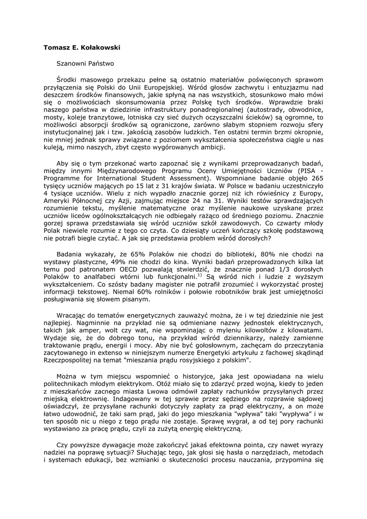 Tomasz E. Kołakowski Szanowni Państwo Środki masowego przekazu pełne są ostatnio materiałów poświęconych sprawom przyłączenia się Polski do Unii Europejskiej. Wśród głosów zachwytu i entuzjazmu nad deszczem środków finansowych, jakie spłyną na nas wszystkich, stosunkowo mało mówi się o możliwościach skonsumowania przez Polskę tych środków. Wprawdzie braki naszego państwa w dziedzinie infrastruktury ponadregionalnej (autostrady, obwodnice, mosty, koleje tranzytowe, lotniska czy sieć dużych oczyszczalni ścieków) są ogromne, to możliwości absorpcji środków są ograniczone, zarówno słabym stopniem rozwoju sfery instytucjonalnej jak i tzw. jakością zasobów ludzkich. Ten ostatni termin brzmi okropnie, nie mniej jednak sprawy związane z poziomem wykształcenia społeczeństwa ciągle u nas kuleją, mimo naszych, zbyt często wygórowanych ambicji. Aby się o tym przekonać warto zapoznać się z wynikami przeprowadzanych badań, między innymi Międzynarodowego Programu Oceny Umiejętności Uczniów (PISA Programme for International Student Assessment). Wspomniane badanie objęło 265 tysięcy uczniów mających po 15 lat z 31 krajów świata. W Polsce w badaniu uczestniczyło 4 tysiące uczniów. Wielu z nich wypadło znacznie gorzej niż ich rówieśnicy z Europy, Ameryki Północnej czy Azji, zajmując miejsce 24 na 31. Wyniki testów sprawdzających rozumienie tekstu, myślenie matematyczne oraz myślenie naukowe uzyskane przez uczniów liceów ogólnokształcących nie odbiegały rażąco od średniego poziomu. Znacznie gorzej sprawa przedstawiała się wśród uczniów szkół zawodowych. Co czwarty młody Polak niewiele rozumie z tego co czyta. Co dziesiąty uczeń kończący szkołę podstawową nie potrafi biegle czytać. A jak się przedstawia problem wśród dorosłych? Badania wykazały, że 65% Polaków nie chodzi do biblioteki, 80% nie chodzi na wystawy plastyczne, 49% nie chodzi do kina. Wyniki badań przeprowadzonych kilka lat temu pod patronatem OECD pozwalają stwierdzić, że znacznie ponad 1/3 dorosłych Polaków to analfabeci wtórni lub funkcjonalni.1) Są wśród nich i ludzie z wyższym wykształceniem. Co szósty badany magister nie potrafił zrozumieć i wykorzystać prostej informacji tekstowej. Niemal 60% rolników i połowie robotników brak jest umiejętności posługiwania się słowem pisanym. Wracając do tematów energetycznych zauważyć można, że i w tej dziedzinie nie jest najlepiej. Nagminnie na przykład nie są odmieniane nazwy jednostek elektrycznych, takich jak amper, wolt czy wat, nie wspominając o myleniu kilowoltów z kilowatami. Wydaje się, że do dobrego tonu, na przykład wśród dziennikarzy, należy zamienne traktowanie prądu, energii i mocy. Aby nie być gołosłownym, zachęcam do przeczytania zacytowanego in extenso w niniejszym numerze Energetyki artykułu z fachowej skądinąd Rzeczpospolitej na temat "mieszania prądu rosyjskiego z polskim". Można w tym miejscu wspomnieć o historyjce, jaka jest opowiadana na wielu politechnikach młodym elektrykom. Otóż miało się to zdarzyć przed wojną, kiedy to jeden z mieszkańców zacnego miasta Lwowa odmówił zapłaty rachunków przysyłanych przez miejską elektrownię. Indagowany w tej sprawie przez sędziego na rozprawie sądowej oświadczył, że przysyłane rachunki dotyczyły zapłaty za prąd elektryczny, a on może łatwo udowodnić, że taki sam prąd, jaki do jego mieszkania "wpływa" taki "wypływa" i w ten sposób nic u niego z tego prądu nie zostaje. Sprawę wygrał, a od tej pory rachunki wystawiano za pracę prądu, czyli za zużytą energię elektryczną. Czy powyższe dywagacje może zakończyć jakaś efektowna pointa, czy nawet wyrazy nadziei na poprawę sytuacji? Słuchając tego, jak głosi się hasła o narzędziach, metodach i systemach edukacji, bez wzmianki o skuteczności procesu nauczania, przypomina się zakończenie wykładów profesora Stanisławskiego "I to by było na tyle". 1) mniemanologii stosowanej, Jana Tadeusza Analfabeta wtórny to człowiek, który pomimo ukończenia szkoły nie potrafi sprawnie czytać i pisać. Z kolei analfabetyzm funkcjonalny, to niezrozumienie prostych informacji tekstowych, z którymi mamy do czynienia na co dzień, choćby ogłoszeń czy ulotek informujących o sposobie dawkowania prostych leków oraz nieumiejętność wykorzystywania tych informacji w życiu codziennym.