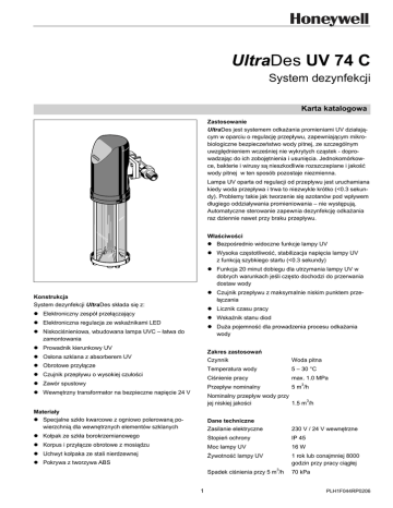 UltraDes UV 74 C System dezynfekcji Karta katalogowa Zastosowanie UltraDes jest systemem odkażania promieniami UV działającym w oparciu o regulację przepływu, zapewniającym mikrobiologiczne bezpieczeństwo wody pitnej, ze szczególnym uwzględnieniem wcześniej nie wykrytych cząstek - doprowadzając do ich zobojętnienia i usunięcia. Jednokomórkowce, bakterie i wirusy są nieszkodliwie rozszczepiane i jakość wody pitnej w ten sposób pozostaje niezmienna. Lampa UV oparta od regulacji od przepływu jest uruchamiana kiedy woda przepływa i trwa to niezwykle krótko (<0.3 sekundy). Problemy takie jak tworzenie się azotanów pod wpływem długiego oddziaływania promieniowania – nie występują. Automatyczne sterowanie zapewnia dezynfekcję odkażania raz dziennie nawet przy braku przepływu. Właściwości Bezpośrednio widoczne funkcje lampy UV Wysoka częstotliwość, stabilizacja napięcia lampy UV z funkcją szybkiego startu (<0.3 sekundy) Funkcja 20 minut dobiegu dla utrzymania lampy UV w dobrych warunkach jeśli często dochodzi do przerwania dostaw wody Czujnik przepływu z maksymalnie niskim punktem przełączania Konstrukcja System dezynfekcji UltraDes składa się z: Licznik czasu pracy Elektroniczny zespół przełączający Wskaźnik stanu diod Elektroniczna regulacja ze wskaźnikami LED Duża pojemność dla prowadzenia procesu odkażania wody Niskociśnieniowa, wbudowana lampa UVC – łatwa do zamontowania Prowadnik kierunkowy UV Osłona szklana z absorberem UV Obrotowe przyłącze Czujnik przepływu o wysokiej czułości Zawór spustowy Wewnętrzny transformator na bezpieczne napięcie 24 V Zakres zastosowań Czynnik Woda pitna Temperatura wody 5 – 30 °C Ciśnienie pracy max. 1.0 MPa Przepływ nominalny 3 5 m /h Nominalny przepływ wody przy jej niskiej jakości 1.5 m3/h Materiały Specjalne szkło kwarcowe z ogniowo polerowaną powierzchnią dla wewnętrznych elementów szklanych Dane techniczne Zasilanie elektryczne 230 V / 24 V wewnętrzne Kołpak ze szkła borokrzemianowego Stopień ochrony IP 45 Korpus i przyłącze obrotowe z mosiądzu Moc lampy UV 16 W Uchwyt kołpaka ze stali nierdzewnej Żywotność lampy UV 1 rok lub conajmniej 8000 godzin przy pracy ciągłej Spadek ciśnienia przy 5 m3/h 70 kPa Pokrywa z tworzywa ABS 1 PLH1F044RP0206 Zasada działania Przepływająca woda jest poddana działaniu promieni UV o długości fali 254 nm. Jeśli znajdują się w niej drobnoustroje wtedy ich kod regeneracyjny (DNA) jest niszczony przez promienie UV i pozostają nieszkodliwe. Jakość wody pozostaje niezmieniona. L l System dezynfekcji UltraDes UV 74 C h H Moc potrzebna dla UltraDes do procesu odkażenia jest osiągana przez użycie niskociśnieniowej 16 watowej lampy UVC. Prowadnik promieni zdwaja ich strumień z lampy UV i zabezpiecza przed ich wzajemnym oddziaływaniem na siebie. Lampa UV oparta na regulacji przepływu kontroluje działanie tylko wtedy, gdy nie ma przepływu wody. Funkcja 20 minut dobiegu dla lampy UV utrzymuje lampę w dobrym stanie nawet wówczas gdy często brak jest przepływu wody. Wskaźnik LED sygnalizuje potrzebę wymiany lampy. Wersje UV 74 C-A = dla 1- lub 2-rodzinnego domu mieszkalnego D T Przyłącze gwintowe Ciężar Wymiary (kg) (mm) H h D T R l L R R 3 /4 " 6.4 R 1" 6.5 R 1 1 /4 " 6.6 420 315 117 95 27 100 203 420 315 117 95 27 100 206 230 mm 0.18 W/cm > 99 % 420 315 117 95 31 105 224 Długość lampy UVC Gęstość mocy UVC Redukcja E-Coli przy 5 m3/h Redukcja E-Coli przy 1.5 m3/h > 99.999 % Transmisja UVC elementów wewn. Transmisja UVC osłony zewn. > 98 % / cm 0% Akcesoria alwa Zawory odcinające alwa PLH1F044RP0206 2 Zawór odcinający Zawór z czerwonego mosiądzu o cichym działaniu. Dostępny w różnych kształtach i wielkościach przyłączy. System dezynfekcji UltraDes UV 74 C Przykłady instalacji Zasady instalacji Zalecane jest zamontowanie filtra dokładnego Honeywell aby zabezpieczyć przed dostaniem się ciał obcych Typowe Zastosowania System UltraDes może być stosowany wszędzie tam, gdzie musi być zagwarantowane bezpieczeństwo mikrobiologiczne ze strony zasilania wody pitnej. Dla wysokich ciśnień (> 1 MPa) przed urządzeniem należy zamontować regulator ciśnienia Wymagane jest oddzielne gniazdo w odległości 1,5m dla zasilania urządzenia System UltraDes może być montowany: Dla ochrony wody pitnej przed drobnoustrojami wywołującymi choroby Zamontować zawory odcinające Umożliwia to - obsługę urządzenia bez konieczności jego demontażu z instalacji Zapewnić dobry dostęp To upraszcza obsługę i kontrolę W domach 1- lub 2-rodzinnych Kiedy woda pitna jest wątpliwej jakości higienicznej przy przepływie ok. 1.5 m3/h Miejsce zamontowania musi być chronione przed mrozem Zamontować do ustawionego poziomo lub pionowo przyłącza obrotowego z osłoną czujnika Wszystkie prace powinny być prowadzone przez upoważnione osoby Jeśli jest już zainstalowane inne urządzenie do uzdatniania wody, UltraDes powinien być zamontowany przed nim Jako zamienna lampa UV jest dopuszczalna tylko lampa Honeywell UVE 74-A Aby ułatwić wymianę lampy UV należy zachować min. 10 cm wolnej przestrzeni pod urządzeniem 3 PLH1F044RP0206 System dezynfekcji UltraDes UV 74 C Części zamienne dla systemu UltraDes UV 74 C Od roku 2001 Opis Wielkość Wymienny wkład lampy UV 3/4" – 1 1/4" Honeywell Sp. z o. o. ul. Domaniewska 41, 02-672 WARSZAWA (48)(22) 606 09 00; Fax (48)(22) 606 09 01 http://www honeywell com pl PLH1F044RP0206 4 Nr części UVE 74-A