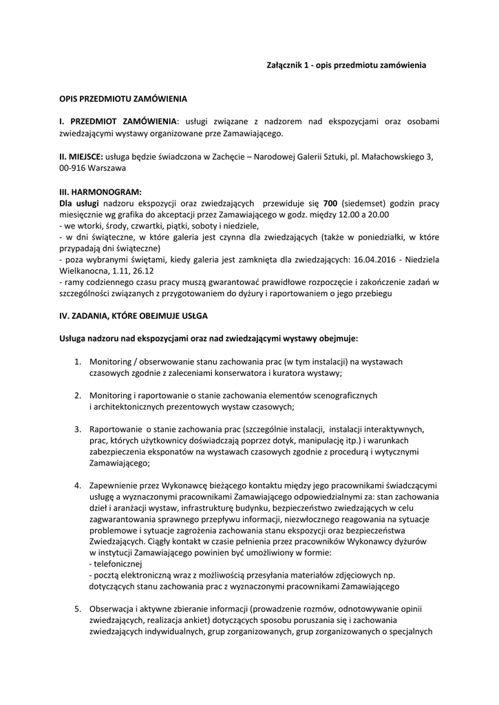 Załącznik 1 - opis przedmiotu zamówienia OPIS PRZEDMIOTU ZAMÓWIENIA I. PRZEDMIOT ZAMÓWIENIA: usługi związane z nadzorem nad ekspozycjami oraz osobami zwiedzającymi wystawy organizowane prze Zamawiającego. II. MIEJSCE: usługa będzie świadczona w Zachęcie – Narodowej Galerii Sztuki, pl. Małachowskiego 3, 00-916 Warszawa III. HARMONOGRAM: Dla usługi nadzoru ekspozycji oraz zwiedzających przewiduje się 700 (siedemset) godzin pracy miesięcznie wg grafika do akceptacji przez Zamawiającego w godz. między 12.00 a 20.00 - we wtorki, środy, czwartki, piątki, soboty i niedziele, - w dni świąteczne, w które galeria jest czynna dla zwiedzających (także w poniedziałki, w które przypadają dni świąteczne) - poza wybranymi świętami, kiedy galeria jest zamknięta dla zwiedzających: 16.04.2016 - Niedziela Wielkanocna, 1.11, 26.12 - ramy codziennego czasu pracy muszą gwarantować prawidłowe rozpoczęcie i zakończenie zadań w szczególności związanych z przygotowaniem do dyżury i raportowaniem o jego przebiegu IV. ZADANIA, KTÓRE OBEJMUJE USŁGA Usługa nadzoru nad ekspozycjami oraz nad zwiedzającymi wystawy obejmuje: 1. Monitoring / obserwowanie stanu zachowania prac (w tym instalacji) na wystawach czasowych zgodnie z zaleceniami konserwatora i kuratora wystawy; 2. Monitoring i raportowanie o stanie zachowania elementów scenograficznych i architektonicznych prezentowych wystaw czasowych; 3. Raportowanie o stanie zachowania prac (szczególnie instalacji, instalacji interaktywnych, prac, których użytkownicy doświadczają poprzez dotyk, manipulację itp.) i warunkach zabezpieczenia eksponatów na wystawach czasowych zgodnie z procedurą i wytycznymi Zamawiającego; 4. Zapewnienie przez Wykonawcę bieżącego kontaktu między jego pracownikami świadczącymi usługę a wyznaczonymi pracownikami Zamawiającego odpowiedzialnymi za: stan zachowania dzieł i aranżacji wystaw, infrastrukturę budynku, bezpieczeństwo zwiedzających w celu zagwarantowania sprawnego przepływu informacji, niezwłocznego reagowania na sytuacje problemowe i sytuacje zagrożenia zachowania stanu ekspozycji oraz bezpieczeństwa Zwiedzających. Ciągły kontakt w czasie pełnienia przez pracowników Wykonawcy dyżurów w instytucji Zamawiającego powinien być umożliwiony w formie: - telefonicznej - pocztą elektroniczną wraz z możliwością przesyłania materiałów zdjęciowych np. dotyczących stanu zachowania prac z wyznaczonymi pracownikami Zamawiającego 5. Obserwacja i aktywne zbieranie informacji (prowadzenie rozmów, odnotowywanie opinii zwiedzających, realizacja ankiet) dotyczących sposobu poruszania się i zachowania zwiedzających indywidualnych, grup zorganizowanych, grup zorganizowanych o specjalnych potrzebach (grup osób z dysfunkcjami motorycznymi, wzroku, słuchu i innymi) w zaproponowanej scenografii i architekturze ekspozycji czasowych w celu bieżącej weryfikacji: - funkcjonalności wymienianych elementów dla użytkowników (publiczności) o zróżnicowanych możliwościach i potrzebach, szczególnie osób z dysfunkcjami (m.in. dotyczy to elementów takich jak: zaciemnienie sal, nietypowe ciągi komunikacyjne, nagłe zmiany oświetlenia i natężenia dźwięku, hałas, nietypowe podłoże) - poziomu utrzymywanego bezpieczeństwa zarówno zwiedzających jak i eksponowanych na wystawie prac, -poziomu przyjazności wymienionych elementów w ocenie użytkowników (publiczności) o zróżnicowanych możliwościach i potrzebach, szczególnie osób z dysfunkcjami; 6. Raportowanie na podstawie zebranych informacji wymienionych w powyższym punkcie w celu usprawnienia pracy galerii i zwiększenia komfortu i bezpieczeństwa zwiedzania. 7. Informowanie zwiedzających o możliwościach i sposobach zwiedzania wystaw czasowych z uwzględnieniem w szczególnym stopniu informacji i instrukcji dotyczących charakterystycznych dla ekspozycji sztuki współczesnej nieoczywistych lub nowych form uczestnictwa/ zwiedzania. Informowanie o sposobach zwiedzania w przypadku instalacji interaktywnych, prac artystycznych angażujących widza, a także prac artystycznych, które mogą swą formą zachęcać do interakcji, ale nie są do tego przeznaczone, będąc chronione konserwatorsko. 8. Komunikowanie się ze zwiedzającymi, w tym turystami z zagranicy niemówiącymi w języku polskim i osobami z dysfunkcją wzroku lub słuchu w celu zapewnienia komfortowego i bezpiecznego zwiedzania zarówno zwiedzającym jak i eksponowanym pracom artystycznym. Przekazywanie informacji dotyczących: - sposobów zwiedzania (indywidualnie, w grupach, z przewodnikiem) - poruszania się po wystawie i po całej galerii - usług i serwisów (edukacyjnych, księgarskich, przewodnickich, gastronomicznych) dla zwiedzających oferowanych przez Zamawiającego, uzupełniających wizytę w galerii. 9. Nadzorowanie zwiedzania wystaw czasowych z uwzględnieniem w szczególnym stopniu informacji i instrukcji dotyczących charakterystycznych dla ekspozycji sztuki współczesnej nieoczywistych lub nowych form uczestnictwa/ zwiedzania. 10. Nadzorowanie zwiedzania wystaw czasowych z uwzględnieniem ograniczeń wstępu (jednocześnie przebywającej liczby osób w danej przestrzeni) na wystawy czasowe związanych z bezpieczeństwem eksponatów lub bezpieczeństwem i komfortem zwiedzających. 11. Raportowanie stanu dostępności usług i serwisów oraz infrastruktury galerii dla publiczności 12. Nadzór organizacyjny nad wydarzeniami dla zwiedzających, szczególnie tymi, które dzieją się w przestrzeni ekspozycyjnej, oraz bieżące reagowanie na potrzeby uczestników wydarzeń – zapewnienie wsparcia organizacyjnego, nadzorowanie i uzupełnianie wszelkich informacji (w postaci drukowanej, wyświetlanej na ekranach, obecnych on-line) kierowanych do uczestników wydarzeń. 13. Monitorowanie i nadzór nad oznakowaniem informacyjnym galerii 14. Bieżące prace porządkowe na terenie ekspozycji w celu zapewnienia bezpiecznego