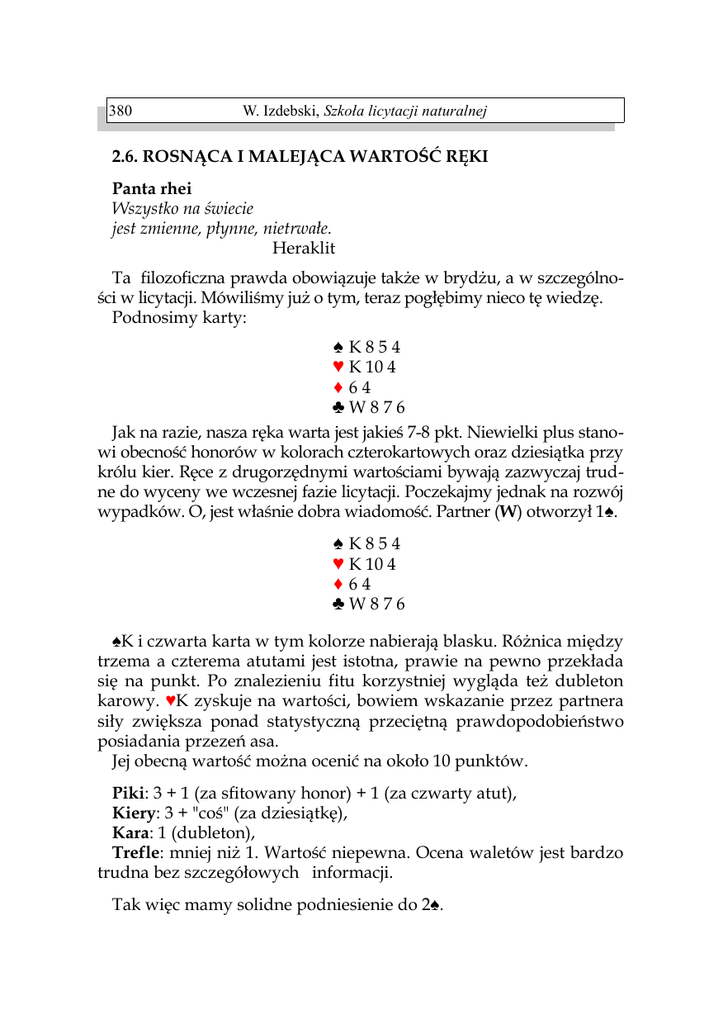 380 W. Izdebski, Szkoła licytacji naturalnej 2.6. ROSNĄCA I MALEJĄCA WARTOŚĆ RĘKI Panta rhei Wszystko na świecie jest zmienne, płynne, nietrwałe. Heraklit Ta filozoficzna prawda obowiązuje także w brydżu, a w szczególno ści w licytacji. Mówiliśmy już o tym, teraz pogłębimy nieco tę wiedzę. Podnosimy karty: ♠ K854 ♥ K 10 4 ♦ 64 ♣W876 Jak na razie, nasza ręka warta jest jakieś 7-8 pkt. Niewielki plus stano wi obecność honorów w kolorach czterokartowych oraz dziesiątka przy królu kier. Ręce z drugorzędnymi wartościami bywają zazwyczaj trud ne do wyceny we wczesnej fazie licytacji. Poczekajmy jednak na rozwój wypadków. O, jest właśnie dobra wiadomość. Partner (W) otworzył 1♠. ♠ K854 ♥ K 10 4 ♦ 64 ♣W876 ♠K i czwarta karta w tym kolorze nabierają blasku. Różnica między trzema a czterema atutami jest istotna, prawie na pewno przekłada się na punkt. Po znalezieniu fitu korzystniej wygląda też dubleton karowy. ♥K zyskuje na wartości, bowiem wskazanie przez partnera siły zwiększa ponad statystyczną przeciętną prawdopodobieństwo posiadania przezeń asa. Jej obecną wartość można ocenić na około 10 punktów. Piki: 3 + 1 (za sfitowany honor) + 1 (za czwarty atut), Kiery: 3 + "coś" (za dziesiątkę), Kara: 1 (dubleton), Trefle: mniej niż 1. Wartość niepewna. Ocena waletów jest bardzo trudna bez szczegółowych informacji. Tak więc mamy solidne podniesienie do 2♠. Nasz System – Plus W 1♠ 3♥ E 2♠ ? ♠ ♥ ♦ ♣ 381 K854 K 10 4 64 W876 Teraz, gdy oba króle osiągają maksimum swych możliwości, z czy stym sumieniem powinniśmy licytować odgórną zapewne końców kę. Wprawdzie ocena dubletona karo i ♣W obniżyła się nieco, jednak przyrost wartości ♥K rekompensuje to z nawiązką. Obie ręce: ♠AW963 ♥AD76 ♦A95 ♣ 10 N W E S ♠K8 5 4 ♥ K 10 4 ♦64 ♣W 8 7 6 Przypuśćmy, że otwierający ma inną kartę i licytacja potoczyła się tak: W 1♠ 3♦ E 2♠ ? ♠ ♥ ♦ ♣ K854 K 10 4 64 W876 Po tej sekwencji precyzyjna ocena naszej ręki pozostaje nadal w kręgu hipotez. Nasze uzupełnienie pikowe jest znakomite, natomiast wartość ♥K w wyniku odzywki partnera nie wzrosła ani trochę. Inaczej rzecz się ma z dubletonem karo, który pomimo braku honorów, po zwala na przebicie ewentualnych przegrywających. Dzięki posiada niu przez nas czterech – a nie tylko trzech – pików, obrona nie będzie w stanie temu zapobiec wistami atutowymi. Ponadto mamy gwaran cję, że nasz dubel trafia do długości, a więc będzie co przebijać. Biorąc to wszystko pod uwagę, powinniśmy zdecydować się na 4♠ choć nie możemy być nawet w przybliżeniu tak pewni co do wyniku, jak po inwicie przez 3♥. Poprzestanie na 3♠ należy uznać za zacho wawcze, ale bez wątpienia nie pozbawione podstaw. W takich wątpliwych sytuacjach możemy niekiedy wykonać ruch pośredni i ostateczną decyzję oddać w ręce partnera licytując wtrąco 382 W. Izdebski, Szkoła licytacji naturalnej ne 3♥ – chciałbym a boję się. Niewątpliwie nasza karta zasługuje na coś więcej niż negatywne 3♠. W 1♠ 3♦ 4♣ E 2♠ 3♥ ? ♠ ♥ ♦ ♣ K854 K 10 4 64 W876 Co się dzieje? – Jesteśmy na poziomie końcówki, a partner nadal wymienia informacje. Jak rozumieć jego 4♣? – Oczywiście, jako cue-bid, zaproszenie do szlemika. Widocznie nasze 3♥ było dla partnera po zytywną informacją – wzmocniło jego kiery. Tak więc 4♣, w świetle dotychczasowej wymiany informacji, to niemal na pewno krótkość. Ale partner nadal nie jest pewien, czy szlemika należy licytować. Przerzuca więc "piłeczkę" na naszą stronę. Co teraz? Podstawowym zadaniem jest stwierdzenie, ile warta jest nasza ręka. Odpowiedź brzmi – DUŻO. Piki nadal oceniamy bardzo wysoko. Wartość ♥K osiąga praktycznie maksimum. Dubleton karowy pozostaje w cenie. Tylko ♣W utracił zupełnie wartość, jednak wobec pozostałych przyrostów utrata jednego punktu jest do zaniedbania. W ramach dotychczasowej licytacji, nasza karta jest maksymalna, a więc za proszenie do szlemika powinniśmy przyjąć. Obie ręce: ♠ A D 10 6 3 ♥AD6 ♦AK95 ♣5 N W E S ♠K8 5 4 ♥ K 10 4 ♦64 ♣W 8 7 6 Przydzielmy otwierającemu jeszcze inną kartę, licytacja biegnie: W 1♠ 3♣ E 2♠ ? ♠ ♥ ♦ ♣ K854 K 10 4 64 W876 Nasz System – Plus 383 Wreszcie pełnej mocy nabrał walet trefl. Także długość treflowa wzmacnia nasz bilans – pojawia się lewa na fortę trefl. Natomiast maleje wartość czwartego pika, gdyż może się zdarzyć, że wykonanie przebitki w stole nie będzie wręcz możliwe, wszystko zależy od rozkładu ilo ściowego kolorów czerwonych otwierającego. Z tych samych powodów wartość dubletona karo trudna jest do określenia. Proszę zauważyć, że jeśli partner ma trzy kara, to wartość naszego dubletona karo nabiera mocy, ale zdecydowanie traci na wartości ♥K, który trafia wtedy do sin gla. Oczywiście najlepiej byłoby, gdyby otwierający miał singla karo, ale statystycznie jest to przypadek najmniej prawdopodobny. Nie robi też żadnych nadziei ♥10. Zdecydowanie chcielibyśmy ją przenieść do trefli. Tak więc nasza ręka, w świetle dotychczasowej licytacji, nie należy do minimalnych, ale nie daje też wystarczających podstaw, by prze sądzić z nią końcówkę. Dajmy jeszcze szansę partnerowi, licytując wyczekujące 3♥. Obie ręce: ♠ A D 10 7 3 ♥3 ♦DW8 ♣AD73 N W E S ♠K8 5 4 ♥ K 10 4 ♦64 ♣W 8 7 6 Proszę zauważyć, że gdyby otwierający zamiast ♦DWx miał ♦Kxx, końcówka byłaby niezłym kontraktem. Ale wtedy W wyżej oceniłby swoją kartę i po naszej akceptacji(!) warunkowej 3♥, być może zgłosiłby 4♠. Stąd wypływa kolejny wniosek, iż w kolorach krótkich figury niskie warte są mniej. Zobacz jeszcze, jak zasadniczo podniosłoby siłę połączonych rąk przeniesienie ♥10 do trefli. Znacznie większe przewartościowania siły rąk występu