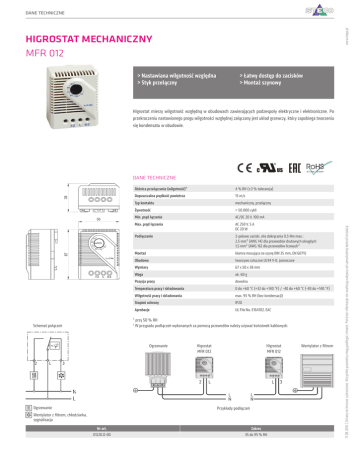 61 REGULACJA www.stego.pl KATALOG PRODUKTÓW STEGO DANE TECHNICZNE HIGROSTAT MECHANICZNY MFR 012 >>Nastawiana wilgotność względna >>Styk przełączny >>Łatwy dostęp do zacisków >>Montaż szynowy Higrostat mierzy wilgotność względną w obudowach zawierających podzespoły elektryczne i elektroniczne. Po przekroczeniu nastawionego progu wilgotności względnej załączany jest układ grzewczy, który zapobiega tworzeniu się kondensatu w obudowie. Różnica przełączania (wilgotność)¹ 4 % RH (±3 % tolerancja) Dopuszczalna prędkość powietrza 15 m/s Typ kontaktu mechaniczny, przełączny Żywotność > 50.000 cykli Min. prąd łączenia AC/DC 20 V, 100 mA Max. prąd łączenia AC 250 V, 5 A DC 20 W Podłączenie 3-polowe zaciski, siła dokręcania 0,5 Nm max.: 2,5 mm² (AWG 14) dla przewodów drutowych okrągłych 1,5 mm² (AWG 16) dla przewodów licowych² Montaż klamra mocująca na szynę DIN 35 mm, EN 60715 Obudowa tworzywo sztuczne UL94 V-0, jasnoszare Wymiary 67 x 50 x 38 mm Waga ok. 60 g Pozycja pracy dowolna Temperatura pracy i składowania 0 do +60 °C (+32 do +140 °F) / -40 do +60 °C (-40 do +140 °F) Wilgotność pracy i składowania max. 95 % RH (bez kondensacji) Stopień ochrony IP20 Aprobacje UL File No. E164102, EAC ¹ przy 50 % RH 2 W przypadu podłączeń wykonanych za pomocą przewodów należy używać końcówek kablowych. Schemat połączeń Ogrzewanie Ogrzewanie Higrostat MFR 012 Higrostat MFR 012 Przykłady podłączeń Wentylator z filtrem, chłodziarka, sygnalizacja Nr art. Zakres 01220.0-00 35 do 95 % RH Wentylator z filtrem 11.08.2016 | Zmiany techniczne zastrzeżone. Wszystkie parametry mogą podlegać zmianie. Poniższe informacje nie zwalniają nabywcy od samodzielnej kontroli instalacji. DANE TECHNICZNE