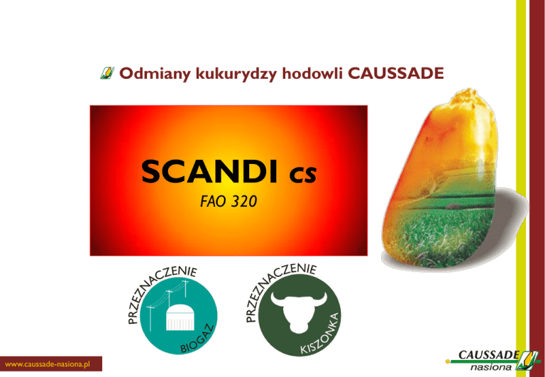 Odmiany kukurydzy hodowli CAUSSADE SCANDI cs FAO 320 www.caussade-nasiona.pl SCANDI cs FAO 320 Przeznaczenie: biogaz wysokiej jakości kiszonka Morfologia i genetyka: mieszaniec pojedynczy ziarno typu dent wysokie rośliny o mocnej budowie Zalecana obsada roślin: gleby ciężkie: 85 000 tys./ha gleby średnie : 80 000 tys./ha gleby lekkie: 75 000 tys./ha Wymagania glebowe: polecana do uprawy na wszystkich kompleksach glebowych, także na glebach lekkich utrzymanych w dobrej kulturze rolnej www.caussade-nasiona.pl SCANDI cs FAO 320 Zalety: Wysokoproduktywna odmiana z grupy późnej przeznaczona do uprawy na kiszonkę oraz biogaz. Wysokie, bogato ulistnione rośliny o dobrych parametrach kiszonkowych (wysoki udział ziarna i dobra strawność włókien). Odmiana o wysokim ogólnym plonie świeżej i suchej masy z hektara. Rośliny o przedłużonej zieloność liści (efekt stay green) co stwarza możliwość wydłużenia daty zbioru. Rośliny o wysokiej zdrowotności i wysokiej tolerancji na głownię. www.caussade-nasiona.pl SCANDI cs FAO 320 WYNIKI PLONOWANIA 2013 rok: plon ogólny świeżej masy = 715,0 dt/ha plon ogólny suchej masy = 217,5 dt/ha w doświadczeniach Strips Trial Station (doświadczenia ścisłe) na kiszonkę Karmin, woj. wielkopolskie www.caussade-nasiona.pl SCANDI cs FAO 320 WYNIKI PLONOWANIA 2014 rok: plon ziarna 111,9 dt/ha przy 14% wody w doświadczeniach Strips Trial Station (doświadczenia ścisłe) na ziarno Wityń, woj. lubuskie www.caussade-nasiona.pl