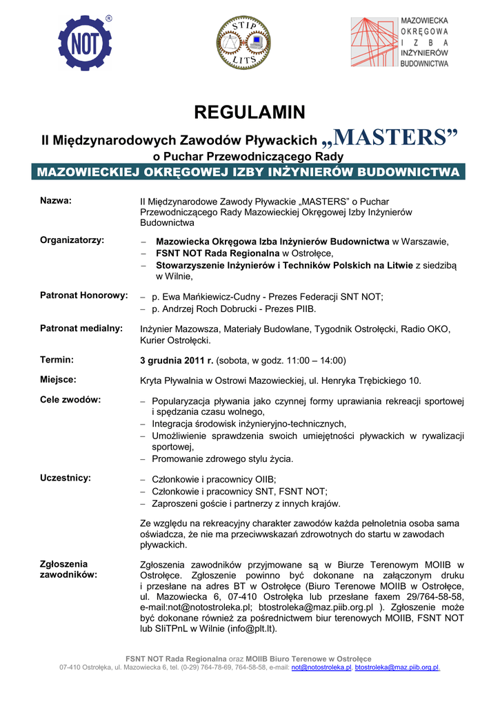 REGULAMIN II Międzynarodowych Zawodów Pływackich „MASTERS” o Puchar Przewodniczącego Rady MAZOWIECKIEJ OKRĘGOWEJ IZBY INŻYNIERÓW BUDOWNICTWA Nazwa: II Międzynarodowe Zawody Pływackie „MASTERS” o Puchar Przewodniczącego Rady Mazowieckiej Okręgowej Izby Inżynierów Budownictwa Organizatorzy: Patronat Honorowy: p. Ewa Mańkiewicz-Cudny - Prezes Federacji SNT NOT; p. Andrzej Roch Dobrucki - Prezes PIIB. Patronat medialny: Inżynier Mazowsza, Materiały Budowlane, Tygodnik Ostrołęcki, Radio OKO, Kurier Ostrołęcki. Termin: 3 grudnia 2011 r. (sobota, w godz. 11:00 – 14:00) Miejsce: Kryta Pływalnia w Ostrowi Mazowieckiej, ul. Henryka Trębickiego 10. Cele zwodów: Popularyzacja pływania jako czynnej formy uprawiania rekreacji sportowej i spędzania czasu wolnego, Integracja środowisk inżynieryjno-technicznych, Umożliwienie sprawdzenia swoich umiejętności pływackich w rywalizacji sportowej, Promowanie zdrowego stylu życia. Uczestnicy: Członkowie i pracownicy OIIB; Członkowie i pracownicy SNT, FSNT NOT; Zaproszeni goście i partnerzy z innych krajów. Mazowiecka Okręgowa Izba Inżynierów Budownictwa w Warszawie, FSNT NOT Rada Regionalna w Ostrołęce, Stowarzyszenie Inżynierów i Techników Polskich na Litwie z siedzibą w Wilnie, Ze względu na rekreacyjny charakter zawodów każda pełnoletnia osoba sama oświadcza, że nie ma przeciwwskazań zdrowotnych do startu w zawodach pływackich. Zgłoszenia zawodników: Zgłoszenia zawodników przyjmowane są w Biurze Terenowym MOIIB w Ostrołęce. Zgłoszenie powinno być dokonane na załączonym druku i przesłane na adres BT w Ostrołęce (Biuro Terenowe MOIIB w Ostrołęce, ul. Mazowiecka 6, 07-410 Ostrołęka lub przesłane faxem 29/764-58-58, e-mail:[email protected]; [email protected] ). Zgłoszenie może być dokonane również za pośrednictwem biur terenowych MOIIB, FSNT NOT lub SIiTPnL w Wilnie ([email protected]). FSNT NOT Rada Regionalna oraz MOIIB Biuro Terenowe w Ostrołęce 07-410 Ostrołęka, ul. Mazowiecka 6, tel. (0-29) 764-78-69, 764-58-58, e-mail: [email protected], [email protected]. Zgłoszenia przyjmowane są do dnia 29 listopada 2011 r. Wpisowe: Udział w zawodach jest bezpłatny Dyscypliny: Zawody w kategorii Kobiet i Mężczyzn z podziałem na wiek (co 10 lat). 25 m stylem dowolnym kobiet i mężczyzn 25 m stylem klasycznym kobiet i mężczyzn 25 m stylem grzbietowym mężczyzn 50 m stylem dowolnym kobiet i mężczyzn 50 m stylem klasycznym kobiet i mężczyzn 1. 2. 3. 4. 5. 1. Sztafeta w kategorii kobiet i mężczyzn / mix: 4 x 25 m stylem dowolnym Sztafety reprezentacji: Okręgowych IIB oraz BT Ciechanów, BT Ostrołęka, BT Płock, BT Radom, BT Siedlce, Biura MOIIB w Warszawie, SIiTPnL, FSNT NOT, partnerów zagranicznych – o Puchar Przewodniczącego Rady MOIIB. Na zakończenie spotkanie integracyjne. Komisja sędziowska: Nagrody: Zawodnicy otrzymują dyplomy za zajęcie pierwszych 3 miejsc. Puchar Przewodniczącego Rady MOIIB otrzymuje zwycięska sztafeta. Program zawodów i sprawy związane z zawodami: godz. 10:30 - zbiórka zawodników w hollu basenu godz. 11:00 - rozpoczęcie zawodów Rozgrzewka zawodników na małym basenie (na wyznaczonych torach) – 15 minut przed startem Jedna osoba może startować w max. 2 kategoriach plus sztafeta, Kategorie wiekowe: A - do 30 l.; B - 31-40 l.; C – 41-50 l.; D – 51-60 l.; E - powyżej 60 l. Wręczanie dyplomów w trakcie trwania zawodów. Postanowienia końcowe: Gościom oraz kibicom zawodniczek i zawodników będą udostępnione trybuny. Ilość miejsc ograniczona. O zakwalifikowaniu zawodnika decyduje kolejność zgłoszeń. Regulamin zawodów będzie wywieszony w hollu głównym basenu oraz będzie dostępny na stronach internetowych www.maz.piib.org.pl; www.notostroleka.pl; plt.lt.. W sprawach spornych lub nie objętych regulaminem decyduje kierownik zawodów i sędzia główny. Komisja ds. dekoracji, Kierownik zawodów, Sędzia główny zawodów, Sędziowie mierzący czas (torowi), Biuro zawodów (protokolant). W imieniu Zarządu W imieniu Prezydium Prezes Zarządu /-/ mgr inż. Wojciech Zając Przewodniczący Rady /-/ inż. Mieczysław Grodzki FEDERACJA STOWARZYSZEŃ NAUKOWO-TECHNICZNYCH NOT MAZOWIECKA OKRĘGOWA IZBA INŻYNIERÓW BUDOWNICTWA Rada Regionalna w Ostrołęce, 07-410 Ostrołęka, ul. Mazowiecka 6, tel. 764-58-58, fax. 764-34-42, kier. 0-29, www.notostroleka.pl, e-mail:[email protected] w Warszawie, ul. 1 Sierpnia 36 B, 02-134 Warszawa tel. (22) 868-35-35, (22) 868-35-81, (22) 868-35-82, fax. (22) 868-35-49, e-mail: [email protected] 2 MOIIB Biuro Terenowe w Ostrołęce 07-410 Ostrołęka, ul. Mazowiecka 6, tel. (0-29) 764-78-69, 764-58-58, e-mail: [email protected], skype: bt.ostroleka.moiib 3 MOIIB Biuro Terenowe w Ostrołęce 07-410 Ostrołęka, ul. Mazowiecka 6, tel. (0-29) 764-78-69, 764-58-58, e-mail: [email protected], skype: bt.ostroleka.moiib