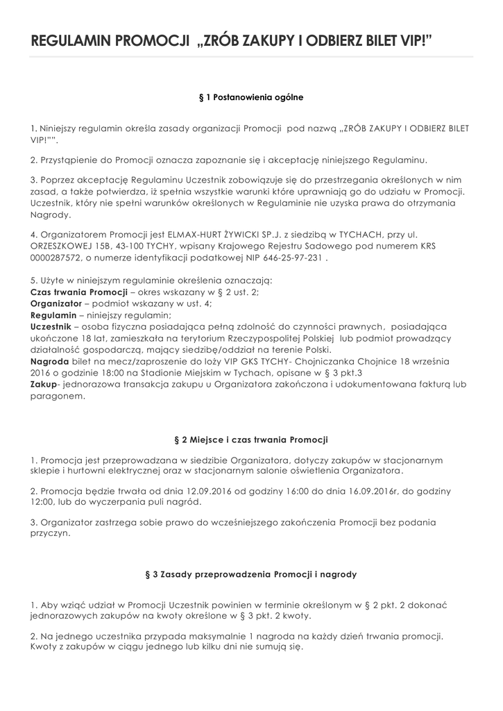 REGULAMIN PROMOCJI „ZRÓB ZAKUPY I ODBIERZ BILET VIP!” § 1 Postanowienia ogólne 1. Niniejszy regulamin określa zasady organizacji Promocji pod nazwą „ZRÓB ZAKUPY I ODBIERZ BILET VIP!””. 2. Przystąpienie do Promocji oznacza zapoznanie się i akceptację niniejszego Regulaminu. 3. Poprzez akceptację Regulaminu Uczestnik zobowiązuje się do przestrzegania określonych w nim zasad, a także potwierdza, iż spełnia wszystkie warunki które uprawniają go do udziału w Promocji. Uczestnik, który nie spełni warunków określonych w Regulaminie nie uzyska prawa do otrzymania Nagrody. 4. Organizatorem Promocji jest ELMAX-HURT ŻYWICKI SP.J. z siedzibą w TYCHACH, przy ul. ORZESZKOWEJ 15B, 43-100 TYCHY, wpisany Krajowego Rejestru Sadowego pod numerem KRS 0000287572, o numerze identyfikacji podatkowej NIP 646-25-97-231 . 5. Użyte w niniejszym regulaminie określenia oznaczają: Czas trwania Promocji – okres wskazany w § 2 ust. 2; Organizator – podmiot wskazany w ust. 4; Regulamin – niniejszy regulamin; Uczestnik – osoba fizyczna posiadająca pełną zdolność do czynności prawnych , posiadająca ukończone 18 lat, zamieszkała na terytorium Rzeczypospolitej Polskiej lub podmiot prowadzący działalność gospodarczą, mający siedzibę/oddział na terenie Polski. Nagroda bilet na mecz/zaproszenie do loży VIP GKS TYCHY- Chojniczanka Chojnice 18 września 2016 o godzinie 18:00 na Stadionie Miejskim w Tychach, opisane w § 3 pkt.3 Zakup- jednorazowa transakcja zakupu u Organizatora zakończona i udokumentowana fakturą lub paragonem. § 2 Miejsce i czas trwania Promocji 1. Promocja jest przeprowadzana w siedzibie Organizatora, dotyczy zakupów w stacjonarnym sklepie i hurtowni elektrycznej oraz w stacjonarnym salonie oświetlenia Organizatora . 2. Promocja będzie trwała od dnia 12.09.2016 od godziny 16:00 do dnia 16.09.2016r, do godziny 12:00, lub do wyczerpania puli nagród. 3. Organizator zastrzega sobie prawo do wcześniejszego zakończenia Promocji bez podania przyczyn. § 3 Zasady przeprowadzenia Promocji i nagrody 1. Aby wziąć udział w Promocji Uczestnik powinien w terminie określonym w § 2 pkt. 2 dokonać jednorazowych zakupów na kwoty określone w § 3 pkt. 2 kwoty. 2. Na jednego uczestnika przypada maksymalnie 1 nagroda na każdy dzień trwania promocji. Kwoty z zakupów w ciągu jednego lub kilku dni nie sumują się. 3. Nagrodami w promocji są odpowiednio: VIP- Zakupy powyżej 500 zł brutto jednorazowo zaproszenie dla 1 osoby na mecz GKS Tychy- Chojniczanka Chojnice w niedzielę 18.09.2016 o godzinie 18:00 na sektor VIP Tyskiego Stadionu Miejskiego. Super VIP 1- Zakupy powyżej 1500 zł brutto jednorazowo zaproszenie dla 1 osoby na mecz GKS Tychy- Chojniczanka Chojnice w niedzielę 18.09.2016 o godzinie 18:00 do loży VIP ELMAX na Tyskim Stadionie Miejskim , z darmowym poczęstunkiem w trakcie meczu. Super VIP 2- Zakupy powyżej 3000 zł brutto jednorazowo zaproszenie dla 2 osób na mecz GKS Tychy- Chojniczanka Chojnice w niedzielę 18.09.2016 o godzinie 18:00 do loży VIP ELMAX na Tyskim Stadionie Miejskim , z darmowym poczęstunkiem w trakcie meczu. 4. O przyznawaniu nagród decyduje kolejność zgłoszeń. Zgłoszenia dokonuje się za pomocą formularza dostępnego u handlowców. Prawidłowo wypełniony formularz Uczestnik składa u handlowca, który informuje Uczestnika o możliwości odbioru nagrody. 5. Uczestnik przystępując do promocji oświadcza, że: 1) 2) 3) 4) zapoznał się z Regulaminem i akceptuje go; spełnia warunki określone Regulaminem; wyraża zgodę na kontakt drogą telefoniczną i elektroniczną ze strony Organizatora; wyraża zgodę na przetwarzanie danych osobowych. 6. Nagrody można odbierać w siedzibie Organizatora w piątek 16.09.2016 od godziny 12:30 do 18:00 oraz przed rozpoczęciem meczu na Stadionie Miejskim w Tychach 18.09.2016 od godziny 17:00 (po wcześniejszym uzgodnieniu z Organizatorem). 6. Organizator zastrzega sobie prawo do wykluczenia z Promocji Uczestnika w każdym czasie, jeżeli Uczestnik naruszy warunki udziału w Promocji określone w Regulaminie lub nieprawidłowo wypełni formularz zgłoszeniowy. 7. Nie ma możliwości wymiany nagrody na jej równowartość pieniężną, ani na towary handlowe znajdujące się w ofercie handlowej Organizatora Promocji. 8. Uczestnik może zrezygnować z przyjęcia nagrody. Jest możliwość przenie sienia nagrody na osoby trzecie, po indywidualnym ustaleniu z Organizatorem. 9. Uczestnik traci prawo do nagrody, jeśli w podanym przez Organizatora terminie nie odbierze nagrody. 10. Jeżeli Uczestnik nie może skorzystać z zaproszenia Super VIP 1 i Super VIP 2 - zaproszenie do loży ELMAX może zostać przełożone na inny termin po indywidualnym uzgodnieniu z Organizatorem. W przypadku zaproszenia na sektor VIP nie ma takiej możliwości. § 5 Ochrona danych osobowych 1. Imiona, nazwiska oraz inne dane Uczestników Promocji niezbędne do wydania nagrody będą przekazywane Organizatorowi drogą pisemną i będą one przetwarzane w celu przeprowadzenia Promocji oraz przyznania i wydania nagród. Każdy Uczestnik biorąc udział w Promocji, wyraża jednocześnie zgodę na przetwarzanie wymienionych danych przez Organizatora w powyżej wskazanym zakresie. 2. Dane osobowe Uczestników są gromadzone i przetwarzane zgodnie z ustawą o ochronie danych osobowych (tj. Dz. U. z 2002 r., nr 101, poz. 926 ze zm .)oraz ustawą o bezpieczeństwie imprez masowych (t.j. Dz. U. z 2013 r. poz. 611, 628, 829, z 2014 r.poz. 693, z 2015 r. poz. 1707.). Uczestnik jest uprawniony w każdym czasie do uzyskania dostępu do treści swoich danych osobowych, o których mowa powyżej, a także do wprowadzania w nich zmian zgodnie z ustawą o ochronie danych osobowych. Podanie danych jest dobrowolne, lecz konieczne dla uzyskania nagrody w Promocji. § 7 Postanowienia końcowe 1. Regulamin Promocji jest dostępny na stronie www.elmax-hurt.pl przez cały okres trwania Promocji, z zastrzeżeniem 