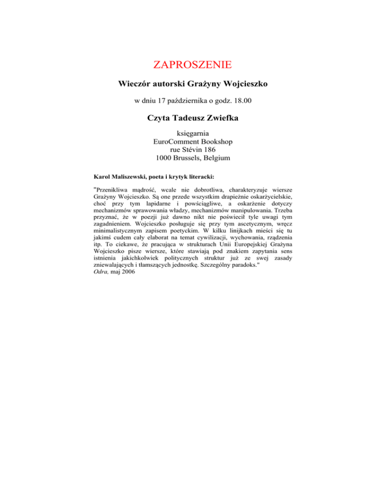 ZAPROSZENIE Wieczór autorski Grażyny Wojcieszko w dniu 17 października o godz. 18.00 Czyta Tadeusz Zwiefka księgarnia EuroComment Bookshop rue Stévin 186 1000 Brussels, Belgium Karol Maliszewski, poeta i krytyk literacki: "Przenikliwa mądrość, wcale nie dobrotliwa, charakteryzuje wiersze Grażyny Wojcieszko. Są one przede wszystkim drapieżnie oskarżycielskie, choć przy tym lapidarne i powściągliwe, a oskarżenie dotyczy mechanizmów sprawowania władzy, mechanizmów manipulowania. Trzeba przyznać, że w poezji już dawno nikt nie poświecił tyle uwagi tym zagadnieniem. Wojcieszko posługuje się przy tym ascetycznym, wręcz minimalistycznym zapisem poetyckim. W kilku linijkach mieści się tu jakimś cudem cały elaborat na temat cywilizacji, wychowania, rządzenia itp. To ciekawe, że pracująca w strukturach Unii Europejskiej Grażyna Wojcieszko pisze wiersze, które stawiają pod znakiem zapytania sens istnienia jakichkolwiek politycznych struktur już ze swej zasady zniewalających i tłamszących jednostkę. Szczególny paradoks." Odra, maj 2006 Urodzona w 1957, od wielu lat mieszka na przemian w Brukseli i w Krzywogońcu (Bory Tucholskie). Bodźcem do tworzenia stał się dla niej kontakt z czołowymi postaciami emigracji paryskiej w okresie stanu wojennego. . Zadebiutowała zborem liryki osobistej W oczekiwaniu (Warszawa 2000). Drugi tomik Karuzela (Kraków 2005) jest poezją zaangażowaną. Jej utwory, nagradzane, zamieszczane były w konkursowych almanachach, w periodykach literackich w kraju i za granica między innymi w: „Arkuszu”, „Akancie”, „Poezji dzisiaj”, „Listach z daleka” i w antologii „Pretekst”. Publikuje je także regularnie w Internecie Pochodzi z Bydgoszczy, tam otrzymała pierwszy dyplom, następne dwa już we Francji, w dziedzinach zbliżonych do teoretycznej informatyki. Jest absolwentką Studium Artystyczno-Literackiego Uniwersytetu Jagiellońskiego, polskiej szkoły „creative writing”. Pracowała naukowo i wykładała w Ecole Centrale de Paris we Francji i na Uniwersytecie Berkeley w USA. Obecnie pracuje w Komisji Europejskiej w Brukseli.