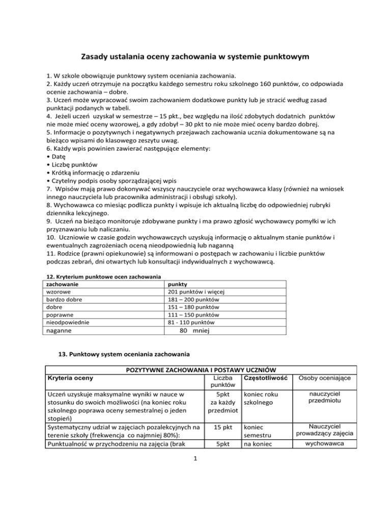Zasady ustalania oceny zachowania w systemie punktowym 1. W szkole obowiązuje punktowy system oceniania zachowania. 2. Każdy uczeń otrzymuje na początku każdego semestru roku szkolnego 160 punktów, co odpowiada ocenie zachowania – dobre. 3. Uczeń może wypracować swoim zachowaniem dodatkowe punkty lub je stracić według zasad punktacji podanych w tabeli. 4. Jeżeli uczeń uzyskał w semestrze – 15 pkt., bez względu na ilość zdobytych dodatnich punktów nie może mieć oceny wzorowej, a gdy zdobył – 30 pkt to nie może mieć oceny bardzo dobrej. 5. Informacje o pozytywnych i negatywnych przejawach zachowania ucznia dokumentowane są na bieżąco wpisami do klasowego zeszytu uwag. 6. Każdy wpis powinien zawierać następujące elementy: • Datę • Liczbę punktów • Krótką informację o zdarzeniu • Czytelny podpis osoby sporządzającej wpis 7. Wpisów mają prawo dokonywać wszyscy nauczyciele oraz wychowawca klasy (również na wniosek innego nauczyciela lub pracownika administracji i obsługi szkoły). 8. Wychowawca co miesiąc podlicza punkty i wpisuje ich aktualną liczbę do odpowiedniej rubryki dziennika lekcyjnego. 9. Uczeń na bieżąco monitoruje zdobywane punkty i ma prawo zgłosić wychowawcy pomyłki w ich przyznawaniu lub naliczaniu. 10. Uczniowie w czasie godzin wychowawczych uzyskują informację o aktualnym stanie punktów i ewentualnych zagrożeniach oceną nieodpowiednią lub naganną 11. Rodzice (prawni opiekunowie) są informowani o postępach w zachowaniu i liczbie punktów podczas zebrań, dni otwartych lub konsultacji indywidualnych z wychowawcą. 12. Kryterium punktowe ocen zachowania zachowanie wzorowe bardzo dobre dobre poprawne nieodpowiednie naganne punkty 201 punktów i więcej 181 – 200 punktów 151 – 180 punktów 111 – 150 punktów 81 - 110 punktów 80 mniej 13. Punktowy system oceniania zachowania POZYTYWNE ZACHOWANIA I POSTAWY UCZNIÓW Kryteria oceny Liczba punktów Uczeń uzyskuje maksymalne wyniki w nauce w stosunku do swoich możliwości (na koniec roku szkolnego poprawa oceny semestralnej o jeden stopień) Systematyczny udział w zajęciach pozalekcyjnych na terenie szkoły (frekwencja co najmniej 80%): Punktualność w przychodzeniu na zajęcia (brak 1 Częstotliwość 5pkt koniec roku za każdy szkolnego przedmiot 15 pkt 5pkt koniec semestru na koniec Osoby oceniające nauczyciel przedmiotu Nauczyciel prowadzący zajęcia wychowawca spóźnień): Wzorowa frekwencja semestralna: brak nieobecności Regularne wypożyczanie książek z biblioteki ( 2 w miesiącu): Rzetelne wywiązywanie się z obowiązków powierzonych lub przyjętych. aktywne pełnienie 10pkt 10 pkt miesiąca na koniec miesiąca na koniec semestru 5pkt wychowawca Nauczyciel bibliotekarz Wychowawca każdorazowao funkcji dyżurnego Brak negatywnych uwag w ciągu miesiąca: 5pkt Aktywny udział w pracy samorządu szkolnego w czasie pozalekcyjnym: Aktywny udział w pracy samorządu klasowego w czasie pozalekcyjnym: Prace na rzecz klasy i szkoły (np. wykonanie gazetki, dekoracji, obsługa sprzętu muzycznego, reprezentowanie klasy na uroczystościach, imprezach okolicznościowych, itp. ) w czasie pozalekcyjnym: Pomoc w świetlicy, bibliotece przy organizacji imprez w czasie pozalekcyjnym Dobrowolna pomoc nauczycielowi ( np. w porządkowaniu klasy) w czasie pozalekcyjnym : Pomoc koleżeńska, podczas zajęć zorganizowanych (konsultacji, zajęć świetlicowych): w czasie pozalekcyjnym Okazywanie pomocy słabszym, niepełnosprawnym, podejmowanie działań humanitarnych, wolontariat: Czynne przeciwstawianie się przejawom wulgarności i brutalności (aktywne reagowanie na wszelkie objawy zła, krytyka negatywnych zachowań wulgarnego słownictwa uczniów ) Laureat konkursu przedmiotowego: 10pkt na koniec miesiąca każdorazowo 10 pkt każdorazowo Wychowawca 5/10 pkt każdorazowo Nauczyciel, opiekun aktywności uczniów; wychowawca każdorazowo Nauczyciel 10 pkt 5/15pkt każdorazowo Nauczyciel 5pkt każdorazowo nauczyciele 10 pkt każdorazowo nauczyciele 20 pkt każdorazowo nauczyciele 80pkt każdorazowo Nauczyciel przedmiotu Finalista konkursu przedmiotowego: 50pkt każdorazowo nauczyciel przedmiotu Udział w etapie rejonowym konkursu przedmiotowego 20 pkt każdorazowo Nauczyciel przedmiotu Udział w etapie szkolnym konkursu przedmiotowego 10 pkt każdorazowo nauczyciel przedmiotu Zakwalifikowanie się do udziału w konkursie, zawodach sportowych o zasięgu wojewódzkim I miejsce w konkursie ogólnopolskim II, III miejsce w konkursie ogólnopolskim Wyróżnienie w konkursie ogólnopolskim I miejsce lub wyróżnienie w konkursie o zasięgu rejonowym, powiatowym, gminnym, miejskim 30pkt każdorazowo Organizator eliminacji 100pkt 80pkt 50pkt 30pkt każdorazowo każdorazowo każdorazowo każdorazowo Nauczyciel- opiekun Nauczyciel- opiekun Nauczyciel- opiekun Nauczyciel- opiekun 20pkt każdorazowo Nauczyciel- opiekun II, III miejsce lub wyróżnienie w konkursie o zasięgu 2 Wychowawca Nauczyciel opiekun Samorządu rejonowym, powiatowym, gminnym, miejskim Udział w konkursie o zasięgu rejonowym, powiatowym, gminnym, miejskim I miejsce w konkursie szkolnym II, III miejsce lub wyróżnienie w konkursie szkolnym: Udział w eliminacjach szkolnych konkursów o zasięgu wyższym niż szkolny Udział w konkursie o zasięgu wyższym niż szkolny „ogólnodostępnym” Udział w konkursie wiedzy sportowej: I miejsce, II miejsce, III miejsce – w konkursie wiedzy sportowej: Udział w zawodach sportowych na szczeblu miejskim: I i II miejsce w tych zawodach Udział w zawodach sportowych na szczeblu powiatowym: I miejsce ,II miejsce , III miejsce odpowiednio Udział w zawodach sportowych na szczeblu międzypowiatowym: I miejsce – 30pkt; II miejsce – 25pkt; III miejsce – 20pkt Udział w szkolnych zawodach sportowych: każdorazowo I miejsce – 5pkt; II miejsce – 4pkt; III miejsce – 3pkt Udział w zawodach sportowo – rekreacyjnych Inne pozytywne formy aktywności 