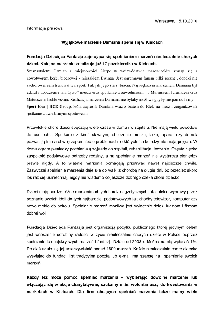 Warszawa, 15.10.2010 Informacja prasowa Wyjątkowe marzenie Damiana spełni się w Kielcach Fundacja Dziecięca Fantazja zajmująca się spełnianiem marzeń nieuleczalnie chorych dzieci. Kolejne marzenie zrealizuje już 17 października w Kielcach. Szesnastoletni Damian z miejscowości Sierpc w województwie mazowieckim zmaga się z nowotworem kości biodrowej - mięsakiem Ewinga. Jest ogromnym fanem piłki ręcznej, dopóki nie zachorował sam trenował ten sport. Tak jak jego starsi bracia. Największym marzeniem Damiana był udział i zobaczenie „na żywo” meczu oraz spotkanie z zawodnikami: z Mariuszem Jurasikiem oraz Mateuszem Jachlewskim. Realizacja marzenia Damiana nie byłaby możliwa gdyby nie pomoc firmy Sport Idea | HCE Group, która zaprosiła Damiana wraz z bratem do Kielc na mecz i zorganizowała spotkanie z uwielbianymi sportowcami. Przewlekle chore dzieci spędzają wiele czasu w domu i w szpitalu. Nie mają wielu powodów do uśmiechu. Spotkanie z kimś sławnym, obejrzenie meczu, lalka, aparat czy domek pozwalają im na chwilę zapomnieć o problemach, o których ich koledzy nie mają pojęcia. W domu ogrom pieniędzy pochłaniają wyjazdy do szpitali, rehabilitacja, leczenie. Często ciężko zaspokoić podstawowe potrzeby rodziny, a na spełnianie marzeń nie wystarcza pieniędzy prawie nigdy. A to właśnie marzenia pomagają przetrwać nawet najcięższe chwile. Zazwyczaj spełnienie marzenia daje siłę do walki z chorobą na długie dni, bo przecież skoro los raz się uśmiechnął, nigdy nie wiadomo co jeszcze dobrego czeka chore dziecko. Dzieci mają bardzo różne marzenia od tych bardzo egzotycznych jak dalekie wyprawy przez poznanie swoich idoli do tych najbardziej podstawowych jak choćby telewizor, komputer czy nowe meble do pokoju. Spełnianie marzeń możliwe jest wyłącznie dzięki ludziom i firmom dobrej woli. Fundacja Dziecięca Fantazja jest organizacją pożytku publicznego której jedynym celem jest wnoszenie odrobiny radości w życie nieuleczalnie chorych dzieci w Polsce poprzez spełnianie ich najskrytszych marzeń i fantazji. Działa od 2003 r. Można na nią wpłacać 1%. Do dziś udało się jej urzeczywistnić ponad 1800 marzeń. Każde nieuleczalnie chore dziecko wysyłając do fundacji list tradycyjną pocztą lub e-mail ma szansę na spełnienie swoich marzeń. Każdy też może pomóc spełniać marzenia – wybierając dowolne marzenie lub włączając się w akcje charytatywne, szukamy m.in. wolontariuszy do kwestowania w marketach w Kielcach. Dla firm chcących spełniać marzenia także mamy wiele propozycji współpracy, m.in. możliwość wsparcia nas poprzez zakup kartek świątecznych zaprojektowanych przez podopiecznych Fundacji Dziecięca Fantazja. Każda złotówka się liczy i każdy gest pomaga nam spełnić marzenia. Więcej o tym, co robi fundacja na www.f-df.pl