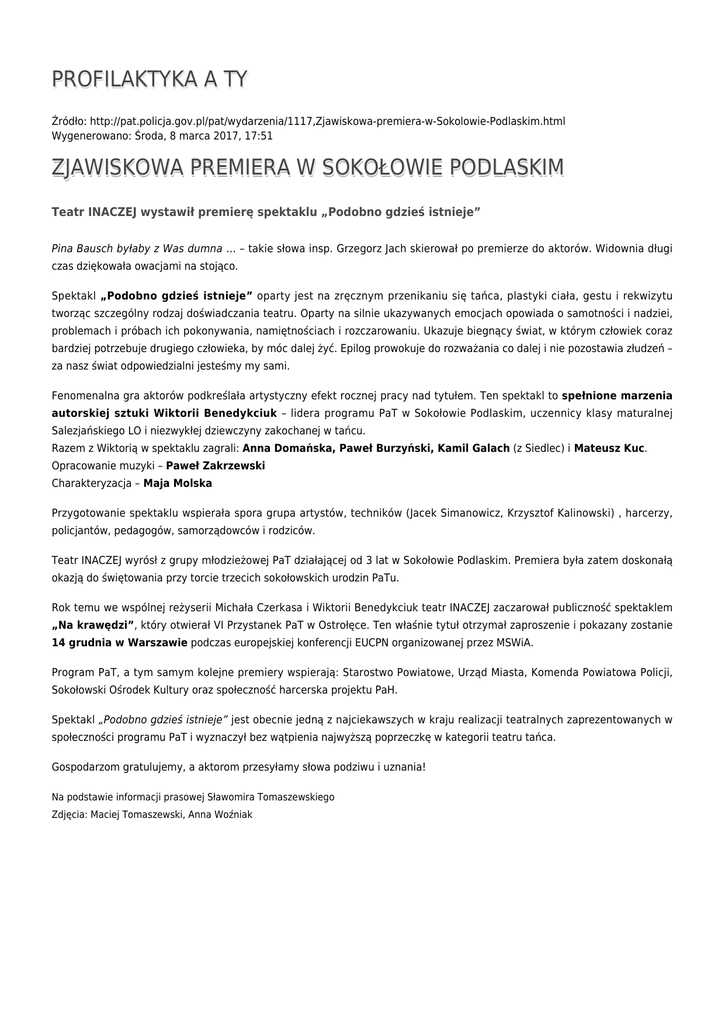 PROFILAKTYKA A TY Źródło: http://pat.policja.gov.pl/pat/wydarzenia/1117,Zjawiskowa-premiera-w-Sokolowie-Podlaskim.html Wygenerowano: Środa, 8 marca 2017, 17:51 ZJAWISKOWA PREMIERA W SOKOŁOWIE PODLASKIM Teatr INACZEJ wystawił premierę spektaklu „Podobno gdzieś istnieje” Pina Bausch byłaby z Was dumna … – takie słowa insp. Grzegorz Jach skierował po premierze do aktorów. Widownia długi czas dziękowała owacjami na stojąco. Spektakl „Podobno gdzieś istnieje” oparty jest na zręcznym przenikaniu się tańca, plastyki ciała, gestu i rekwizytu tworząc szczególny rodzaj doświadczania teatru. Oparty na silnie ukazywanych emocjach opowiada o samotności i nadziei, problemach i próbach ich pokonywania, namiętnościach i rozczarowaniu. Ukazuje biegnący świat, w którym człowiek coraz bardziej potrzebuje drugiego człowieka, by móc dalej żyć. Epilog prowokuje do rozważania co dalej i nie pozostawia złudzeń – za nasz świat odpowiedzialni jesteśmy my sami. Fenomenalna gra aktorów podkreślała artystyczny efekt rocznej pracy nad tytułem. Ten spektakl to spełnione marzenia autorskiej sztuki Wiktorii Benedykciuk – lidera programu PaT w Sokołowie Podlaskim, uczennicy klasy maturalnej Salezjańskiego LO i niezwykłej dziewczyny zakochanej w tańcu. Razem z Wiktorią w spektaklu zagrali: Anna Domańska, Paweł Burzyński, Kamil Galach (z Siedlec) i Mateusz Kuc. Opracowanie muzyki – Paweł Zakrzewski Charakteryzacja – Maja Molska Przygotowanie spektaklu wspierała spora grupa artystów, techników (Jacek Simanowicz, Krzysztof Kalinowski) , harcerzy, policjantów, pedagogów, samorządowców i rodziców. Teatr INACZEJ wyrósł z grupy młodzieżowej PaT działającej od 3 lat w Sokołowie Podlaskim. Premiera była zatem doskonałą okazją do świętowania przy torcie trzecich sokołowskich urodzin PaTu. Rok temu we wspólnej reżyserii Michała Czerkasa i Wiktorii Benedykciuk teatr INACZEJ zaczarował publiczność spektaklem „Na krawędzi”, który otwierał VI Przystanek PaT w Ostrołęce. Ten właśnie tytuł otrzymał zaproszenie i pokazany zostanie 14 grudnia w Warszawie podczas europejskiej konferencji EUCPN organizowanej przez MSWiA. Program PaT, a tym samym kolejne premiery wspierają: Starostwo Powiatowe, Urząd Miasta, Komenda Powiatowa Policji, Sokołowski Ośrodek Kultury oraz społeczność harcerska projektu PaH. Spektakl „Podobno gdzieś istnieje” jest obecnie jedną z najciekawszych w kraju realizacji teatralnych zaprezentowanych w społeczności programu PaT i wyznaczył bez wątpienia najwyższą poprzeczkę w kategorii teatru tańca. Gospodarzom gratulujemy, a aktorom przesyłamy słowa podziwu i uznania! Na podstawie informacji prasowej Sławomira Tomaszewskiego Zdjęcia: Maciej Tomaszewski, Anna Woźniak Ocena: 4.4/5 (5) Tweetnij