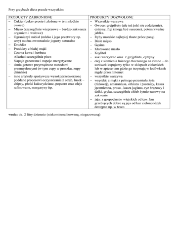 Przy grzybach dieta przede wszystkim PRODUKTY ZABRONIONE − Cukier (cukry proste i złożone w tym słodkie owoce) − Mięso (szczególnie wieprzowe – bardzo zakwasza organizm i wołowe) − Ograniczyć nabiał (mleko i jego przetwory np. sery) można ewentualnie jogurty naturalne − Drożdże − Produkty z białej mąki − Czarna kawa i herbata − Alkohol szczególnie piwo − Napoje gazowane i napoje energetyczne − dania gotowe przyrządzane metodami przemysłowymi (w tym zupy w proszku, zupy chińskie) − inne artykuły spożywcze wysokoprzetworzone poddane procesowi oczyszczania z otrąb, łusek – chipsy, płatki kukurydziane, popcorn oraz oleje rafinowane, margaryny itp. PRODUKTY DOZWOLONE − Wszystkie warzywa − Owoce: grejpfruty (ale też jeść nie codziennie), cytryny, figi (mogą być suszone), potem kwaśne jabłka. − Ryby morskie najlepiej tłuste prócz pangi − Białe mięso − Gęsina − Klarowane masło − Ksylitol − soki warzywne oraz z grejpfruta, cytryny − olej z siemienia lnianego tłoczonego na zimno – do surówek kupujemy tylko w sklepach zielarskich lub w aptece tam gdzie go trzymają w lodówkach nigdy przez Internet − wszystkie warzywa − wypieki: z mąki z pełnego przemiału żyta (razowej), amarantusa, orkiszu i pszenicy, kasza jęczmienna, proso , kasza jaglana, ryz brązowy i dziki, gryka, szczególnie chleb żytnio-razowy na zakwasie − jaja: z gospodarstw wiejskich od tzw. kur grzebiących dobre są jaja od kur zielononóżek dostępne np. w tesco woda: ok. 2 litry dziennie (niskomineralizowaną, niegazowaną)