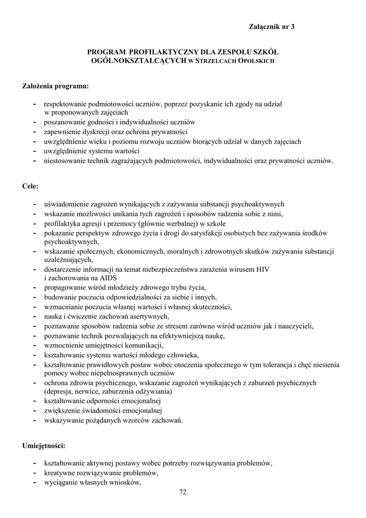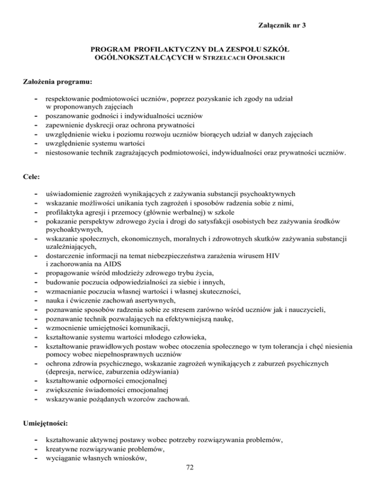 Załącznik nr 3 PROGRAM PROFILAKTYCZNY DLA ZESPOŁU SZKÓŁ OGÓLNOKSZTAŁCĄCYCH W STRZELCACH OPOLSKICH Założenia programu: - respektowanie podmiotowości uczniów, poprzez pozyskanie ich zgody na udział - w proponowanych zajęciach poszanowanie godności i indywidualności uczniów zapewnienie dyskrecji oraz ochrona prywatności uwzględnienie wieku i poziomu rozwoju uczniów biorących udział w danych zajęciach uwzględnienie systemu wartości niestosowanie technik zagrażających podmiotowości, indywidualności oraz prywatności uczniów. Cele: - uświadomienie zagrożeń wynikających z zażywania substancji psychoaktywnych wskazanie możliwości unikania tych zagrożeń i sposobów radzenia sobie z nimi, profilaktyka agresji i przemocy (głównie werbalnej) w szkole pokazanie perspektyw zdrowego życia i drogi do satysfakcji osobistych bez zażywania środków psychoaktywnych, wskazanie społecznych, ekonomicznych, moralnych i zdrowotnych skutków zażywania substancji uzależniających, dostarczenie informacji na temat niebezpieczeństwa zarażenia wirusem HIV i zachorowania na AIDS propagowanie wśród młodzieży zdrowego trybu życia, budowanie poczucia odpowiedzialności za siebie i innych, wzmacnianie poczucia własnej wartości i własnej skuteczności, nauka i ćwiczenie zachowań asertywnych, poznawanie sposobów radzenia sobie ze stresem zarówno wśród uczniów jak i nauczycieli, poznawanie technik pozwalających na efektywniejszą naukę, wzmocnienie umiejętności komunikacji, kształtowanie systemu wartości młodego człowieka, kształtowanie prawidłowych postaw wobec otoczenia społecznego w tym tolerancja i chęć niesienia pomocy wobec niepełnosprawnych uczniów ochrona zdrowia psychicznego, wskazanie zagrożeń wynikających z zaburzeń psychicznych (depresja, nerwice, zaburzenia odżywiania) kształtowanie odporności emocjonalnej zwiększenie świadomości emocjonalnej wskazywanie pożądanych wzorców zachowań. Umiejętności: - kształtowanie aktywnej postawy wobec potrzeby rozwiązywania problemów, - kreatywne rozwiązywanie problemów, - wyciąganie własnych wniosków, 72 - stosowanie zdobytej wiedzy w praktyce, podejmowanie decyzji, efektywne porozumiewanie się w grupie, efektywna komunikacja z otoczeniem społecznym wzmacnianie asertywnych postaw wzmacnianie prospołecznych postaw Sposoby realizacji: - prowadzenie zajęć w ramach godzin do dyspozycji wychowawcy, - nawiązanie ścisłej współpracy z rodzicami: organizowanie spotkań z rodzicami - (pedagogizacja rodziców), prowadzenie rozmów indywidualny, systematyczna współpraca z pedagogiem z poradni psychologiczno-pedagogicznej, systematyczna współpraca z higienistką szkolną, psychologiem szkolnym, lekarzem, policją, kuratorem sądowym, ośrodkami terapeutycznymi organizowanie w ciągu całego roku imprez klasowych: ogniska, wycieczki, wyjazdy do kina, wyjazdy do teatru, itp. Formy pracy: - praca w grupach, praca z całą klasą, praca indywidualna. praca z rodzicami praca z radą pedagogiczną Osoby odpowiedzialne za realizację programu: - wychowawcy klas inni nauczyciele psycholog szkolny osoby zapraszane Temat Kim jestem? Hierarchia wartości. Zdrowie i bezpieczeństwo Zdrowy tryb życia Zagadnienia do realizacji Poznanie samego siebie. Kształtowanie postawy szacunku dla siebie i innych. Kształtowanie poczucia własnej wartości oraz własnej skuteczności Wskazanie ważnych wartości, bez których trudno jest żyć. Wskazanie przeszkód występujących na drodze do miłości, przyjaźni, wolności i radości. Poznanie własnej hierarchii wartości. Rola i znaczenie autorytetu. Uświadomienie wartości zdrowego życia oraz potrzeby troszczenia się o siebie. Profilaktyka zdrowotna Zalety uprawiania aktywności fizycznej ABC zdrowego żywienia – piramida żywieniowa 73 Uzależnienia psychiczne i fizyczne. Na czym polega używanie i nadużywanie alkoholu? Alkoholizm jako choroba rodzinna. Jak uchronić się od nałogów? Uzależnienia behawioralne Okiełznać stres Człowiek – istota społeczna Czym są emocje Efektywna nauka Zdrowa psychika Moda na szczupłą sylwetkę Depresja (dla rodziców i nauczycieli) Radzenie sobie z presją otoczenia Przemoc i agresja Co to znaczy być uzależnionym? Od czego można się uzależnić? Zapoznanie uczniów z pojęciami: Używanie, nadużywanie, picie ryzykowne i uzależnienie Ukazanie obrazu rodziny dotkniętej problemem alkoholowym. Wskazanie ról pozwalających przetrwać w rodzinie alkoholowej. Dostarczanie wiadomości o uzależnieniu i współuzależnieniu. Wskazania sposobów pomocy osobom uzależnionym. Wskazanie wpływu alkoholizmu rodziców na życie dzieci. Urazy emocjonalne. Wskazanie skutków nałogów. Wykształcenie asertywnej postawy wobec nacisków otoczenia. Uzależnienie od Internetu i komputera Uzależnienie od telefonu komórkowego Uzależnienie od pracy Uzależnienie od zakupów Poznanie korzystnych metod radzenia sobie ze stresem. Nauka technik relaksacji. Nauka efektywnej komunikacji. Wzmacnianie kompetencji społecznych, w tym wykształcenie prospołecznej postawy wobec niepełnosprawnych rówieśników uwrażliwienie uczniów na ten problem, przekazanie wiedzy i możliwości pomocy niepełnosprawnym rówieśnikom, Jak emocje wpływają na procesy poznawcze. Sposoby regulacji emocji, radzenie sobie z negatywnymi emocjami. Techniki pamięciowe. Skuteczne planowanie czasu. Style uczenia się Charakterystyka zaburzeń psychicznych okresu dorastania Grupa ryzyka Konsekwencje zaburzeń psychicznych Charakterystyka zaburzeń odżywiania Skutki fizyczne i psychologiczne bulimii i anoreksji. Objawy depresji Przyczyny i skutki zaburzenia Pomoc dziecku cierpiącemu na depresję Asertywność Budowanie i wzmacnianie samooceny Przejawy przemocy i zachowań agresywnych Przeciwdziałanie przemocy Nauka konstruktywnego rozwiązywania konfliktów, Identyfikacja problemów prowadzących do agresji 74