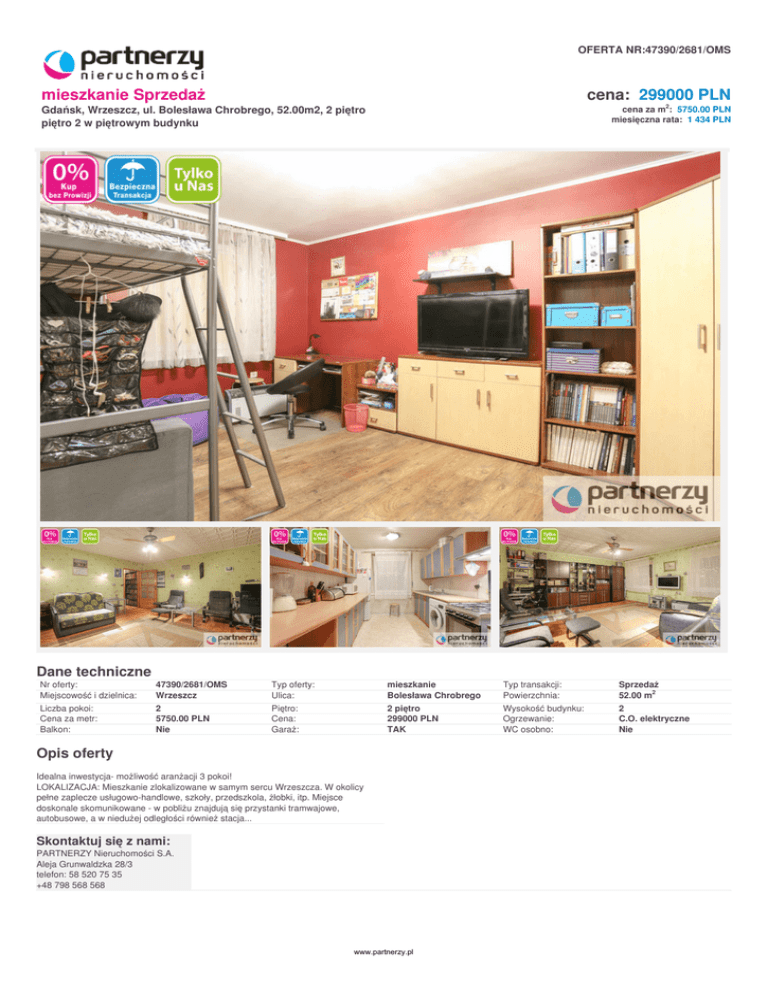 OFERTA NR:47390/2681/OMS mieszkanie Sprzedaż cena: 299000 PLN cena za m2: 5750.00 PLN miesięczna rata: 1 434 PLN Gdańsk, Wrzeszcz, ul. Bolesława Chrobrego, 52.00m2, 2 piętro piętro 2 w piętrowym budynku Dane techniczne Nr oferty: Miejscowość i dzielnica: 47390/2681/OMS Wrzeszcz Typ oferty: Ulica: mieszkanie Bolesława Chrobrego Typ transakcji: Powierzchnia: Sprzedaż 52.00 m2 Liczba pokoi: Cena za metr: Balkon: 2 5750.00 PLN Nie Piętro: Cena: Garaż: 2 piętro 299000 PLN TAK Wysokość budynku: Ogrzewanie: WC osobno: 2 C.O. elektryczne Nie Opis oferty Idealna inwestycja- możliwość aranżacji 3 pokoi! LOKALIZACJA: Mieszkanie zlokalizowane w samym sercu Wrzeszcza. W okolicy pełne zaplecze usługowo-handlowe, szkoły, przedszkola, żłobki, itp. Miejsce doskonale skomunikowane - w pobliżu znajdują się przystanki tramwajowe, autobusowe, a w niedużej odległości również stacja... Skontaktuj się z nami: PARTNERZY Nieruchomości S.A. Aleja Grunwaldzka 28/3 telefon: 58 520 75 35 +48 798 568 568 www.partnerzy.pl Powered by TCPDF (www.tcpdf.org)