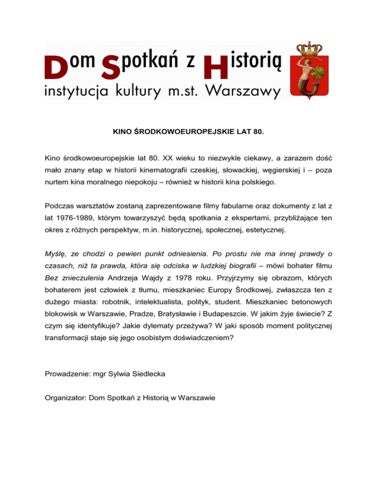 KINO ŚRODKOWOEUROPEJSKIE LAT 80. Kino środkowoeuropejskie lat 80. XX wieku to niezwykle ciekawy, a zarazem dość mało znany etap w historii kinematografii czeskiej, słowackiej, węgierskiej i – poza nurtem kina moralnego niepokoju – również w historii kina polskiego. Podczas warsztatów zostaną zaprezentowane filmy fabularne oraz dokumenty z lat z lat 1976-1989, którym towarzyszyć będą spotkania z ekspertami, przybliżające ten okres z różnych perspektyw, m.in. historycznej, społecznej, estetycznej. Myślę, ze chodzi o pewien punkt odniesienia. Po prostu nie ma innej prawdy o czasach, niż ta prawda, która się odciska w ludzkiej biografii – mówi bohater filmu Bez znieczulenia Andrzeja Wajdy z 1978 roku. Przyjrzymy się obrazom, których bohaterem jest człowiek z tłumu, mieszkaniec Europy Środkowej, zwłaszcza ten z dużego miasta: robotnik, intelektualista, polityk, student. Mieszkaniec betonowych blokowisk w Warszawie, Pradze, Bratysławie i Budapeszcie. W jakim żyje świecie? Z czym się identyfikuje? Jakie dylematy przeżywa? W jaki sposób moment politycznej transformacji staje się jego osobistym doświadczeniem? Prowadzenie: mgr Sylwia Siedlecka Organizator: Dom Spotkań z Historią w Warszawie