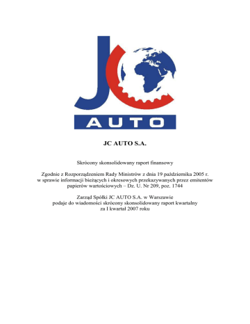 JC AUTO S.A. Skrócony skonsolidowany raport finansowy Zgodnie z Rozporządzeniem Rady Ministrów z dnia 19 października 2005 r. w sprawie informacji bieŜących i okresowych przekazywanych przez emitentów papierów wartościowych – Dz. U. Nr 209, poz. 1744 Zarząd Spółki JC AUTO S.A. w Warszawie podaje do wiadomości skrócony skonsolidowany raport kwartalny za I kwartał 2007 roku JC AUTO S.A. Skrócony skonsolidowany raport finansowy za I kwartał roku 2007 _____________________________________________________________________________________ 1. Informacje o JC AUTO S.A. JC AUTO S.A. („Spółka”) i jej jednostki zaleŜne („Grupa JC AUTO”, „Grupa”) prowadzą działalność w zakresie dystrybucji zamiennych części samochodowych. Spółka jest jednym z największych w Polsce podmiotów zajmujących się sprzedaŜą części zamiennych do samochodów. Specjalizacją Spółki jest dystrybucja części do samochodów japońskich i koreańskich. 2. Siedziba JC AUTO Spółka Akcyjna ul. Materii 6 02-258 Warszawa 3. Sąd Rejestrowy Spółki Sąd Rejonowy dla m.st. Warszawy w Warszawie XIII Wydział Gospodarczy Krajowego Rejestru Sądowego ul. Barska 28/30, 02-315 Warszawa Numer rejestru: KRS 0000185481 4. Rada Nadzorcza • • • • • Agnieszka Fijałkowska Grabowiecka - Przewodnicząca Rady Nadzorczej Jarosław Maczkowski - Członek Rady Nadzorczej Andrzej Muter – Członek Rady Nadzorczej Mariusz Nowakowski – Członek Rady Nadzorczej Jacek Łukowicz – Członek Rady Nadzorczej 5. Zarząd JC AUTO S.A. • • • Pan Jerzy Józefiak - Prezes Zarządu Pan Jerzy Grabowiecki - Członek Zarządu Pan Szymon Getka - Członek Zarządu. 6. Biegły rewident BDO Numerica sp. z o.o. ul. Postępu 12 02-676 Warszawa 7. Główna kancelaria prawna Joanna Wasilewska - radca prawny ul. Dominikańska 7a 61-762 Poznań 2 JC AUTO S.A. Skrócony skonsolidowany raport finansowy za I kwartał roku 2007 _____________________________________________________________________________________ 8. Główny bank Fortis Bank Polska S.A. ul. Postępu 15 02-676 Warszawa Kredyt Bank S.A. ul. Kasprzaka 2/8 01-211 Warszawa 9. Spółki zaleŜne objęte konsolidacją ARMATUS sp. z o.o. ul. Burakowska 60 01-794 Warszawa, Polska Kapitał zakładowy - 1 467 000,00 zł. Spółka wpisana pod numerem KRS 0000235784 do Krajowego Rejestru Sądowego prowadzonego przez Sąd Rejonowy w Katowicach, Wydział Gospodarczy Krajowego Rejestru Sądowego. JC AUTO s.r.o. Lazensky park 10, c.p. 329 735 03 Karvina- Darkom, Czechy Kapitał zakładowy - 2 450 000,00 koron czeskich (341 490,00 zł). Spółka wpisana pod numerem 27426 dział C do Rejestru Handlowego prowadzonego przez Sąd Wojewódzki w Ostrawie. (nr statystyczny 26809583). JC AUTO Kereskedelmi Kft Klapka Utca 4 H-1134 Budapest, Węgry Kapitał zakładowy - 30 000 000,00 forintów (512 502,00 zł). Spółka wpisana do rejestru handlowego prowadzonego przez Fovarosi Birosag Cegbirosaga w Budapeszcie (nr statystyczny 13030083-5030-113-01). JC AUTO S.A. Rue du Parc Industriel 3D 1440 Brain-le-Chateau, Belgia Kapitał zakładowy – 350 000,00 EUR (1 388 995,00 zł). Spółka wpisana do rejestru handlowego prowadzonego przez Ondernemingsloket (nr statystyczny 0870456224). JC AUTO d.d.o. Radnička cesta 27 1000 Zagrzeb, Chorwacja Kapitał zakładowy – 1.000.000 HRK, (553 300,00 zł). 3 JC AUTO S.A. Skrócony skonsolidowany raport finansowy za I kwartał roku 2007 _____________________________________________________________________________________ Spółka wpisana pod numerem KRS 080531327 do rejestru handlowego prowadzonego przez Sąd Handlowy w Zagrzebiu. JC AUTO srl Viale A.Doria 48/A 20124 Milan, Włochy kapitał zakładowy – 100.000 EUR (382 145,00 zł) wpisana pod numerem 1795436 do Repertorium Gospodarczo-Administracyjnego prowadzonego przez Izbę Handlu, Rzemiosła i Rolnictwa w Mediolanie – Urząd Rejestru Spółek. ARMATUS sp. z o.o. JC AUTO s.r.o. JC AUTO Kereskedelmi Kft JC AUTO S.A. JC AUTO d.d.o. JC AUTO srl 1 467 000 2 450 000 30 000 000 350 000 1 000 000 100 000 wartość udziałów posiadanych przez JC AUTO S.A. walu ta jednostka zaleŜna kapitał zakładowy walu ta Według stanu na dzień 31.03.2007 r. firma JC AUTO S.A. posiada: PLN CZK HUF EUR HRK EUR 1 467 000 2 450 000 30 000 000 350 000 1 000 000 99 000 PLN CZK HUF EUR HRK EUR % kapitału zakładowego jednostki zaleŜnej 100,00% 100,00% 100,00% 100,00% 100,00% 99,00% Jednostki zaleŜne według stanów na dzień 31.03.2007 r. posiadały udziały w kapitałach innych podmiotów: 100 000 EUR wartość udziałów 1 000 walu ta jednostka zaleŜna JC AUTO srl kapitał zakładowy walu ta JC AUTO s.r.o. EUR % kapitału zakładowego jednostki zaleŜnej 1,00% Podstawowym przedmiotem działalności jednostek zaleŜnych jest podobnie jak w przypadku jednostki dominującej jest działalność w zakresie dystrybucji zamiennych części samochodowych. 10. W sprawozdaniu finansowym i porównywalnych danych finansowych nie dokonano korekt wynikających z zastrzeŜeń w opiniach podmiotów uprawnionych do badania o skonsolidowanych sprawozdaniach finansowych lub sprawozdaniach finansowych za lata, za które prezentowane są skonsolidowane sprawozdania finansowe i porównywalne skonsolidowane dane finansowe. 4 JC AUTO S.A. Skrócony skonsolidowany raport finansowy za I kwartał roku 2007 _____________________________________________________________________________________ 11. Wybrane dane finansowe PoniŜsza tabela przedstawia wybrane dane finansowe za okres trzech miesięcy zakończony 31 marca 2007 r. i 31.03.2006 r. Informacje zawarte w tej tabeli powinny być czytane razem z informacjami zawartymi w skonsolidowanych sprawozdaniach finansowych Grupy Kapitałowej JC AUTO S.A. w tys. zł 2007-01-01 2007-03-31 Przychody netto ze sprzedaŜy produktów, towarów i materiałów Zysk (strata) z działalności operacyjnej Zysk (strata) brutto Zysk (strata) netto przypadający na akcjonariuszy jednostki dominując
