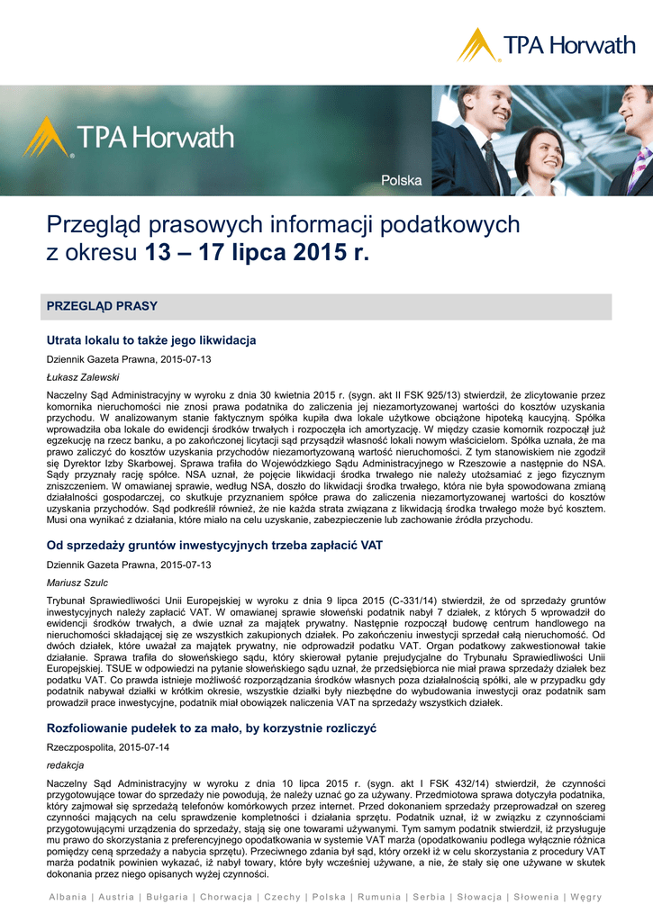 Przegląd prasowych informacji podatkowych z okresu 13 – 17 lipca 2015 r. PRZEGLĄD PRASY Utrata lokalu to także jego likwidacja Dziennik Gazeta Prawna, 2015-07-13 Łukasz Zalewski Naczelny Sąd Administracyjny w wyroku z dnia 30 kwietnia 2015 r. (sygn. akt II FSK 925/13) stwierdził, że zlicytowanie przez komornika nieruchomości nie znosi prawa podatnika do zaliczenia jej niezamortyzowanej wartości do kosztów uzyskania przychodu. W analizowanym stanie faktycznym spółka kupiła dwa lokale użytkowe obciążone hipoteką kaucyjną. Spółka wprowadziła oba lokale do ewidencji środków trwałych i rozpoczęła ich amortyzację. W między czasie komornik rozpoczął już egzekucję na rzecz banku, a po zakończonej licytacji sąd przysądził własność lokali nowym właścicielom. Spółka uznała, że ma prawo zaliczyć do kosztów uzyskania przychodów niezamortyzowaną wartość nieruchomości. Z tym stanowiskiem nie zgodził się Dyrektor Izby Skarbowej. Sprawa trafiła do Wojewódzkiego Sądu Administracyjnego w Rzeszowie a następnie do NSA. Sądy przyznały rację spółce. NSA uznał, że pojęcie likwidacji środka trwałego nie należy utożsamiać z jego fizycznym zniszczeniem. W omawianej sprawie, według NSA, doszło do likwidacji środka trwałego, która nie była spowodowana zmianą działalności gospodarczej, co skutkuje przyznaniem spółce prawa do zaliczenia niezamortyzowanej wartości do kosztów uzyskania przychodów. Sąd podkreślił również, że nie każda strata związana z likwidacją środka trwałego może być kosztem. Musi ona wynikać z działania, które miało na celu uzyskanie, zabezpieczenie lub zachowanie źródła przychodu. Od sprzedaży gruntów inwestycyjnych trzeba zapłacić VAT Dziennik Gazeta Prawna, 2015-07-13 Mariusz Szulc Trybunał Sprawiedliwości Unii Europejskiej w wyroku z dnia 9 lipca 2015 (C-331/14) stwierdził, że od sprzedaży gruntów inwestycyjnych należy zapłacić VAT. W omawianej sprawie słoweński podatnik nabył 7 działek, z których 5 wprowadził do ewidencji środków trwałych, a dwie uznał za majątek prywatny. Następnie rozpoczął budowę centrum handlowego na nieruchomości składającej się ze wszystkich zakupionych działek. Po zakończeniu inwestycji sprzedał całą nieruchomość. Od dwóch działek, które uważał za majątek prywatny, nie odprowadził podatku VAT. Organ podatkowy zakwestionował takie działanie. Sprawa trafiła do słoweńskiego sądu, który skierował pytanie prejudycjalne do Trybunału Sprawiedliwości Unii Europejskiej. TSUE w odpowiedzi na pytanie słoweńskiego sądu uznał, że przedsiębiorca nie miał prawa sprzedaży działek bez podatku VAT. Co prawda istnieje możliwość rozporządzania środków własnych poza działalnością spółki, ale w przypadku gdy podatnik nabywał działki w krótkim okresie, wszystkie działki były niezbędne do wybudowania inwestycji oraz podatnik sam prowadził prace inwestycyjne, podatnik miał obowiązek naliczenia VAT na sprzedaży wszystkich działek. Rozfoliowanie pudełek to za mało, by korzystnie rozliczyć Rzeczpospolita, 2015-07-14 redakcja Naczelny Sąd Administracyjny w wyroku z dnia 10 lipca 2015 r. (sygn. akt I FSK 432/14) stwierdził, że czynności przygotowujące towar do sprzedaży nie powodują, że należy uznać go za używany. Przedmiotowa sprawa dotyczyła podatnika, który zajmował się sprzedażą telefonów komórkowych przez internet. Przed dokonaniem sprzedaży przeprowadzał on szereg czynności mających na celu sprawdzenie kompletności i działania sprzętu. Podatnik uznał, iż w związku z czynnościami przygotowującymi urządzenia do sprzedaży, stają się one towarami używanymi. Tym samym podatnik stwierdził, iż przysługuje mu prawo do skorzystania z preferencyjnego opodatkowania w systemie VAT marża (opodatkowaniu podlega wyłącznie różnica pomiędzy ceną sprzedaży a nabycia sprzętu). Przeciwnego zdania był sąd, który orzekł iż w celu skorzystania z procedury VAT marża podatnik powinien wykazać, iż nabył towary, które były wcześniej używane, a nie, że stały się one używane w skutek dokonania przez niego opisanych wyżej czynności. Albania | Austria | Bułgaria | Chorwacja | Czechy | Polska | Rumunia | Serbia | Słowacja | Słowenia | Węgry Nie można dwa razy zaliczyć tego samego do kosztów Dziennik Gazeta Prawna, 2015-07-14 Łukasz Zalewski Naczelny Sąd Administracyjny w wyroku z dnia 10 lipca 2015r. (sygn. akt II FSK 1392/13) stwierdził, że podatnik nie może dwa razy amortyzować tego samego budynku od początku. Spółka nabyła prawo użytkowania wieczystego gruntu wraz ze znajdującymi się na nim budynkiem. Budynek amortyzowany był przez nią według specjalnej stawki do 2010 roku, kiedy to został całkowicie zamortyzowany. Następnie spółka dokonała znacznych nakładów na tą nieruchomość. Spółka uznała, że może amortyzować budynek od nowej wartości początkowej uwzględniającej wartość ulepszeń oraz, że może zastosować nową stawkę amortyzacyjną. Zarówno organ podatkowy, Wojewódzki Sąd Administracyjny we Wrocławiu jak i NSA nie zgodziły się ze Spółką. NSA uznał, że nie ma czegoś takiego jak nowa wartość początkowa. Amortyzacji podlega wartość początkowa budynku zwiększona o wartość ulepszeń. Suma wszystkich odpisów amortyzacyjnych nie może przekroczyć wartości początkowej budowli powiększonej o wartość ulepszeń. Jednocześnie NSA uznał, że podatnik nie ma prawa do zmiany raz przyjętej metody amortyzacji. Usługi menedżerskie bez VAT Dziennik Gazeta Prawna, 2015-07-14 Agnieszka Pokojska Dyrektor Izby Skarbowej w Łodzi w interpretacji indywidualnej z dnia 4 maja 2015 r. (sygn. IPTPP1/4512-133/15-4/AK) uznał, że pełnienie funkcji członka zarządu w spółce nie mieści się w definicji działalności gospodarczej w rozumieniu ustawy VAT. Interpretacja ta jest zgodna z uchwałą Sądu Naj