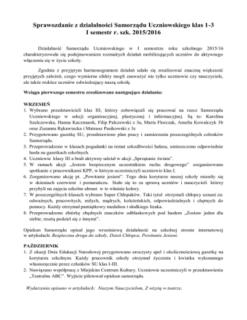 Sprawozdanie z działalności Samorządu Uczniowskiego klas 1-3 I semestr r. szk. 2015/2016 Działalność Samorządu Uczniowskiego w I semestrze roku szkolnego 2015/16 charakteryzowała się podejmowaniem rozmaitych działań mobilizujących uczniów do aktywnego włączenia się w życie szkoły. Zgodnie z przyjętym harmonogramem działań udało się zrealizować znaczną większość przyjętych założeń, czego wymierne efekty mogli zauważyć nie tylko uczniowie czy nauczyciele, ale także rodzice uczniów odwiedzający naszą szkołę. Wciągu pierwszego semestru zrealizowano następujące działania: WRZESIEŃ 1. Wybrano przedstawicieli klas III, którzy zobowiązali się pracować na rzecz Samorządu Uczniowskiego w sekcji organizacyjnej, plastycznej i informacyjnej. Są to: Karolina Szulczewska, Hanna Kaczmarek, Filip Palczewski z 3a, Maria Florczak, Amelia Kowalczyk 3b oraz Zuzanna Rękawiecka i Mateusz Pasikowski z 3c 2. Przygotowano gazetkę SU, przedstawiono plan pracy i zamierzenia poszczególnych członków Samorządu. 3. Przeprowadzono w klasach pogadanki na temat szkodliwości hałasu, umieszczono odpowiednie hasła na gazetkach szkolnych. 4. Uczniowie klasy III a brali aktywny udział w akcji „Sprzątanie świata”. 5. W ramach akcji „Jestem bezpiecznym uczestnikiem ruchu drogowego” zorganizowano spotkanie z pracownikami KPP, w którym uczestniczyli uczniowie klas I. 6. Zorganizowano akcję pt. „Powitanie jesieni”. Tego dnia korytarze naszej szkoły mieniły się w dcieniach czerwieni i pomarańczu. Stało się to za sprawą uczniów i nauczycieli którzy przybyli na zajęcia szkolne ubrani w te właśnie kolory. 7. W poszczególnych klasach wybrano Super Chłopaków. Taki tytuł otrzymali chłopcy uznani za: odważnych, pracowitych, miłych, mądrych, koleżeńskich, odpowiedzialnych i chętnych do pomocy. Każdy otrzymał pamiątkowy medalion i słodkiego lizaka. 8. Przeprowadzono zbiórkę zbędnych znaczków odblaskowych pod hasłem „Zostaw jeden dla siebie, resztą podziel się z innymi”. Opiekun Samorządu opisał jego wrześniową działalność na szkolnej stronie internetowej w artykułach: Bezpieczna droga do szkoły, Dzień Chłopca, Powitanie Jesieni. PAŹDZIERNIK 1. Z okazji Dnia Edukacji Narodowej przygotowano uroczysty apel i okolicznościową gazetkę na korytarzu szkolnym. Każdy pracownik szkoły otrzymał życzenia i kwiatka wykonanego własnoręcznie przez członków SU klas I-III. 2. Nawiązano współpracę z Miejskim Centrum Kultury. Uczniowie uczestniczyli w przedstawieniu „Teatralne ABC”. Wyjście pilotował opiekun samorządu. Wydarzenia opisano w artykułach: Naszym Nauczycielom, Z wizytą w teatrze. LISTOPAD 1. Zorganizowano spacer na cmentarz - zapalenie zniczy na grobach żołnierzy. Do akcji włączyli się rodzice uczniów klasy IIIa. 2. Uczniowie klas I-III uczcili Święto Niepodległości ubrani w stroje odpowiadające barwom narodowym nosili przypięte biało-czerwone kotyliony. Sale lekcyjne i korytarze naszej szkoły zdobiły wykonane przez dzieci symbole narodowe w postaci flag i ilustracji godła. 3. We współpracy z pedagogiem opiekun SU koordynował uczestnictwo uczniów klas I-III w akcji „Szkolny Dzień Tolerancji". Wykonanie plakatów, udział w spektaklu profilaktycznym. 4. Zorganizowano dyskotekę andrzejkową. Członkowie SU udekorowali salę gimnastyczną namalowanymi przez klasy trzecie plakatami. W klasach odbył się słodki poczęstunek, a specjalny wystrój sal i wróżby andrzejkowe sprawiły, że był to magiczny wieczór. Opiekun SU opisał wydarzenia z listopada na szkolnej stronie internetowej w artykułach: Spacer Pamięci, Dzień Niepodległości, Czary mary. GRUDZIEŃ 1. Zorganizowano akcję „Szkoła pełna Mikołajów”. 4 grudnia korytarze szkolne były pełne postaci w czerwonych, mikołajkowych strojach. Zdjęcia z tej imprezy można zobaczyć na stronie internetowej szkoły. 2. Zadbano o świąteczny wystrój korytarzy szkolnych. 3. Członkowie SU przygotowali i wręczyli pracownikom szkoły świąteczne kartki z życzeniami. 4. Uczniowie klas III przygotowali i zaprezentowali tradycyjne JASEŁKA pracownikom Urzędu Miasta. Zdjęcia podjętych przedsięwzięć można zobaczyć na internetowej stronie szkoły. STYCZEŃ 1. 14 stycznia 2016r. uczniowie bawili się na zabawie karnawałowej. Samorząd Uczniowski sprawował pieczę nad dekoracją sali gimnastycznej przed uroczystością. 2. Odbędzie się apel podsumowujący półrocze. Samorząd Uczniowski zaapeluje do najmłodszych uczniów naszej szkoły o rozwagę podczas zabaw na śniegu i lodzie, a także przypomni zasady bezpieczeństwa obowiązujące w domu. Przygotowania są w toku. Samorząd Uczniowski włączył się w następujące akcje charytatywne organizowane na terenie szkoły: zbiórka karmy dla zwierząt ze schroniska, Góra grosza, Dzieci dzieciom, zbiórka nakrętek, baterii. Opiekun samorządu klas I-III Dobrosława Bembenista