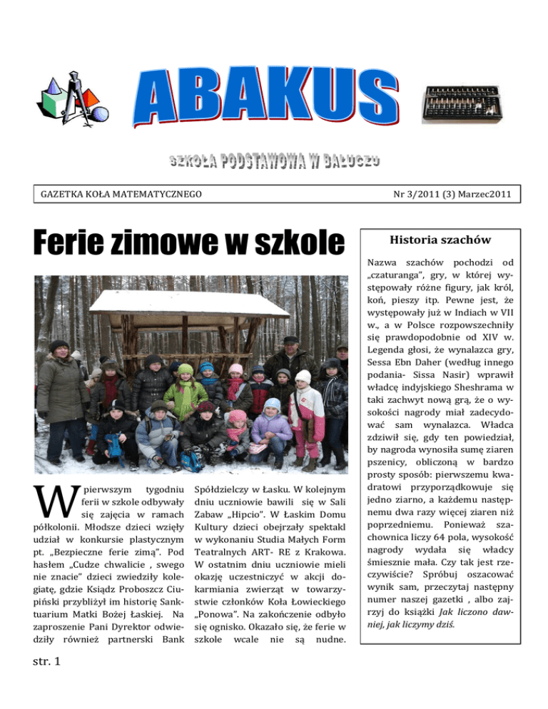GAZETKA KOŁA MATEMATYCZNEGO Ferie zimowe w szkole W pierwszym tygodniu ferii w szkole odbywały się zajęcia w ramach półkolonii. Młodsze dzieci wzięły udział w konkursie plastycznym pt. „Bezpieczne ferie zimą”. Pod hasłem „Cudze chwalicie , swego nie znacie” dzieci zwiedziły kolegiatę, gdzie Ksiądz Proboszcz Ciupiński przybliżył im historię Sanktuarium Matki Bożej Łaskiej. Na zaproszenie Pani Dyrektor odwiedziły również partnerski Bank str. 1 Spółdzielczy w Łasku. W kolejnym dniu uczniowie bawili się w Sali Zabaw „Hipcio”. W Łaskim Domu Kultury dzieci obejrzały spektakl w wykonaniu Studia Małych Form Teatralnych ART- RE z Krakowa. W ostatnim dniu uczniowie mieli okazję uczestniczyć w akcji dokarmiania zwierząt w towarzystwie członków Koła Łowieckiego „Ponowa”. Na zakończenie odbyło się ognisko. Okazało się, że ferie w szkole wcale nie są nudne. Nr 3/2011 (3) Marzec2011 Historia szachów Nazwa szachów pochodzi od „czaturanga”, gry, w której występowały różne figury, jak król, koń, pieszy itp. Pewne jest, że występowały już w Indiach w VII w., a w Polsce rozpowszechniły się prawdopodobnie od XIV w. Legenda głosi, że wynalazca gry, Sessa Ebn Daher (według innego podania- Sissa Nasir) wprawił władcę indyjskiego Sheshrama w taki zachwyt nową grą, że o wysokości nagrody miał zadecydować sam wynalazca. Władca zdziwił się, gdy ten powiedział, by nagroda wynosiła sumę ziaren pszenicy, obliczoną w bardzo prosty sposób: pierwszemu kwadratowi przyporządkowuje się jedno ziarno, a każdemu następnemu dwa razy więcej ziaren niż poprzedniemu. Ponieważ szachownica liczy 64 pola, wysokość nagrody wydała się władcy śmiesznie mała. Czy tak jest rzeczywiście? Spróbuj oszacować wynik sam, przeczytaj następny numer naszej gazetki , albo zajrzyj do książki Jak liczono dawniej, jak liczymy dziś. GAZETKA KOŁA MATEMATYCZNEGO Nr 3/2011 (3) Marzec 2011 Wielcy matematycy SPORT W NASZEJ SZKOLE Listopad Mistrzostwa Powiatu w Unihokeju Dziewczęta I miejsce Reprezentacja: Radziszewska Agnieszka, Wartalska Marta, Pluskwa Karolina, Sowała Noemi, Klimczak Karolina, Nowicka Marika, Supczyńska Marta, Zakrzewska Patrycja, Skurzewska Dominika, Hryniewiecka Justyna. Chłopcy I miejsce Reprezentacja: Molenda Bartosz, Nastarowicz Mateusz, Grzanka Seweryn, Jagiełło Andrzej, Grzanka Rafał, Kalinowski Jan, Ciszewski Kacper, Grzanka Maciej, Maciejewski Krystian, Pietrzykowski Krzysztof, Manios Dawid, Olejnik Dawid, Taborowski Michał. Mistrzostwa Rejonu Sieradzkiego w Unihokeju Dziewczęta IV miejsce Reprezentacja: Radziszewska Agnieszka, Wartalska Marta, Pluskwa Karolina, Sowała Noemi, Klimczak Karolina, Nowicka Marika, Supczyńska Marta, Zakrzewska Patrycja, Skurzewska Dominika, Hryniewiecka Justyna. Chłopcy IV miejsce Reprezentacja: Molenda Bartosz, Grzanka Seweryn, Jagiełło Andrzej, Grzanka Rafał, Kalinowski Jan, Ciszewski Kacper, Grzanka Maciej, Maciejewski Krystian, Pietrzykowski Krzysztof, Manios Dawid, Olejnik Dawid, Taborowski Michał. Turniej o Puchar Dyrektora Szkoły Podstawowej w Bałuczu w Mini Piłce Siatkowej Chłopców SP Bałucz IV miejsce Reprezentacja: Grzanka Seweryn, Jagiełło Andrzej, Kalinowski Jan, Ciszewski Kacper, Grzanka Maciej, Maciejewski Krystian, Manios Dawid, Olejnik Dawid, Taborowski Michał. To nie wszystko. Czytajcie później. str. 2 Mikołaj Kopernik urodził się w Toruniu w 1473 r. Po śmierci ojca młodym Kopernikiem zaopiekował się jego wuj Łukasz Waczenrode, od 1489 r. biskup warmiński. Swą edukację rozpoczął Kopernik w Toruniu, kontynuował zaś w Chełmnie. W 1491 r. zapisuje się w poczet uczniów Akademii Krakowskiej. W 1494 r. wstępuje do stanu duchownego i w dwa lata później udaje się do Włoch, gdzie studiuje i uzyskuje doktorat prawa oraz kończy medycynę. W roku 1503 powraca do kraju i zostaje kanonikiem we Fromborku. Działa jako lekarz, ale na zlecenie króla zajmuje się też reformą monetarną w kraju. Jemu przypisuje się także zaprojektowanie i założenie wodociągów w mieście. W 1542 r. w Witemberdze ukazała się „Trygonometria” Kopernika, a w 1543 r., już u schyłku jego życia, wyszło na świat główne dzieło, dające początek nowej epoce: „O obrotach sfer niebieskich”. Kopernik nie był matematykiem w dzisiejszym rozumieniu tego słowa. Traktował matematykę jako narzędzie w swych wysiłkach przebudowy wyobrażeń o wszechświecie. GAZETKA KOŁA MATEMATYCZNEGO Nr 3/2011 (3) Marzec 2011 PRÓBNY SPRAWDZIAN Z „OPERONEM” Uczniowie klasy VI pisali próbny sprawdzian, w którym wzięło udział około 70% szkół w Polsce. Oto wyniki. Oby w kwietniu nie były gorsze. 30 25 Średnia 20 15 10 5 0 Korz Rozu ystan Czyta Pisan mow ie z nie ie anie infor macji Wyk orzys tanie wied zy w prakt yce Cały test 8,87 5,87 5,33 2,33 5,67 28,07 Województwo 8,64 5,54 4,99 2,55 5,24 26,97 Polska 5,48 5,01 2,5 5,21 26,79 Szkoła 8,59 Badane umiejętności Zaczarowane sześciany str. 3 Domino – gra, w której używa się płytek nazywanych kamieniami. Każda płytka podzielona jest na dwa kwadratowe pola z zaznaczonymi oczkami. Najpopularniejsza wersja składa się z 28 kamieni: wszystkie kombinacje liczb od 0 (tzw. „mydło”) do 6. Znajduje się na nich po osiem pól: pustych, z jednym oczkiem, z dwoma, trzema, czterema, pięcioma i sześcioma — razem 168 oczek. Kamienie, na których obu polach liczba oczek jest taka sama, to „dublety”. Przypuszcza się, że gra znana była starożytnym Grekom, Hebrajczykom i Chińczykom. W Europie rozpowszechniła się w XVIII stuleciu. W grze biorą udział dwie, trzy lub cztery osoby. Kamienie odwraca się oczkami do spodu i miesza. Następnie losuje się gracza rozpoczynającego - jest nim zwykle gracz, który wyciągnie kamień o największej sumie oczek. Wylosowane kamienie zwracane są do puli po czym wszystkie są ponownie mieszane. Gracze pobierają kamienie poczynając od roz