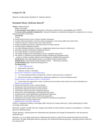 Lekcja 19 i 20 Materiał z podręcznika: Rozdział 12. Ochrona danych Konspekt lekcji „Ochrona danych” Temat: Ochrona danych Czas: 2x45 minut Uczeń powinien znać pojęcia: informatyka, informacja, społeczeństwo, przeglądarka stron WWW. Uczeń powinien posiadać umiejętności: włączania komputera, uruchamiania programów, posługiwania się myszą, wpisywania tekstu z klawiatury. Cele lekcji: Uczeń: ♦ potrafi podać kryteria oceny wartości zasobów komputera, ♦ rozumie różnicę pomiędzy wartością rynkową programu a znaczeniem pliku dla użytkownika. ♦ rozróżnia fizyczne i logiczne przyczyny utraty danych, ♦ podaje przykłady fizycznych i logicznych przyczyn utraty danych. ♦ rozumie pojęcie odtajnianie danych, ♦ wie, jakie niebezpieczeństwa wiążą się z odtajnieniem danych prywatnych i służbowych, ♦ proponuje metody zapobiegania odtajnieniu danych. ♦ zna zasady dbałości o sprzęt komputerowy, ♦ zna zasady postępowania zmniejszające ryzyko uszkodzeń logicznych. ♦ zna różnice w działaniu poszczególnych odmian szkodliwego oprogramowania, 1. stosuje w praktyce metody ochrony przed działaniem szkodliwych programów. Formy pracy: praca indywidualna, praca ze wszystkimi uczniami jednocześnie. Metody pracy: metoda praktycznego działania; pokaz — obserwacja; dyskusja. Środki dydaktyczne: stanowisko komputerowe. Przebieg lekcji: 2. Część organizacyjna Sprawdzenie obecności. Zapisanie tematu w dzienniku. Powtórzenie wiadomości z poprzedniej lekcji Co to jest programowalność komputerów i jak jest wykorzystywana w praktyce? Jakie kryteria należy uwzględnić przy dobieraniu aplikacji do zestawu komputerowego? Podanie tematu i zapoznanie uczniów z celami lekcji Celem lekcji jest zapoznanie ucznia z możliwymi przyczynami utraty danych oraz przeciwdziałaniu im. Podanie nowego materiału ♦ Omówienie kryteriów oceny wartości danych. ♦ Wyjaśnienie fizycznych przyczyn utraty danych ♦ Wyjaśnienie logicznych przyczyn utraty danych. ♦ Omówienie różnych powodów odtajniania danych. ♦ Omówienie zasad zapobiegania uszkodzeniom fizycznym ♦ Przedstawienie zasad zapobiegania uszkodzeniom logicznym ♦ Objaśnienie zasad klasyfikacji szkodliwych programów ♦ Zaproponowanie metod ochrony przed działaniem szkodliwych programów ♦ Przedstawienie roli kopii zapasowych Zdefiniowanie ćwiczeń do wykonania Wskaż w komputerze foldery zawierające pliki, których nie można odtworzyć z płyt instalacyjnych. Które zawierają ważne dane. Sprawdź, na jakie czynniki fizyczne, mogące prowadzić do utraty danych, narażone są komputery w szkolnej pracowni informatycznej. W jaki sposób w szkolnej pracowni informatycznej chroniony jest dostęp do komputerów oraz kont poczty elektronicznej? Sprawdź, czy ze swojego konta poczty elektronicznej możesz wysłać list bez podawania hasła do skrzynki pocztowej. Na jakie niebezpieczeństwo narażony jest właściciel konta pocztowego, z którego można wysłać list bez autoryzacji? Sprawdź, czy w szkolnej pracowni informatycznej są przestrzegane wszystkie zasady dbałości o sprzęt? Jakie zasady dbałości o pliki stosujesz podczas pracy z komputerem? Jakie dane utracisz bezpowrotnie, jeśli komputer, przy którym pracujesz ulegnie teraz awarii? Jak możesz temu zapobiec? Który z elektronicznych pasożytów (wirus, robak, trojan) może spowodować zablokowanie sieci komputerowej. W kolejności określonej przez nauczyciela uczniowie wykonują ćwiczenia: Uczniowie znajdują pliki, które zostały utworzone przez użytkowników komputera. Wykorzystują do tego celu nazwy plików dostępne po wybraniu poleceń: 1. 2. 3. 4. 5. Menu Start, Moje dokumenty Menu Start, Moje bieżące dokumenty, Menu Start, Moje obrazy, Menu Start, Moja muzyka Menu Start, Wyszukaj a następnie wpisują rozszerzenia nazw plików, które mogą zawierać istotne dane. Metoda opisana w punkcie e pozwala na znalezienie zagubionych plików. Uczniowie na podstawie rozdziału 12.2. podręcznika wykonują tabelę. W pierwszej kolumnie zapisane są potencjalne zagrożenia. W drugiej kolumnie wpisują czy i dlaczego komputer narażony jest na szkodliwy czynnik. Zapisują uwagę o sposobach usunięcia zagrożenia. Uczniowie na podstawie rozdziału 12.3. podręcznika wykonują tabelę. W pierwszej kolumnie zapisane są potencjalne przyczyny utraty danych. W drugiej kolumnie wpisują czy i dlaczego komputer narażony jest na utratę danych. Zapisują uwagę o sposobach usunięcia zagrożenia. Uczniowie uruchamiają program do obsługi korespondencji elektronicznej. Piszą list i adresują go do siebie. Wysyłają, bez podawania hasła (tylko na podstawie znajomości nazwy konta). Sprawdzają, czy prób wysyłki powiodła się. Wymieniają niebezpieczeństwa na jakie narażony jest właściciel konta pocztowego, z którego można wysłać list bez autoryzacji. Uczniowie na podstawie rozdziału 12.4. podręcznika wykonują tabelę. W pierwszej kolumnie wpisują sposób ochrony sprzętu. W drugiej kolumnie wpisują czy jest on stosowany w szkolnej pracowni komputerowej. Jeżeli nie jest on stosowany, zapisują uwagę o sposobach wdrożenia ochrony. Uczniowie na podstawie rozdziału 12.4. podręcznika wykonują tabelę. W pierwszej kolumnie wpisują stosowane zasady dbałości o pliki. W drugiej kolumnie wpisują informacje o stosowaniu zasady lub – jeśli nie jest stosowana – metodach usunięcia przeszkód w stosowaniu jej. Uczniowie wymieniają dane, które prawdopodobnie zostaną bezpowrotnie utracone jeśli komputer, przy którym pracują ulegnie teraz awarii. Podają propozycje kroków, jakie należy przedsięwziąć, aby zminimalizować ryzyko utraty danych. Uczniowie wymieniają cechy charakterystyczne elektronicznych pasożytów: wirusa, robaka, trojana. Wskazują, który z rodzajów może spowodować zablokowanie sieci komputerowej. Znajdują w Internecie informacje o symptomach ataku i szkodach wyrządzo