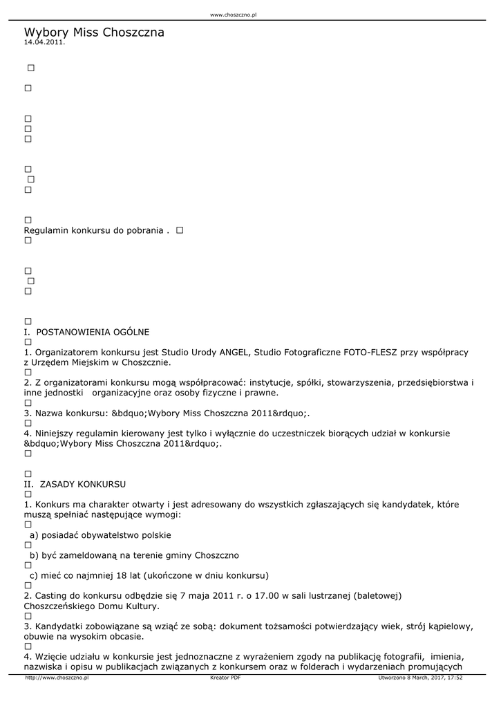 www.choszczno.pl Wybory Miss Choszczna 14.04.2011. Regulamin konkursu do pobrania . I. POSTANOWIENIA OGÓLNE 1. Organizatorem konkursu jest Studio Urody ANGEL, Studio Fotograficzne FOTO-FLESZ przy współpracy z Urzędem Miejskim w Choszcznie. 2. Z organizatorami konkursu mogą współpracować: instytucje, spółki, stowarzyszenia, przedsiębiorstwa i inne jednostki organizacyjne oraz osoby fizyczne i prawne. 3. Nazwa konkursu: „Wybory Miss Choszczna 2011”. 4. Niniejszy regulamin kierowany jest tylko i wyłącznie do uczestniczek biorących udział w konkursie „Wybory Miss Choszczna 2011”. II. ZASADY KONKURSU 1. Konkurs ma charakter otwarty i jest adresowany do wszystkich zgłaszających się kandydatek, które muszą spełniać następujące wymogi: a) posiadać obywatelstwo polskie b) być zameldowaną na terenie gminy Choszczno c) mieć co najmniej 18 lat (ukończone w dniu konkursu) 2. Casting do konkursu odbędzie się 7 maja 2011 r. o 17.00 w sali lustrzanej (baletowej) Choszczeńskiego Domu Kultury. 3. Kandydatki zobowiązane są wziąć ze sobą: dokument tożsamości potwierdzający wiek, strój kąpielowy, obuwie na wysokim obcasie. 4. Wzięcie udziału w konkursie jest jednoznaczne z wyrażeniem zgody na publikację fotografii, imienia, nazwiska i opisu w publikacjach związanych z konkursem oraz w folderach i wydarzeniach promujących http://www.choszczno.pl Kreator PDF Utworzono 8 March, 2017, 17:52 www.choszczno.pl wydarzenia i gminę Choszczno. 5. Wyboru „Miss Choszczna 2011” dokona jury, którego skład zostanie ogłoszony 25 czerwca 2011 r. 6. Wyłonione w konkursie laureatki, które otrzymają tytuły: a) Miss Choszczna 2011 b) I wicemiss Choszczna 2011 c) II wicemiss Choszczna 2011 d) Miss Publiczności 7. Kandydatki, które zakwalifikowały się do konkursu, są zobowiązane do uczestnictwa w próbach i przygotowaniach do Gali Finałowej pod rygorem wykluczenia ich z konkursu. III. GALA FINAŁOWA 1. Gala Finałowa odbędzie się dnia 25 czerwca 2011 r. na plaży miejskiej, gdzie odbywać się będzie impreza plenerowa „Choszczeńska Sobótka”. 2. Finalistki zaprezentują się publiczności w strojach kąpielowych i w sukienkach, a w ścisłym finale również w sukniach ślubnych. 3. Konkurs finałowy polegał będzie na kilkakrotnym zaprezentowaniu się publiczności i jurorom. 4. Powołane przez organizatorów jury wybierze laureatki konkursu natomiast publiczność „Miss Publiczności”. Tu decydować będzie liczba kuponów, które będzie można zakupić na wybraną kandydatkę. Szczegóły podane zostaną w trakcie finału. 5. Kupony publiczności wezmą udział w losowaniu nagród specjalnych. IV. NAGRODY 1. Nagroda główna dla Miss Choszczna 2011: - diadem, - szarfa, - nagroda pieniężna lub rzeczowa, minimum 2000 zł . 2. Nagroda dla I wicemiss Choszczna 2011: - szarfa, - pobyt weekendowy w SPA dla dwóch osób o wartości 1000 zł. 3. Nagroda dla II wicemiss Choszczna 2011: - szarfa, http://www.choszczno.pl Kreator PDF Utworzono 8 March, 2017, 17:52 www.choszczno.pl - nagroda pieniężna lub rzeczowa, minimum 500 zł. 4. Nagroda dla Miss Publiczności: - szarfa, - pobyt jednodniowy w SPA dla dwóch osób. - profesjonalna sesja fotograficzna. V. POSTANOWIENIA KOŃCOWE 1. Kandydatka w momencie zgłoszenia do konkursu oświadcza, że zapoznała się i akceptuje niniejszy regulamin, wyraża zgodę na przetwarzanie jej danych osobowych (zgodnie z ustawą o ochronie danych osobowych z dnia 29.08.1997 r. Dz. U. z 2002r. Nr 101, poz. 926 ze zm.) oraz publikację i rozpowszechnianie jej wizerunku przez organizatorów w celach promocyjnych i reklamowych. 2. Informacje na temat konkursu zamieszczone będą na stronie www.choszczno.pl. 3. Organizatorzy zastrzegają sobie prawo do zmiany regulaminu i zasad przeprowadzenia konkursu jeśli wystąpią ważne i nieprzewidziane okoliczności, które zmuszą organizatorów do takich zmian. 4. Organizatorzy na podstawie ustaleń, umów, porozumień z firmami sponsorującymi mogą przyznać nagrody rzeczowe lub pieniężne, które będą nagrodami pozaregulaminowymi. 5. Organizatorzy zastrzegają sobie prawo do przerwania lub odwołania konkursu bez podania przyczyny. Spory odnoszące się i wynikające z konkursu będą rozwiązywane przez organizatorów. Wszelkie decyzje organizatorów będą wiążące i ostateczne. http://www.choszczno.pl Kreator PDF Utworzono 8 March, 2017, 17:52