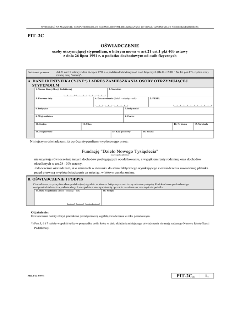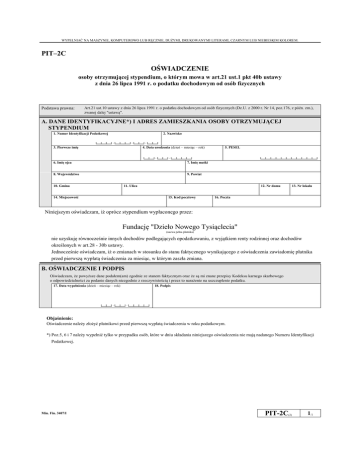 WYPEŁNIAĆ NA MASZYNIE, KOMPUTEROWO LUB RĘCZNIE, DUŻYMI, DRUKOWANYMI LITERAMI, CZARNYM LUB NIEBIESKIM KOLOREM. PIT–2C OŚWIADCZENIE osoby otrzymującej stypendium, o którym mowa w art.21 ust.1 pkt 40b ustawy z dnia 26 lipca 1991 r. o podatku dochodowym od osób fizycznych Podstawa prawna: Art.21 ust.10 ustawy z dnia 26 lipca 1991 r. o podatku dochodowym od osób fizycznych (Dz.U. z 2000 r. Nr 14, poz.176, z późn. zm.), zwanej dalej "ustawą". A. DANE IDENTYFIKACYJNE*) I ADRES ZAMIESZKANIA OSOBY OTRZYMUJĄCEJ STYPENDIUM 1. Numer Identyfikacji Podatkowej 3. Pierwsze imię 2. Nazwisko └─┴─┴─┘-└─┴─┴─┘-└─┴─┘-└─┴─┘ 4. Data urodzenia (dzień – miesiąc – rok) 5. PESEL └─┴─┘-└─┴─┘-└─┴─┴─┴─┘ 7. Imię matki 6. Imię ojca 8. Województwo └─┴─┴─┴─┴─┴─┴─┴─┴─┴─┴─┘ 9. Powiat 10. Gmina 11. Ulica 14. Miejscowość 12. Nr domu 15. Kod pocztowy 13. Nr lokalu 16. Poczta Niniejszym oświadczam, iż oprócz stypendium wypłaconego przez: Fundację "Dzieło Nowego Tysiąclecia" (nazwa pełna płatnika) nie uzyskuję równocześnie innych dochodów podlegających opodatkowaniu, z wyjątkiem renty rodzinnej oraz dochodów określonych w art.28 - 30b ustawy. Jednocześnie oświadczam, iż o zmianach w stosunku do stanu faktycznego wynikającego z oświadczenia zawiadomię płatnika przed pierwszą wypłatą świadczenia za miesiąc, w którym zaszła zmiana. B. OŚWIADCZENIE I PODPIS Oświadczam, że powyższe dane podałem(am) zgodnie ze stanem faktycznym oraz że są mi znane przepisy Kodeksu karnego skarbowego o odpowiedzialności za podanie danych niezgodnie z rzeczywistością i przez to narażenie na uszczuplenie podatku. 17. Data wypełnienia (dzień – miesiąc – rok) 18. Podpis └─┴─┘-└─┴─┘-└─┴─┴─┴─┘ Objaśnienie: Oświadczenie należy złożyć płatnikowi przed pierwszą wypłatą świadczenia w roku podatkowym. *) Poz.5, 6 i 7 należy wypełnić tylko w przypadku osób, które w dniu składania niniejszego oświadczenia nie mają nadanego Numeru Identyfikacji Podatkowej. Min. Fin. 3407/I PIT-2C(2) 1/1