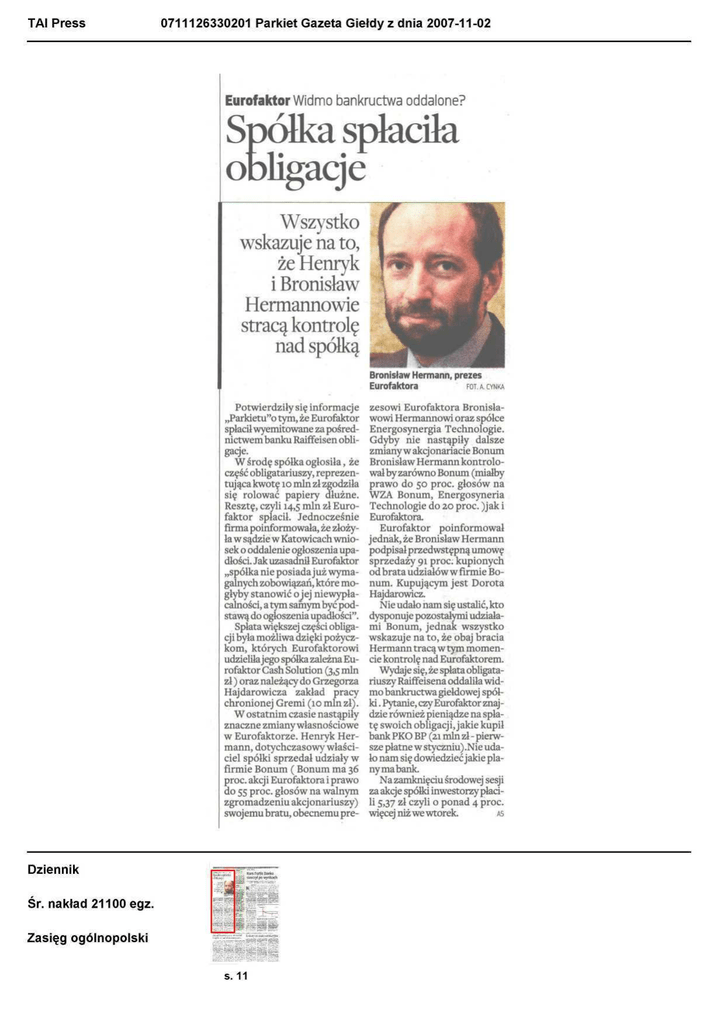 TAI Press 0711126330201 Parkiet Gazeta Giełdy z dnia 2007-11-02 Eurofaktor Widmo bankructwa oddalone? Spółkaspłaciła obligacje Wszystko wskazuje na to, że Henryk i Bronisław Hermannowie stracą kontrolę nad spółką Bronisław Hermann, prezes Eurofaktora FOT A. CYNKA Potwierdziły się informacje „Parkietu"o tym, że Eurofaktor spłacił wyemitowane za pośrednictwem banku Raiffeisen obligacje. W środę spółka ogłosiła, że część obligatariuszy, reprezentująca kwotę 10 min zł zgodziła się rolować papiery dłużne. Resztę, czyli 14,5 min zł Eurofaktor spłacił. Jednocześnie firma poinformowała, że złożyła w sądzie w Katowicach wniosek o oddalenie ogłoszenia upadłości. Jak uzasadnił Eurofaktor „spółka nie posiada już wymagalnych zobowiązań, które mogłyby stanowić o jej niewypłacalności, a tym samym być podstawą do ogłoszenia upadłości". Spłata większej części obligacji była możliwa dzięki pożyczkom, których Eurofaktorowi udzieliła jego spółka zależna Eurofaktor Cash Solution (3,5 min zł) oraz należący do Grzegorza Hajdarowicza zakład pracy chronionej Gremi (10 min zł). W ostatnim czasie nastąpiły znaczne zmiany własnościowe w Eurofaktorze. Henryk Hermann, dotychczasowy właściciel spółki sprzedał udziały w firmie Bonum ( Bonum ma 36 proc. akcji Eurofaktora i prawo do 55 proc. głosów na walnym zgromadzeniu akcjonariuszy) swojemu bratu, obecnemu pre- Dziennik Śr. nakład 21100egz. Zasięg ogólnopolski s. 11 zesowi Eurofaktora Bronisławowi Hermannowi oraz spółce Energosynergia Technologie. Gdyby nie nastąpiły dalsze zmiany w akcjonariacie Bonum Bronisław Hermann kontrolował by zarówno Bonum (miałby prawo do 50 proc. głosów na WZA Bonum, Energosyneria Technologie do 20 proc. )jak i Eurofaktora. Eurofaktor poinformował jednak, że Bronisław Hermann podpisał przedwstępną umowę sprzedaży 91 proc. kupionych od brata udziałów w firmie Bonum. Kupującym jest Dorota Hajdarowicz. Nie udało nam się ustalić, kto dysponuje pozostałymi udziałami Bonum, jednak wszystko wskazuje na to, że obaj bracia Hermann tracą w tym momencie kontrolę nad Eurofaktorem. Wydaje się, że spłata obligatariuszy Raiffeisena oddaliła widmo bankructwa giełdowej spółki . Pytanie, czy Eurofaktor znajdzie również pieniądze na spłatę swoich obligacji, jakie kupił bank PKO BP (21 min zł - pierwsze płatne w styczniu) .Nie udało nam się dowiedzieć jakie plany ma bank. Na zamknięciu środowej sesji za akcje spółki inwestorzy płacili 5,37 zł czyli o ponad 4 proc. więcej niż we wtorek. AS