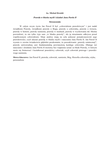 ks. Michał Drożdż Prawda w blasku myśli i działań Jana Pawła II Streszczenie W całym swym życiu Jan Paweł II był „człowiekiem prawdziwym” i jest nadal świadkiem Prawdy, świadkiem prawdy o Bogu, prawdy o człowieku, prawdy o świecie, prawdy w historii, prawdy sumienia, prawdy w mediach, prawdy w wychowaniu itd. Można powiedzieć, że nie tylko żyje sam „w blasku prawdy”, ale ją nieustannie odkrywa przed współczesnym człowiekiem. Moje analizy mają na celu pokazać ponadczasowość jego prawdziwości, czyli ukazać prawdę w blasku myśli i nauczania Jana Pawła II. Jan Paweł II wyraża w swoim świadectwie głębokie przekonanie, że poszukiwanie „prawdy ostatecznej”, prawdy uniwersalnej, jest fundamentalną powinnością każdego człowieka. Dlatego też nauczanie i działanie Jana Pawła II możemy bez wątpienia uznać za blask Prawdy, w którym może się formować i kształtować prawdziwy człowiek, czyli człowiek prawego i prawdziwego sumienia. Słowa kluczowe: Jan Paweł II, prawda, człowiek, sumienie, Bóg, filozofia człowieka, etyka, personalizm