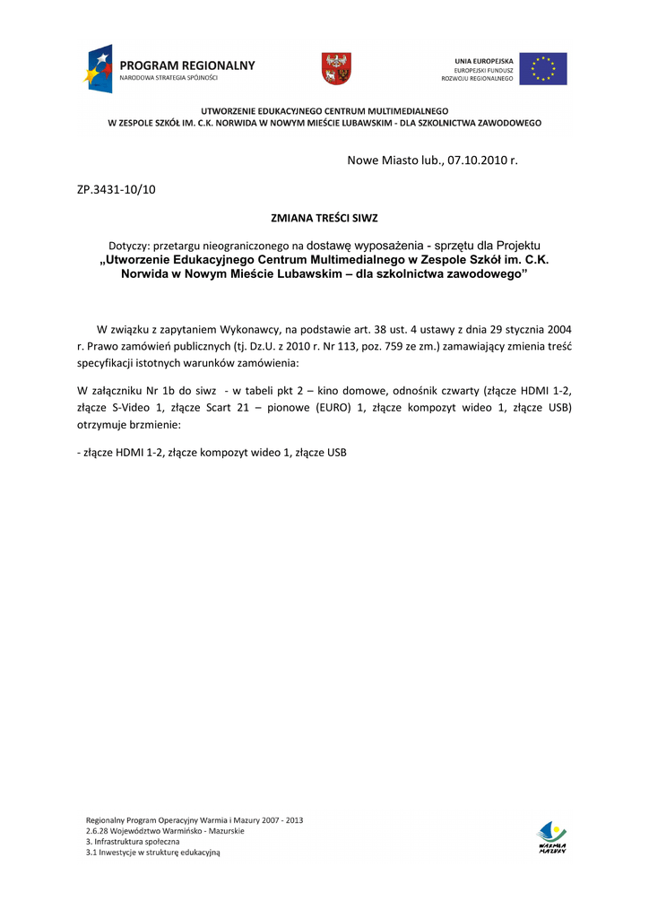 Nowe Miasto lub., 07.10.2010 r. ZP.3431-10/10 ZMIANA TREŚCI SIWZ Dotyczy: przetargu nieograniczonego na dostawę wyposażenia - sprzętu dla Projektu „Utworzenie Edukacyjnego Centrum Multimedialnego w Zespole Szkół im. C.K. Norwida w Nowym Mieście Lubawskim – dla szkolnictwa zawodowego” W związku z zapytaniem Wykonawcy, na podstawie art. 38 ust. 4 ustawy z dnia 29 stycznia 2004 r. Prawo zamówień publicznych (tj. Dz.U. z 2010 r. Nr 113, poz. 759 ze zm.) zamawiający zmienia treść specyfikacji istotnych warunków zamówienia: W załączniku Nr 1b do siwz - w tabeli pkt 2 – kino domowe, odnośnik czwarty (złącze HDMI 1-2, złącze S-Video 1, złącze Scart 21 – pionowe (EURO) 1, złącze kompozyt wideo 1, złącze USB) otrzymuje brzmienie: - złącze HDMI 1-2, złącze kompozyt wideo 1, złącze USB