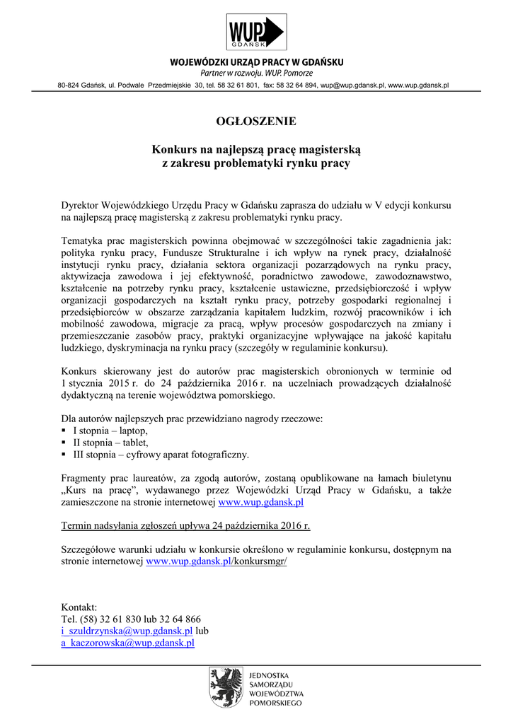 80-824 Gdańsk, ul. Podwale Przedmiejskie 30, tel. 58 32 61 801, fax: 58 32 64 894, [email protected], www.wup.gdansk.pl OGŁOSZENIE Konkurs na najlepszą pracę magisterską z zakresu problematyki rynku pracy Dyrektor Wojewódzkiego Urzędu Pracy w Gdańsku zaprasza do udziału w V edycji konkursu na najlepszą pracę magisterską z zakresu problematyki rynku pracy. Tematyka prac magisterskich powinna obejmować w szczególności takie zagadnienia jak: polityka rynku pracy, Fundusze Strukturalne i ich wpływ na rynek pracy, działalność instytucji rynku pracy, działania sektora organizacji pozarządowych na rynku pracy, aktywizacja zawodowa i jej efektywność, poradnictwo zawodowe, zawodoznawstwo, kształcenie na potrzeby rynku pracy, kształcenie ustawiczne, przedsiębiorczość i wpływ organizacji gospodarczych na kształt rynku pracy, potrzeby gospodarki regionalnej i przedsiębiorców w obszarze zarządzania kapitałem ludzkim, rozwój pracowników i ich mobilność zawodowa, migracje za pracą, wpływ procesów gospodarczych na zmiany i przemieszczanie zasobów pracy, praktyki organizacyjne wpływające na jakość kapitału ludzkiego, dyskryminacja na rynku pracy (szczegóły w regulaminie konkursu). Konkurs skierowany jest do autorów prac magisterskich obronionych w terminie od 1 stycznia 2015 r. do 24 października 2016 r. na uczelniach prowadzących działalność dydaktyczną na terenie województwa pomorskiego. Dla autorów najlepszych prac przewidziano nagrody rzeczowe: I stopnia – laptop, II stopnia – tablet, III stopnia – cyfrowy aparat fotograficzny. Fragmenty prac laureatów, za zgodą autorów, zostaną opublikowane na łamach biuletynu „Kurs na pracę”, wydawanego przez Wojewódzki Urząd Pracy w Gdańsku, a także zamieszczone na stronie internetowej www.wup.gdansk.pl Termin nadsyłania zgłoszeń upływa 24 października 2016 r. Szczegółowe warunki udziału w konkursie określono w regulaminie konkursu, dostępnym na stronie internetowej www.wup.gdansk.pl/konkursmgr/ Kontakt: Tel. (58) 32 61 830 lub 32 64 866 [email protected] lub [email protected]