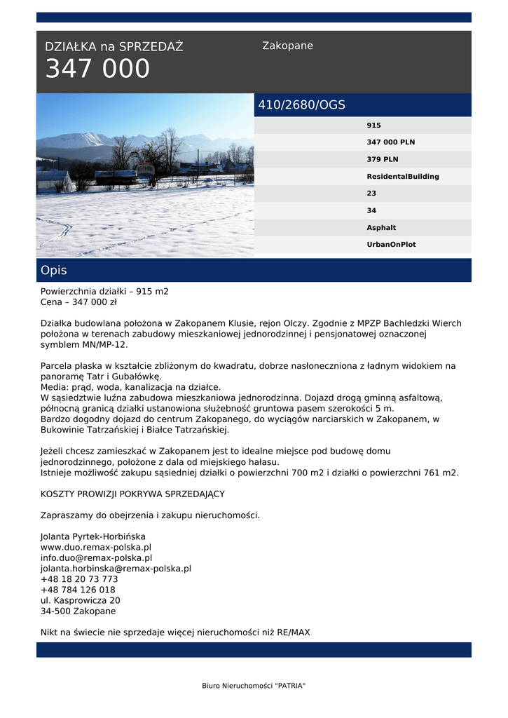 Zakopane DZIAŁKA na SPRZEDAŻ 347 000 410/2680/OGS 915 347 000 PLN 379 PLN ResidentalBuilding 23 34 Asphalt UrbanOnPlot Opis Powierzchnia działki – 915 m2 Cena – 347 000 zł Działka budowlana położona w Zakopanem Klusie, rejon Olczy. Zgodnie z MPZP Bachledzki Wierch położona w terenach zabudowy mieszkaniowej jednorodzinnej i pensjonatowej oznaczonej symblem MN/MP-12. Parcela płaska w kształcie zbliżonym do kwadratu, dobrze nasłoneczniona z ładnym widokiem na panoramę Tatr i Gubałówkę. Media: prąd, woda, kanalizacja na działce. W sąsiedztwie luźna zabudowa mieszkaniowa jednorodzinna. Dojazd drogą gminną asfaltową, północną granicą działki ustanowiona służebność gruntowa pasem szerokości 5 m. Bardzo dogodny dojazd do centrum Zakopanego, do wyciągów narciarskich w Zakopanem, w Bukowinie Tatrzańskiej i Białce Tatrzańskiej. Jeżeli chcesz zamieszkać w Zakopanem jest to idealne miejsce pod budowę domu jednorodzinnego, położone z dala od miejskiego hałasu. Istnieje możliwość zakupu sąsiedniej działki o powierzchni 700 m2 i działki o powierzchni 761 m2. KOSZTY PROWIZJI POKRYWA SPRZEDAJĄCY Zapraszamy do obejrzenia i zakupu nieruchomości. Jolanta Pyrtek-Horbińska www.duo.remax-polska.pl [email protected] [email protected] +48 18 20 73 773 +48 784 126 018 ul. Kasprowicza 20 34-500 Zakopane Nikt na świecie nie sprzedaje więcej nieruchomości niż RE/MAX Biuro Nieruchomości "PATRIA" Biuro Nieruchomości "PATRIA" tel. 91 4886426, 91 4886427, 507 124 122 email: [email protected] Biuro Nieruchomości "PATRIA" Powered by TCPDF (www.tcpdf.org)