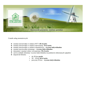 Cennik usług montażowych: ➔ ➔ ➔ ➔ ➔ ➔ ➔ montaż nawiewnika w stolarce PCV: 60 zł netto montaż nawiewnika w stolarce drewnianej: 70 zł netto montaż nawiewnika w stolarce aluminiowej – wycena indywidualna montaż nawiewnika ściennego – wycena indywidualna demontaż i montaż rolety wewnętrznej: 50 zł netto serwis stolarki okiennej: wycena indywidualna na podstawie dokonanych oględzin dojazd do Klienta: ➢ do 20 km gratis ➢ 20 – 50 km 40 zł netto ➢ powyżej 50 km – wycena indywidualna