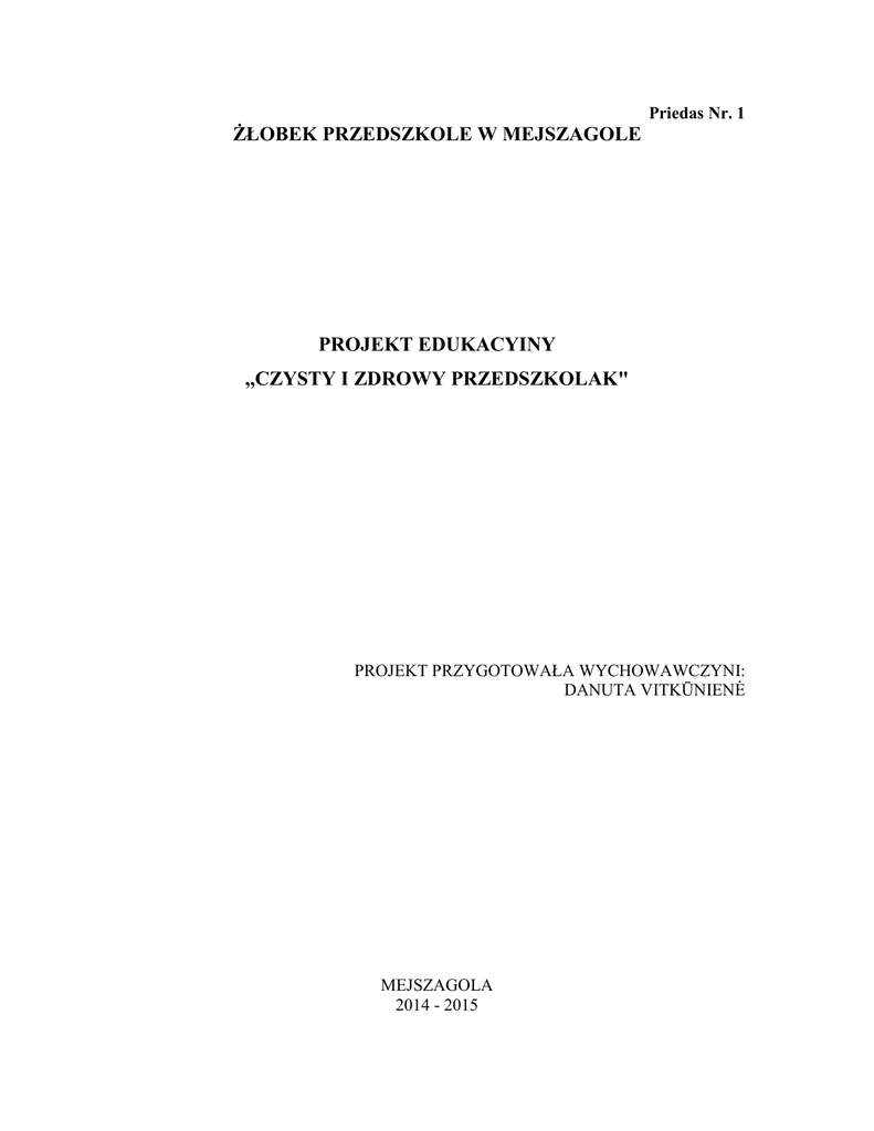 ŻŁOBEK PRZEDSZKOLE W MEJSZAGOLE Priedas Nr. 1 PROJEKT EDUKACYINY ,,CZYSTY I ZDROWY PRZEDSZKOLAK" PROJEKT PRZYGOTOWAŁA WYCHOWAWCZYNI: DANUTA VITKŪNIENĖ MEJSZAGOLA 2014 - 2015 Przedszkole jest optymalnym miejscem dla rozpaczęcia działalności w zakresie edukacji zdrowotnej. Dziecko przebywające w przedszkolu zdobywa podstawowe informacje i umiejętności, niezbędne do wzmacniania zdrowia w sposób naturalny w powiązaniu z zabawą, posiłkami, zabiegami higienicznymi i wypoczynkiem. Cel ogólny: Kształtowanie umiejętności dbania o własne zdrowie. Cele szczegółowe: 1. Zapoznanie się ze znaczeniem zdrowej żywności, rozumienie konieczności spożywania owoców i warzyw. 2. Rozbudzanie zainteresowania własnym zdrowiem poprzez gimnastykę poranną, aktywność ruchową na świeżym powietrzu. 3. Kształtowanie nawyków higieniczno kulturalnuch, wpajania dbania o czystość. Uczestnicy: dzieci w wieku od 1,5 do 6 lat. Grupy przedszkolne: "Biedronki", "Ptaszeczki", "Krasnoludki", "Motyle" Miejsce wykonania: żlobek przedszkole Koszt: z funduszu grupy Partnerzy: pielęgniarka, rodzice, wychowawczynie. Czas wykonania projektu: 2014.10 - 2015.04 Plan wykonania projektu Tema Witaminki dla chłopczyka i dziewczynki Priemonės pavadinimas 1. Wystawa prac plastycznych "Kukiełki z warzyw" 2. Dzień marchewki 3. Owocowy dzień wykonanie sałatki z owoców. 4. Picie herbaty owocowo ziołowej. W zdrowym ciele zdrowy duch Įgyvendinimo vieta Dalyviai Įgyvendini mo laikas Żlobek Przedszkole Grupy: "Biedronki", "Ptaszeczki" Wrzesień Grupa żłobkowa Grupa "Biedronki" Październik Grupa żłobkowa Priemon ių vertinim o kriterijai Wystawa Zdjęcia, maski Zdjęcia Grupa "Biedronki" Listopad Atsakingi asmenys D. Vitkūnienė D. Vitkūnienė D. Vitkūnienė Zdjęcia Grupy przedszkola Grupy: Listopad "Biedronki" "Ptaszeczki" "Krasnoludki" "Motyle" Grupy: Grudzień "Biedronki" "Krasnoludki" 1. Zabawy w formie opowieści ruchowej "Uprawiamy sporty" Sala Przedszkola 2. Zabawy konkurencje sportowe na śniegu Podwórze przedszkola Grupy: "Biedronki" "Ptaszeczki" "Krasnoludki" "Motyle" Grudzień 3. Ćwiczenia przeciw płaskostopiu stworzenie Sala Przedszkola Grupy: "Biedronki", "Ptaszeczki" Styczeń D. Vitkūnienė Zdjęcia D. Vitkūnienė Zdjęcia D. Vitkūnienė Ścieżka zdrowia D. Vitkūnienė ścieżki zdrowia. Jestem czyścioszek Styczeń Zdjęcia D. Vitkūnienė Luty Zdjęcia D. Vitkūnienė Luty Zdjęcia, Prace plastycz ne Grupa "Biedronki" Marzec ogródek D. Vitkūnienė Grupa "Biedronki" Marzec Filmy D. Vitkūnienė 4. Recepta na zdrowie" Konkurs dla rodziców i dzieci. 1. Stworzenie w grupie kącika czystości Szatnia grupy Grupa "Biedronki" Grupa żłobkowa Grupa "Biedronki" 2. Spotkanie z pielęgniarką w celu rozwijania u dzieci prawidłowych nawyków higienicznych Grupa żłobkowa Grupa "Biedronki" 3. Zielona hodowla zakładamy hodowlę szczypiorku i pietruszki Grupa żłobkowa 4. Wspólne oglądanie filmów animacyjnych : "Brudasek i czyścioszek" Grupa żłobkowa Podsumowanie projektu edukacyjnego: Prezentacja multimedialna D. Vitkūnienė
