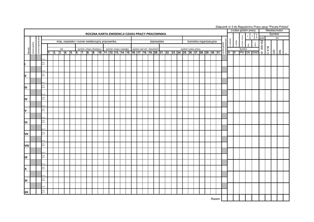 6. 7. 8. 9. wymiar urlopu (zaległy) opieka nad zdr. dzieckiem system czasu pracy 10. 11. 12. 13. 14. 15. 16. 17. 18. 19. 20. 21. 22. 23. 24. 25. 26. 27. 28. 29. 30. 31. symbol I liczba godzin symbol II liczba godzin symbol III liczba godzin symbol IV liczba godzin symbol V liczba godzin symbol VI liczba godzin symbol VII liczba godzin symbol VIII liczba godzin symbol IX liczba godzin symbol X liczba godzin symbol XI liczba godzin symbol XII liczba godzin Razem 100% w godzina ch nadliczb owych 50% w porze nocnej Symbol N S PN GN GNO I 5. DS. wymiar urlopu (bieżący) 4. dni OD 3. godz CKM 2. komórka organizacyjna W WN WZ rok 1. stanowisko w święta imię, nazwisko i numer ewidencyjny pracownika w niedziele norma indywidualna norma ogólna Miesiąc ROCZNA KARTA EWIDENCJI CZASU PRACY PRACOWNIKA Liczba godzin przepracowanych Załącznik nr 3 do Regulaminu Pracy ppup "Poczta Polska" Liczba godzin pracy Nieobecności Symbol Objaśnienie norma ogólna - obowiązujący pracownika wymiar czasu pracy wynikający z dni roboczych w miesiącu i wymiaru zatrudnienia norma indywidualna - norma ogólna pomniejszona o liczbę godzin usprawiedliwionej nieobecności w pracy, przypadających do przepracowania w czasie tej nieobecności, zgodnie z przyjętym rozkładem czasu pracy liczba godzin przepracowanych - godziny faktycznie przepracowane + godziny nieobecności Kolorem zaznaczenie niedziel i świąt Symbol oznacza : W - urlop wypoczynkowy WN - urlop na żądanie WZ - urlop zaległy C - zwolnienie chorobowe M - urlop macierzyński K - opieka nad chorym OD - opieka nad zdrowym dzieckiem DS. - szkolenie I - inne , w tym U - nieobecność usprawiedliwiona płatna UA - nieobenność usprawiedliwiona niepłatna N - obecność nieusprawiedliwiona P - posiedzenie zarządu związków zawodowych N - praca w niedzielę S - praca w święta PN - praca w porze nocnej - w przypadku pracy przypadającej częściowo w porze nocnej i częściowo poza porą nocną należy stosowac zapis : symbol PN 4 PN 4 ( 4 to liczba godzin pracy w porze nocnej) 8 liczba godzin GN - praca w godzianach nadliczbowych 50% - należy stosować zapis : symbol GN 4 GN 4 ( liczba 4 godzin nadliczbowych przepracowanych w danym dniu) liczba godzin 12 GNO - praca w godzianach nadliczbowych 100% - należy stosować zapis : symbol GNO4 GNO 4 ( liczba 4 godzin nadliczbowych przepracowanych w danym dniu) liczba godzin 12