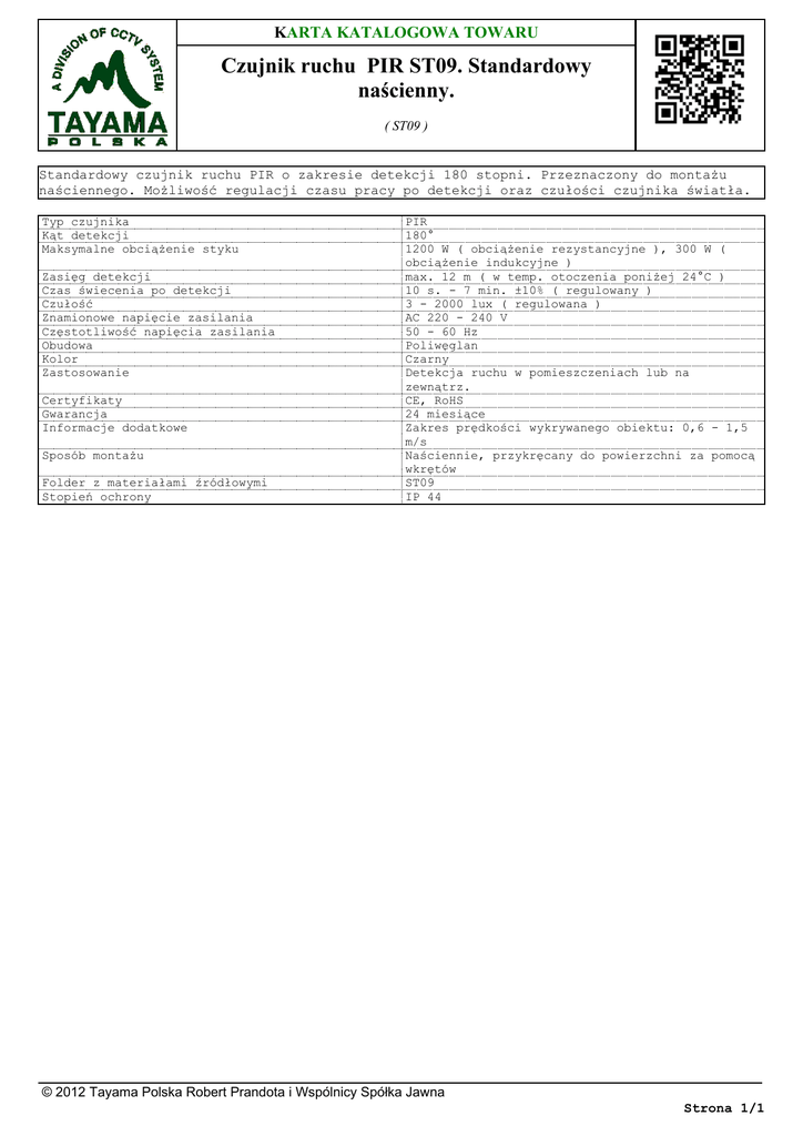 KARTA KATALOGOWA TOWARU Czujnik ruchu PIR ST09. Standardowy naścienny. ( ST09 ) Standardowy czujnik ruchu PIR o zakresie detekcji 180 stopni. Przeznaczony do montażu naściennego. Możliwość regulacji czasu pracy po detekcji oraz czułości czujnika światła. Typ czujnika Kąt detekcji Maksymalne obciążenie styku Zasięg detekcji Czas świecenia po detekcji Czułość Znamionowe napięcie zasilania Częstotliwość napięcia zasilania Obudowa Kolor Zastosowanie Certyfikaty Gwarancja Informacje dodatkowe Sposób montażu Folder z materiałami źródłowymi Stopień ochrony PIR 180° 1200 W ( obciążenie rezystancyjne ), 300 W ( obciążenie indukcyjne ) max. 12 m ( w temp. otoczenia poniżej 24°C ) 10 s. - 7 min. ±10% ( regulowany ) 3 - 2000 lux ( regulowana ) AC 220 - 240 V 50 - 60 Hz Poliwęglan Czarny Detekcja ruchu w pomieszczeniach lub na zewnątrz. CE, RoHS 24 miesiące Zakres prędkości wykrywanego obiektu: 0,6 - 1,5 m/s Naściennie, przykręcany do powierzchni za pomocą wkrętów ST09 IP 44 © 2012 Tayama Polska Robert Prandota i Wspólnicy Spółka Jawna Strona 1/1