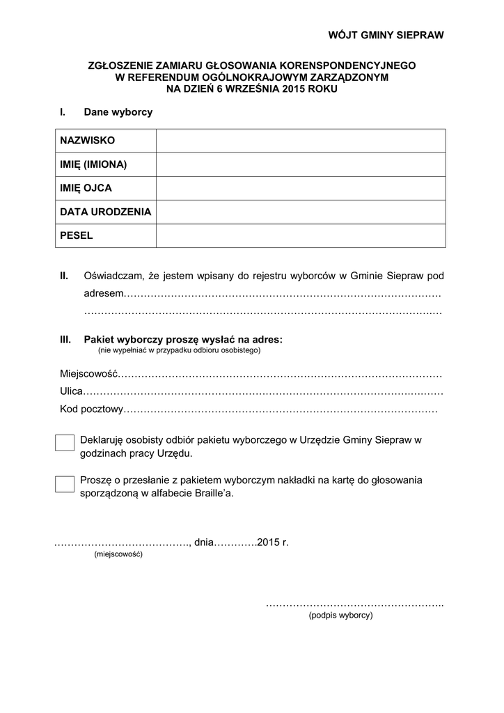 WÓJT GMINY SIEPRAW ZGŁOSZENIE ZAMIARU GŁOSOWANIA KORENSPONDENCYJNEGO W REFERENDUM OGÓLNOKRAJOWYM ZARZĄDZONYM NA DZIEŃ 6 WRZEŚNIA 2015 ROKU I. Dane wyborcy NAZWISKO IMIĘ (IMIONA) IMIĘ OJCA DATA URODZENIA PESEL II. Oświadczam, że jestem wpisany do rejestru wyborców w Gminie Siepraw pod adresem…………………………………………………………………………………. ………………………………………………………………………………………….… III. Pakiet wyborczy proszę wysłać na adres: (nie wypełniać w przypadku odbioru osobistego) Miejscowość…………………………………………………………………………………… Ulica…………………………………………………………………………………….….…… Kod pocztowy………………………………………………………………………………… Deklaruję osobisty odbiór pakietu wyborczego w Urzędzie Gminy Siepraw w godzinach pracy Urzędu. Proszę o przesłanie z pakietem wyborczym nakładki na kartę do głosowania sporządzoną w alfabecie Braille’a. …………………………………., dnia………….2015 r. (miejscowość) …………………………………………….. (podpis wyborcy)