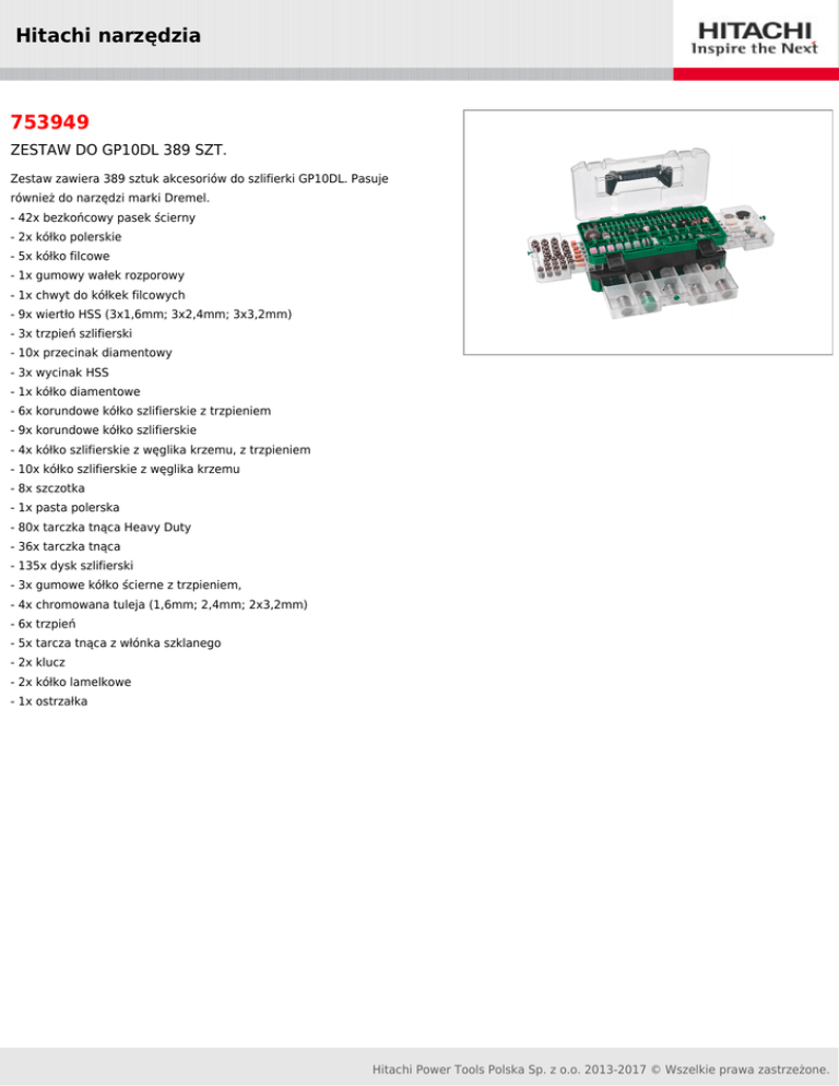 Hitachi narzędzia 753949 ZESTAW DO GP10DL 389 SZT. Zestaw zawiera 389 sztuk akcesoriów do szlifierki GP10DL. Pasuje również do narzędzi marki Dremel. - 42x bezkońcowy pasek ścierny - 2x kółko polerskie - 5x kółko filcowe - 1x gumowy wałek rozporowy - 1x chwyt do kółkek filcowych - 9x wiertło HSS (3x1,6mm; 3x2,4mm; 3x3,2mm) - 3x trzpień szlifierski - 10x przecinak diamentowy - 3x wycinak HSS - 1x kółko diamentowe - 6x korundowe kółko szlifierskie z trzpieniem - 9x korundowe kółko szlifierskie - 4x kółko szlifierskie z węglika krzemu, z trzpieniem - 10x kółko szlifierskie z węglika krzemu - 8x szczotka - 1x pasta polerska - 80x tarczka tnąca Heavy Duty - 36x tarczka tnąca - 135x dysk szlifierski - 3x gumowe kółko ścierne z trzpieniem, - 4x chromowana tuleja (1,6mm; 2,4mm; 2x3,2mm) - 6x trzpień - 5x tarcza tnąca z włónka szklanego - 2x klucz - 2x kółko lamelkowe - 1x ostrzałka Hitachi Power Tools Polska Sp. z o.o. 2013-2017 © Wszelkie prawa zastrzeżone.