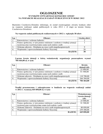 OGŁOSZENIE WYNIKÓW OTWARTEGO KONKURSU OFERT NA WSPARCIE REALIZACJI ZADAŃ PUBLICZNYCH W ROKU 2012 Burmistrz Czechowic-Dziedzic informuje, że został rozstrzygnięty otwarty konkurs ofert na wsparcie realizacji zadań publicznych w roku 2012 r. (I etap) na terenie Gminy Czechowice-Dziedzice. Na wsparcie zadań publicznych realizowanych w 2012 r. wpłynęło 38 ofert: Lp. Obszar: Liczba ofert: 1. Ratownictwo i ochrona ludności 2 2. Pomoc społeczna, w tym pomoc rodzinom i osobom w trudnej sytuacji 1 życiowej oraz wyrównywanie szans tych rodzin i osób 3. Ochrona zdrowia - Działania na rzecz osób niepełnosprawnych 9 4. Wspieranie i upowszechnianie kultury fizycznej 26 RAZEM: 38 Łączna kwota dotacji o którą wnioskowały organizacje pozarządowe wynosi 784 464,00 zł, w tym: Lp. 1. 2. 3. 4. Obszar: Ratownictwo i ochrona ludności Pomoc społeczna, w tym pomoc rodzinom i osobom w trudnej sytuacji życiowej oraz wyrównywanie szans tych rodzin i osób Ochrona zdrowia - Działania na rzecz osób niepełnosprawnych Wspieranie i upowszechnianie kultury fizycznej RAZEM: Kwota dotacji (zł): 25 960,00 81 500,00 110 700,00 566 304,00 784 464,00 Środki przeznaczone i zabezpieczone w budżecie na wsparcie realizacji zadań w 2012 r. wynoszą 445 850,00 zł, w tym: Lp. 2. 3. 4. 6. Obszar: Wnioskowana kwota dotacji (zł): Ratownictwo i ochrona ludności 25 000,00 Pomoc społeczna, w tym pomoc rodzinom i osobom w trudnej sytuacji 81 500,00 życiowej oraz wyrównywane szans tych rodzin i osób Ochrona Zdrowia - Działania na rzecz osób niepełnosprawnych 80 050,00 Wspieranie i upowszechnianie kultury fizycznej 259 300,00 RAZEM: 445 850,00 1 ZADANIA PRZYJĘTE DO REALIZACJI W 2012 R. W obszarze Ratownictwo i ochrona ludności przyjęto do realizacji 2 oferty: Lp. Nazwa zadania: Nazwa organizacji: Kwota dotacji (zł): 1. Bezpieczeństwo Polski Czerwony Krzyż, 24 040,00 i zabezpieczenie medyczne Zarząd Rejonowy podczas imprez masowych, w Bielsku-Białej, nauka udzielania pomocy ul. Sobieskiego 6 i organizacja zawodów pierwszej pomocy 2. Manewry technicznoZwiązek Harcerstwa Polskiego 960,00 obronne; warsztaty z zakresu Komenda Hufca pierwszej pomocy Czechowice-Dziedzice ul. Narutowicza 4 RAZEM: 25 000,00 W obszarze Pomoc społeczna, w tym pomoc rodzinom i osobom w trudnej sytuacji życiowej oraz wyrównywanie szans tych rodzin i osób przyjęto do realizacji 1 ofertę: Lp. Nazwa zadania: Nazwa organizacji: Kwota dotacji (zł): 1. Prowadzenie Świetlicy Towarzystwo Charytatywne 81 500,00 Profilaktycznoim. Ojca Pio, Koło nr 1, Wychowawczej dla dzieci Czechowice-Dziedzice pochodzących z rodzin ul. Mickiewicza 37 zagrożonych marginalizacją społeczną RAZEM: 81 500,00 W obszarze Ochrona zdrowia - Działania na rzecz osób niepełnosprawnych przyjęto do realizacji 8 ofert: Lp. Nazwa zadania: Nazwa organizacji: Kwota dotacji (zł): 1. Programy rehabilitacyjnoPolskie Stowarzyszenie 8 000,00 wychowawcze dla dzieci na Rzecz Osób i młodzieży ze sprzężonymi z Upośledzeniem Umysłowym niepełnosprawnościami Pszczyna ul. Antesa 1 2. 3. Programy rehabilitacyjnowychowawcze dla osób dorosłych ze sprzężonymi niepełnosprawnościami (tzw. „dorosłe dzieci”) Działalność na rzecz osób niepełnosprawnych obejmująca przewóz osób niepełnosprawnych, prowadzenie terapii, rehabilitacji oraz działania integracyjne Polskie Stowarzyszenie na Rzecz Osób z Upośledzeniem Umysłowym Pszczyna ul. Antesa 1 30 000,00 Caritas Archidiecezji Katowickiej, Ośrodek Matka Boża Różańcowa Pszczyna ul. Św. Jadwigi 4 12 000,00 2 4. 5. 6. 7. 8. Działania na rzecz osób niepełnosprawnych pn. Umożliwienie młodzieży niepełnosprawnej intelektualnie aktywnego spędzania czasu pod hasłem: „Miłośnicy przyrody, sportu, kultury i rekreacji” Kompleksowa rehabilitacja dzieci niewidomych i niedowidzących ze sprzężonymi niepełnosprawnościami w wieku do lat 7 Rewalidacja osób niepełnosprawnych poprzez hipoterapię, zajęcia plastyczno-techniczne oraz rehabilitację ruchową z instruktażem Integracja społeczna jako terapia dla dzieci niepełnosprawnych, ich rodziców, rodzeństwa oraz opiekunów Stowarzyszenie na Rzecz Osób Niepełnosprawnych „ Razem” Bielsko-Biała Pl. Opatrzności Bożej 20 2 050,00 Regionalna Fundacja Pomocy Niewidomym Chorzów ul. Dąbrowskiego 55a 3 000,00 Stowarzyszenie Rodziców i Osób Niepełnosprawnych „Wsparcie” Czechowice-Dziedzice ul. Traugutta 11 10 000,00 Stowarzyszenie Rodziców i Osób Niepełnosprawnych „Wsparcie” Czechowice-Dziedzice ul. Traugutta 11 5 000,00 Pomoc rodzicom osób niepełnosprawnych w trudnej sytuacji życiowej „Rehabilitacja stacjonarna osób niepełnosprawnych” Stowarzyszenie Rodziców i Osób Niepełnosprawnych „Wsparcie” Czechowice-Dziedzice ul. Traugutta 11 10 000,00 RAZEM: 80 050,00 W obszarze Wspieranie i upowszechnianie kultury fizycznej przyjęto do realizacji 23 oferty: Lp. Nazwa zadania: 1. Szkolenie dzieci i młodzieży w zakresie kajakarstwa 2. Szkolenie dzieci i młodzieży w sekcji piłki nożnej 3. Szkolenie dzieci i młodzieży w sekcji piłki nożnej Nazwa organizacji: Miejski Klub Sportowy Czechowice-Dziedzice ul. Niepodległości 42 Uczniowski Międzyszkolny Klub Sportowy „Trójka” Czechowice-Dziedzice ul. Łukasiewicza 37 Ludowy Klub Sportowy Ligota „Centrum” Ligota ul. Wapienicka Kwota dotacji (zł): 28 000,00 25 000,00 8 500,00 3 4. Szkolenie dzieci i młodzieży w sekcji piłki nożnej 5. Szkolenie dzieci i młodzieży w sekcji piłki nożnej 6. Szkolenie dzieci i młodzieży w sekcji piłki nożnej 7. Szkolenie dzieci i młodzieży w zakresie siatkówki 8. Szkolenie dzieci i młodzieży w zakresie siatkówki 9. Szkolenie dzieci i młodzieży w zakresie koszykówki 10. Szkolenie dzieci i młodzieży w zakresie koszykówki chłopców 11. Szkolenie dzieci i młodzieży w ramach sekcji judo 12. Szkolenie dzieci i młodzieży w sekcji lekkiej atletyki 13. Szkolenie dzieci i młodzieży w zakresie 