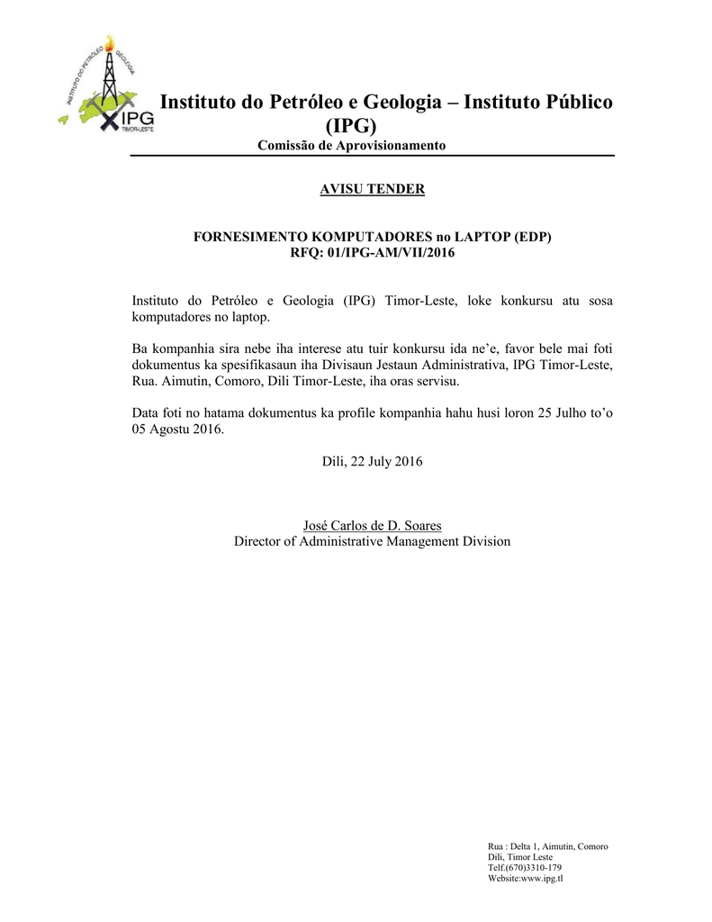 Instituto do Petróleo e Geologia – Instituto Público (IPG) Comissão de Aprovisionamento AVISU TENDER FORNESIMENTO KOMPUTADORES no LAPTOP (EDP) RFQ: 01/IPG-AM/VII/2016 Instituto do Petróleo e Geologia (IPG) Timor-Leste, loke konkursu atu sosa komputadores no laptop. Ba kompanhia sira nebe iha interese atu tuir konkursu ida ne’e, favor bele mai foti dokumentus ka spesifikasaun iha Divisaun Jestaun Administrativa, IPG Timor-Leste, Rua. Aimutin, Comoro, Dili Timor-Leste, iha oras servisu. Data foti no hatama dokumentus ka profile kompanhia hahu husi loron 25 Julho to’o 05 Agostu 2016. Dili, 22 July 2016 José Carlos de D. Soares Director of Administrative Management Division Rua : Delta 1, Aimutin, Comoro Dili, Timor Leste Telf.(670)3310-179 Website:www.ipg.tl