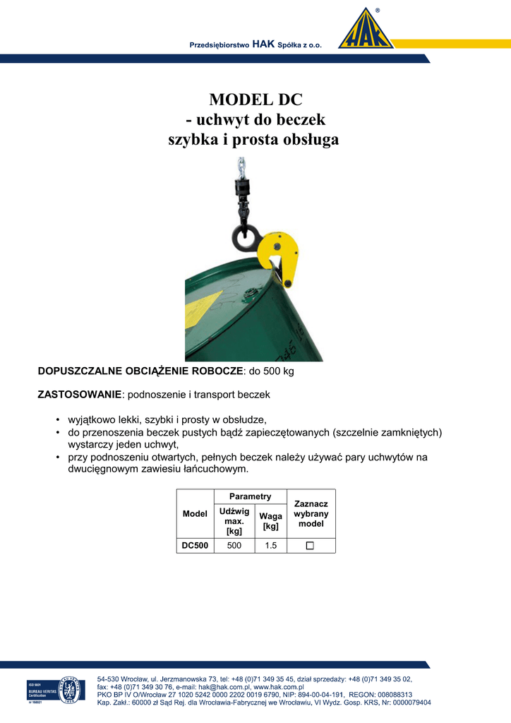 MODEL DC - uchwyt do beczek szybka i prosta obsługa DOPUSZCZALNE OBCIĄŻENIE ROBOCZE: do 500 kg ZASTOSOWANIE: podnoszenie i transport beczek • wyjątkowo lekki, szybki i prosty w obsłudze, • do przenoszenia beczek pustych bądź zapieczętowanych (szczelnie zamkniętych) wystarczy jeden uchwyt, • przy podnoszeniu otwartych, pełnych beczek należy używać pary uchwytów na dwucięgnowym zawiesiu łańcuchowym. Parametry Model Udźwig max. [kg] Waga [kg] DC500 500 1.5 Zaznacz wybrany model