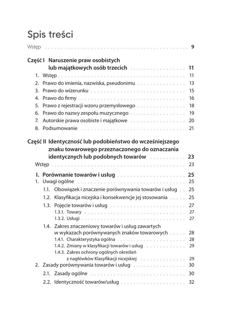 Spis treści Wstęp . . . . . . . . . . . . . . . . . . . . . . . . . . . . . . . . . . . . . . . . . . . . Część I Naruszenie praw osobistych lub majątkowych osób trzecich . . . . . . . . . . . . . . . . . 1. 2. 3. 4. 5. 6. 7. 8. Wstęp . . . . . . . . . . . . . . . . . . . . . . . . . . . . . . . . . . . . . . . Prawo do imienia, nazwiska, pseudonimu . . . . . . . . . . . . . . . Prawo do wizerunku . . . . . . . . . . . . . . . . . . . . . . . . . . . . . Prawo do firmy . . . . . . . . . . . . . . . . . . . . . . . . . . . . . . . . . Prawo z rejestracji wzoru przemysłowego . . . . . . . . . . . . . . . Prawo do nazwy zespołu muzycznego . . . . . . . . . . . . . . . . . Autorskie prawa osobiste i majątkowe . . . . . . . . . . . . . . . . . Podsumowanie . . . . . . . . . . . . . . . . . . . . . . . . . . . . . . . . 9 11 11 13 15 16 18 19 20 21 Część II Identyczność lub podobieństwo do wcześniejszego znaku towarowego przeznaczonego do oznaczania identycznych lub podobnych towarów . . . . . . . . . . . 23 Wstęp . . . . . . . . . . . . . . . . . . . . . . . . . . . . . . . . . . . . . . . . . 23 I. Porównanie towarów i usług . . . . . . . . . . . . . . . . . . . . . 1. Uwagi ogólne . . . . . . . . . . . . . . . . . . . . . . . . . . . . . . . . . 1.1. Obowiązek i znaczenie porównywania towarów i usług . . 1.2. Klasyfikacja nicejska i konsekwencje jej stosowania . . . . . 1.3. Pojęcie towarów i usług . . . . . . . . . . . . . . . . . . . . . . . 1.3.1. Towary . . . . . . . . . . . . . . . . . . . . . . . . . . . . . . . 1.3.2. Usługi . . . . . . . . . . . . . . . . . . . . . . . . . . . . . . . . 1.4. Zakres znaczeniowy towarów i usług zawartych w wykazach porównywanych znaków towarowych . . . . . 1.4.1. Charakterystyka ogólna . . . . . . . . . . . . . . . . . . . . . 1.4.2. Zmiany w klasyfikacji towarów i usług . . . . . . . . . . . . 25 1.4.3. Zakres ochrony ogólnych określeń z nagłówków Klasyfikacji nicejskiej . . . . . . . . . . . . . . 25 25 25 27 27 27 28 28 29 29 2. Zasady porównywania towarów i usług . . . . . . . . . . . . . . . . 30 2.1. Zasady ogólne . . . . . . . . . . . . . . . . . . . . . . . . . . . . . 30 2.2. Identyczność towarów/usług . . . . . . . . . . . . . . . . . . . 32 2.3. Podobieństwo towarów/usług . . . . . . . . . . . . . . . . . . 35 2.3.1. Poszczególne kryteria podobieństwa . . . . . . . . . . . . . 36 2.3.2. Wynik oceny podobieństwa towarów/usług . . . . . . . . . 40 II. Porównanie oznaczeń . . . . . . . . . . . . . . . . . . . . . . . . . . 41 1. Uwagi ogólne . . . . . . . . . . . . . . . . . . . . . . . . . . . . . . . . . 41 1.1. Obowiązek i znaczenie porównywania oznaczeń . . . . . . 41 1.2. Zasady ogólne porównywania oznaczeń . . . . . . . . . . . . 2. Identyczność oznaczeń . . . . . . . . . . . . . . . . . . . . . . . . . . . 41 42 2.1. Definicja . . . . . . . . . . . . . . . . . . . . . . . . . . . . . . . . . 3. Podobieństwo oznaczeń . . . . . . . . . . . . . . . . . . . . . . . . . . 42 43 3.1. Definicja . . . . . . . . . . . . . . . . . . . . . . . . . . . . . . . . . 43 3.2. Porównanie wizualne . . . . . . . . . . . . . . . . . . . . . . . . 44 3.3. Porównanie fonetyczne . . . . . . . . . . . . . . . . . . . . . . . 46 3.4. Porównanie znaczeniowe . . . . . . . . . . . . . . . . . . . . . . 4. Reguły kolizyjne wypracowane w orzecznictwie . . . . . . . . . . 5. Wynik porównywania oznaczeń . . . . . . . . . . . . . . . . . . . . . 47 50 52 III. Niebezpieczeństwo wprowadzenia w błąd . . . . . . . . . 1. Niebezpieczeństwo wprowadzenia w błąd – definicja . . . . . . 53 53 1.1. Rodzaje . . . . . . . . . . . . . . . . . . . . . . . . . . . . . . . . . . 53 1.2. Niebezpieczeństwo wprowadzenia w błąd a niebezpieczeństwo skojarzenia . . . . . . . . . . . . 54 1.3. Niebezpieczeństwo wprowadzenia w błąd a inne przesłanki określone w art. 1321 ust. 1 pkt 3 pwp . . 2. Całościowa ocena niebezpieczeństwa wprowadzenia w błąd . 54 55 2.1. Uwagi ogólne . . . . . . . . . . . . . . . . . . . . . . . . . . . . . 55 2.2. Kryteria oceny niebezpieczeństwa wprowadzenia w błąd . . 56 2.2.1. Właściwy krąg odbiorców, przeciętny odbiorca . . . . . . . 56 2.2.2. Definicja właściwego kręgu odbiorców . . . . . . . . . . . . 56 2.2.3. Krąg odbiorców, dla których oceniane jest prawdopodobieństwo wprowadzenia w błąd . . . . . 2.2.4. Przeciętny odbiorca towarów lub usług – definicja . . . . . 2.2.5. Poziom uwagi odbiorców . . . . . . . . . . . . . . . . . . . . 2.3. Podobieństwo towarów i usług . . . . . . . . . . . . . . . . . . 57 59 60 62 2.4. Podobieństwo oznaczeń . . . . . . . . . . . . . . . . . . . . . . 63 2.5. Elementy dominujące i odróżniające . . . . . . . . . . . . . . 64 2.5.1. Elementy dominujące . . . . . . . . . . . . . . . . . . . . . . 65 2.5.2. Elementy odróżniające . . . . . . . . . . . . . . . . . . . . . . 67 2.6. Stopień rozpoznawalności znaku wcześniejszego . . . . . . 69 2.7. Inne czynniki . . . . . . . . . . . . . . . . . . . . . . . . . . . . . . 70 2.7.1. Seria znaków . . . . . . . . . . . . . . . . . . . . . . . . . . . . 70 3. Podsumowanie . . . . . . . . . . . . . . . . . . . . . . . . . . . . . . . . 71 Część III Znak towarowy renomowany . . . . . . . . . . . . . . . . . 73 1. Wstęp . . . . . . . . . . . . . . . . . . . . . . . . . . . . . . . . . . . . . . 2. Charakterystyka znaku renomowanego . . . . . . . . . . . . . . . . 73 74 1.1. Stopień znajomości znaku – podstawowym kryterium . . 75 1.2. Inne istotne czynniki . . . . . . . . . . . . . . . . . . . . . . . . . 75 1.3. Znaczenie estymy znaku . . . . . . . . . . . . . . . . . . . . . . Znak renomowany zarejestrowany lub zgłoszony z wcześniejszym pierwszeństwem (o ile znak taki zostanie zarejestrowany) . . . . . . . . . . . . . . . . Identyczność lub podobieństwo późniejszego oznaczenia względem renomowanego znaku towarowego . . . . . . . . . .