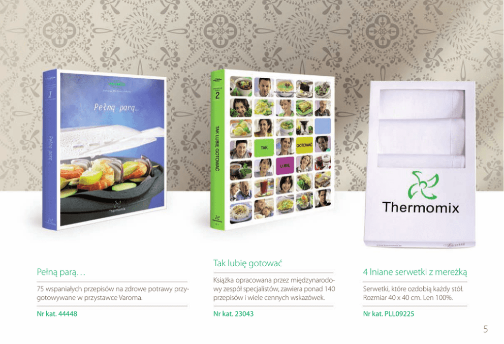 Pełną parą… Tak lubię gotować 75 wspaniałych przepisów na zdrowe potrawy przygotowywane w przystawce Varoma. Książka opracowana przez międzynarodowy zespół specjalistów, zawiera ponad 140 przepisów i wiele cennych wskazówek. Nr kat. 44448 Nr kat. 23043 4 lniane serwetki z mereżką Serwetki, które ozdobią każdy stół. Rozmiar 40 x 40 cm. Len 100%. Nr kat. PLL09225 5