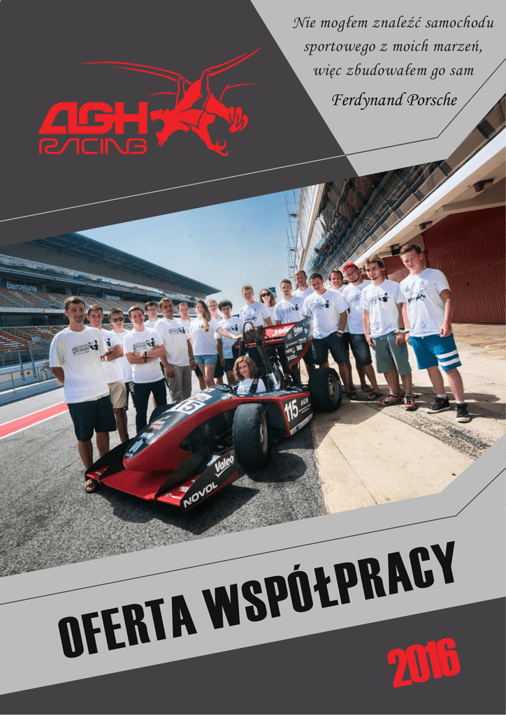Nie mogłem znaleźć samochodu sportowego z moich marzeń, więc zbudowałem go sam Ferdynand Porsche W A T R E F O Y C A R P Ł SPÓ 2016 Słowo od opiekuna Szanowni Państwo, Zwolennicy sportów motorowych i Wielbiciele Zespołu AGH Racing, W sezonie 2016 zaczynamy historyczny, czwarty już sezon działalności zespołu AGH Racing. Jest to sezon pełen wyzwań technologicznych i organizacyjnych. Wchodzimy w niego jako doświadczony już zespół Formuły Student, mający za sobą 3 sezony startowe i udział w 7 Międzynarodowych Zawodach Formuły Student. Wyniki, jakie uzyskaliśmy w poprzednim sezonie, klasyfikują nasze konstrukcje w gronie jednych z najszybszych na zawodach (11/59 miejsce w konkurencjach dynamicznych FS Spain). Na tle polskich zespołów jesteśmy jednym z nielicznych, które co roku budują nowe auto i systematycznie startują w Międzynarodowych Zawodach Formula Student/FSAE. Także w nadchodzącym sezonie chcemy podtrzymać tę tradycję konkurując z najlepszymi uniwersytetami z całego świata. AGH Racing stało się rozpoznawalną marką, stała współpraca z firmami pod patronatem i przy wsparciu Akademii Górniczo-Hutniczej w Krakowie, zaowocowała budową ścisłych relacji techniczno-biznesowych z przedsiębiorcami z obszaru automotive, a także pozwoliła nam zaistnieć w obszarze szeroko rozumianej techniki inżynieryjnej. Zbudowany ekosystem działania pozwala na ustawiczne kształcenie najlepszych inżynierów-konstruktorów, którzy mają ścisłą podbudowę praktyczną. Członkowie teamu AGH Racing są poszukiwani na rynku pracy, a nierzadko sami zakładają własne firmy, kontynuując tradycję ducha przedsiębiorczości zaszczepioną w projekcie. Zabawa i pasja realizowana przez budowę aut staje się metodą na życie, gdzie kluczową rolę odgrywają takie wartości jak dokładność, innowacyjność, pomysłowość i zaradność. To obszar w którym poruszają się członkowie zespołu i team AGH Racing jako jedność. Rozpoczynamy sezon 2016 i zapraszamy do współpracy. Gwarantujemy niezapomnianą dawkę emocji i najnowocześniejszych technologii. Bądźcie z nami przez cały sezon, który zapowiada się pod znakiem dużych innowacji technologicznych. Zapraszamy do współpracy! dr inż. Daniel Prusak Opiekun naukowy zespołu AGH Racing 1 Kilka słów o nas Jesteśmy ambitnym i kreatywnym zespołem, który stale się rozwija. Za nami trzeci sezon Formuły Student i starty w zawodach FS Hungary, FS Italy oraz FS Spain na torze Circuit de Catalunya – Barcelona. Obecnie jesteśmy w trakcie ulepszania naszego trzeciego bolidu, który ma być jeszcze lepszy, szybszy i bardziej niezawodny od poprzedniego modelu. W tym sezonie chcemy wystartować na bardziej prestiżowych zawodach na torze Formuły 1 - Silverstone w Wielkiej Brytanii oraz na torze Hockenheim w Niemczech. Zespół AGH Racing powstał w 2012 roku, a zapoczątkowała go grupa entuzjastów motoryzacji z Wydziału Inżynierii Mechanicznej i Robotyki Akademii Górniczo-Hutniczej. Projekt szybko zyskał dużą popularność i uznanie, zarówno wśród studentów, jak i władz uczelni. Uzyskaliśmy tytuł najlepszego projektu studenckiego Akademii Górniczo-Hutniczej 2013, natomiast nasz opiekun dr inż. Daniel Prusak został Krakowianinem Roku w kategorii „nauka”. 2 Formuła Student Są to zawody przeznaczone dla uczelni i wydziałów technicznych z całego świata. Na różnych torach wyścigowych – często tych samych, na których odbywają się wyścigi Formuły 1 – studenci z najlepszych szkół wyższych prezentują swoje bolidy. Liczą się zarówno właściwości jezdne auta, jak i jego prezentacja. Samochody zaliczają się do różnego rodzaju klas i muszą spełniać szereg wymagań bezpieczeństwa narzuconych regulaminem zawodów FS. Rozgrywane podczas zawodów konkurencje dzieli się na część statyczną i dynamiczną. Łącznie do zdobycia jest 1000 punktów. Zwycięża drużyna, która uzyska ich najwięcej. W konkurencjach dynamicznych bolid testowany jest w takich kategoriach jak przyspieszenie na 75 metrów, kilometrowy tor przeszkód i jazda na 22 km ze zmianą kierowcy. Do konkurencji statycznych wliczamy prezentację biznesową, analizę kosztów, inspekcję techniczną. Brany pod uwagę jest także design. 3 Parametry pojazdu 4 Nasze osiągnięcia Sezon 2012/2013 Wybudowanie pierwszego w historii samochodu wyścigowego na Akademii Górniczo-Hutniczej Oficjalna premiera pierwszego bolidu - ponad 2000 uczestników wydarzenia Materiały medialne w takich telewizjach jak TVN24, TVN Turbo, TVP Materiały prasowe w Wirtualny Nowy Przemysł, Moje Miasto Kraków, LoveKrakow, Onet.pl Start w zawodach Formuły Student na torze Formuły1 na Silverstone (UK) oraz na Węgrzech na torze Audi w Gyor. Sezon 2013/2014 Drugi bolid wyścigowy na Akademii Górniczo-Hutniczej Start w zawodach Formuły Student na torze Formuły1 w Barcelonie oraz w Czechach Udział w licznych targach i eventach takich jak MotoShow Kraków, Kompozyt Expo, WOŚP na krakowskim rynku, targi EUROTOOL Wywiady w Radiu Nowinki, RMF Maaxxx, Panorama Magazine, RMF fm Artykuły w Biuletyn AGH, Periodyku Innowacyjny Start, AutomotiveSuppliers Najlepszy projekt na uczelni w Edycji Projektow Akademickich Warsztaty dla najmłodszych AGH Junior - Jak zbudować bolid 5 Nasze osiągnięcia Sezon 2014/2015 Wybudowanie trzeciego już w historii Akademii Górniczno-Hutniczej bolidu wyścigowego Start w trzech seriach Formuły Student: Barcelona - tor Formuły1, Węgry tor Audii - Gyor oraz Włochy - tor Alfy Romeo w Varano Zajęcie 12 miejsca na FS Spain w konkurencji Business Presentation (najlepszego w historii AGH Racing) Pokaz bolidu podczas gali ‘Burzy mózgów’ organizowanej przez Akademię Górniczo-Hutniczą Liczne wywiady w RMF Maxxx, AntyRadio, RadioNowinki, TVN, Radio Kraków, TVP, Dziennik Polski, Artykuły w Wprost, LoveKrakow, Dziennik Polski, Gazeta Wyborcza, Interia.pl, Onet.pl, F1 Racing, Mias