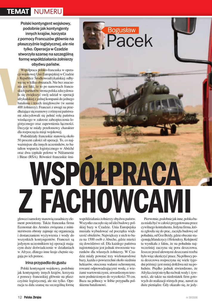 AAAAAAA TEMAT WYDARZENIA NUMERU AAAAAAAA ZAPIS Polski kontyngent wojskowy, podobnie jak kontyngenty innych krajów, korzysta z pomocy Francuzów głównie na płaszczyźnie logistycznej, ale nie tylko. Operacja w Czadzie stworzyła szansę na szczególną formę współdziałania żołnierzy obydwu państw. Bogusław Pacek Współpraca polsko-francuska w operacji wojskowej Unii Europejskiej w Czadzie i Republice Środkowoafrykańskiej odbywa się w kilku obszarach. Nie bez znaczenia jest fakt, że to po namowach francuskich partnerów strona polska zdecydowała się zwiększyć swój udział w operacji afrykańskiej z jednej kompanii do jednego batalionu i trzech śmigłowców (w sumie 400 żołnierzy). Francuzi z uwagi na przedłużające się rozmowy z różnymi państwami zdecydowali się pełnić rolę państwa wiodącego w zakresie zabezpieczenia logistycznego oraz zapewnienia łączności. Decyzje te miały przełomowy charakter dla rozpoczęcia misji wojskowej. Pododdziały francuskie stanowią około 50 procent całości sił operacji. To, co najważniejsze dla innych uczestników, to batalion wsparcia logistycznego w Abéché oraz dwa szpitale polowe w Ndżamenie i Birao (RŚA). Również francuskie śmi- WSPÓŁPRACA Z FACHOWCAMI głowce i samoloty stanowią zasadniczy element powietrzny. Także francuska firma Economat des Armées związana z ministerstwem obrony zajmuje się organizacją i dostarczaniem wyżywienia i wody do wszystkich kontyngentów. Francuzi są jedynym uczestnikiem tej operacji mającym duże doświadczenie w działaniach w Afryce, dlatego inne kraje chętnie sięgają po ich pomoc. Irina przypadła do gustu Polski kontyngent wojskowy, podobnie jak kontyngenty innych krajów, korzysta z pomocy francuskiej głównie na płaszczyźnie logistycznej, ale nie tylko. Operacja ta dała szansę na szczególną formę 12 Polska Zbrojna współdziałania żołnierzy obydwu państw. Wszystko zaczęło się od idei budowy polskiej bazy w Czadzie. Unia Europejska musiała wybudować od początku większość obiektów. Największy z nich to baza na 1500 osób z Abeche, gdzie mieści się dowództwo sił. Dla każdego państwa najistotniejsze jest jednak stworzenie warunków dla własnych żołnierzy. W Czadzie miały powstać trzy wielonarodowe bazy, każda o powierzchni około siedmiu hektarów, otoczona wałami ochronnymi, rowami odprowadzającymi wodę, z wieżami wartowniczymi, utwardzonym terenem podniesionym do wysokości 70 cm. Baza na północy w Iribie przypadła polskiemu batalionowi. Pierwotnie, podobnie jak inne, polska baza miała być w całości przygotowana przez cywilnego kontrahenta. Jedyna firma, która zgłosiła się do prac, zaczęła budowę od południa, od Goz Beidy, gdzie obecnie stacjonują Irlandczycy i Holendrzy. Kolejność ta wynikała z faktu, że na południu najwcześniej zaczyna się pora deszczowa. Jeszcze przed ulewnymi deszczami trzeba było więc ukończyć prace. Na północy pora deszczowa rozpoczyna się wiele tygodni później i jest mniej dotkliwa niż na południu. Prędko jednak stwierdzono, że Afryka cierpi nie tylko na brak wody i żywności, ale także na niedostatek firm gotowych do realizacji różnych prac, nawet za duże pieniądze. Gdy okazało się, że jedynr 39/2008 || | | | || | | || | | || || PKW CZAD | ZAPIS FORUM ZAPIS FORUM NA CELOWNIKU WOJSKO PORADY KULISY PORADY PO SŁUŻBIE PO SŁUŻBIE HISTORIAHISTORIA MILITARIAMILITARIA ŚWIAT PRASA PRASA KULISY ŚWIAT TO I OWO KRZYSZTOF PLAŻUK nianie wody przeznaczonej do celów sanitarnych. Po pewnym czasie swoją wiedzę przekazali polskim kolegom. Sami zajmowali się wieloma skomplikowanymi zadaniami, na przykład poprawą stanu pasa startowego. Dziś baza w Iribie jest przykładem solidnie zbudowanego „campu”, który w mojej ocenie nawet przewyższa jakością obóz zbudowany za duże pieniądze przez wyspecjalizowaną cywilną firmę w Goz Beidzie. To dowód na mistrzowskie działanie żołnierzy – inżynierów z Wojsk Lądowych na czele z kpt. Franciszkiem Książkiem. To także dowód dużego profesjonalizmu francuskich wojsk inżynieryjnych. Ale najważniejszy jest wspaniały przykład przyjaźni polsko-francuskiej, w praktycznym wymiarze, na najniższym, jednak niezwykle ważnym szczeblu. Życzliwość w Iribie to nie medialne gesty, lecz konkretne postawy i działania. Francuzi wsparli nie tylko saperów i logistyków, ale także pomogli grupie lotniczej PKW Czad przy montażu śmigłowców Mi-17. Dzięki temu udało się szybko pokonać problemy techniczne i dokonać oblotu śmigłowców. Dobre wzajemne relacje i pomoc ze strony francuskiej usprawniły także przebazowanie Dziś baza w Iribie grupy lotniczej z Ndżameny do jest przykładem solidnie Abeche, gdzie docelowo stacjonozbudowanego „campu”. wać mają polskie śmigłowce. To dowód na mistrzowskie Wspólne loty naszych Mi-17 działanie żołnierzy – inżynierów z francuskimi Pumami i Gazelle, z Wojsk Lądowych, z kpt. Franciszkiem wspólne szkolenie i działanie to Książkiem na czele. dowód tej wojskowo-operacyjnej To także dowód dużego przyjaźni. Warunki afrykańskie profesjonalizmu francuskich dla naszych żołnierzy są dużym wojsk inżynieryjnych wyzwaniem. Dla Francuzów, którzy są w Afryce od dawna, to bułka z mainżynieryjny. Najsłem. Dobre relacje żołnierzy obydwu ważniejsze z nich to państw także dobrze zapowiadają się na drużyna rozbudowy i utrzymania lotnisk przyszłość. oraz pluton maszyn inżynieryjnych. FranMiłym zaskoczeniem było dla mnie na cuzi obiecali również przygotować bazę na- przykład to, że wielu naszych żołnierzy miotową na 200 osób dla polskiej i francu- próbuje rozmawiać nie tylko po angielsku, skiej grupy inżynieryjnej, prysznice polo- ale i po francusku. Ale to jeszcze nic. Nigwe, sanitariaty, zbiorniki na wodę i wiele dy nie wyobrażałem sobie, że spotkam tak innych elementów potrzebnych na począt- wielu Francuzów