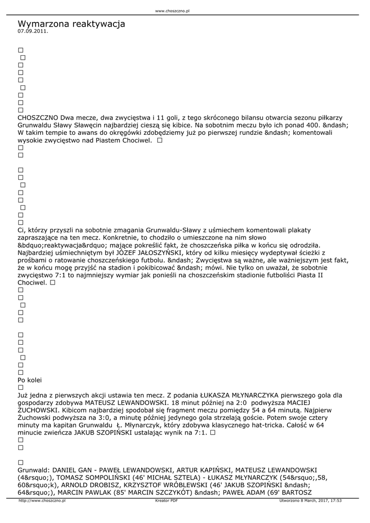 www.choszczno.pl Wymarzona reaktywacja 07.09.2011. CHOSZCZNO Dwa mecze, dwa zwycięstwa i 11 goli, z tego skróconego bilansu otwarcia sezonu piłkarzy Grunwaldu Sławy Sławęcin najbardziej cieszą się kibice. Na sobotnim meczu było ich ponad 400. – W takim tempie to awans do okręgówki zdobędziemy już po pierwszej rundzie – komentowali wysokie zwycięstwo nad Piastem Chociwel. Ci, którzy przyszli na sobotnie zmagania Grunwaldu-Sławy z uśmiechem komentowali plakaty zapraszające na ten mecz. Konkretnie, to chodziło o umieszczone na nim słowo „reaktywacja” mające pokreślić fakt, że choszczeńska piłka w końcu się odrodziła. Najbardziej uśmiechniętym był JÓZEF JAŁOSZYŃSKI, który od kilku miesięcy wydeptywał ścieżki z prośbami o ratowanie choszczeńskiego futbolu. – Zwycięstwa są ważne, ale ważniejszym jest fakt, że w końcu mogę przyjść na stadion i pokibicować – mówi. Nie tylko on uważał, że sobotnie zwycięstwo 7:1 to najmniejszy wymiar jak ponieśli na choszczeńskim stadionie futboliści Piasta II Chociwel. Po kolei Już jedna z pierwszych akcji ustawia ten mecz. Z podania ŁUKASZA MŁYNARCZYKA pierwszego gola dla gospodarzy zdobywa MATEUSZ LEWANDOWSKI. 18 minut później na 2:0 podwyższa MACIEJ ŻUCHOWSKI. Kibicom najbardziej spodobał się fragment meczu pomiędzy 54 a 64 minutą. Najpierw Żuchowski podwyższa na 3:0, a minutę później jedynego gola strzelają goście. Potem swoje cztery minuty ma kapitan Grunwaldu Ł. Młynarczyk, który zdobywa klasycznego hat-tricka. Całość w 64 minucie zwieńcza JAKUB SZOPIŃSKI ustalając wynik na 7:1. Grunwald: DANIEL GAN - PAWEŁ LEWANDOWSKI, ARTUR KAPIŃSKI, MATEUSZ LEWANDOWSKI (4’), TOMASZ SOMPOLIŃSKI (46' MICHAŁ SZTELA) - ŁUKASZ MŁYNARCZYK (54’,58, 60’k), ARNOLD DROBISZ, KRZYSZTOF WRÓBLEWSKI (46' JAKUB SZOPIŃSKI – 64’), MARCIN PAWLAK (85' MARCIN SZCZYKÓT) – PAWEŁ ADAM (69' BARTOSZ http://www.choszczno.pl Kreator PDF Utworzono 8 March, 2017, 17:53 www.choszczno.pl MARCINIAK), MACIEJ ŻUCHOWSKI (22’ i 54’) - Trener: ANDRZEJ FIK Lider jest jeden Przypomnijmy, że nasi w pierwszej kolejce pokonali Świt Barnimie 4:1 i po dwóch kolejkach prowadzą w tabeli A-klasy (grupa 5) urastając do zdecydowanego faworyta tej ligi. Najbliższe dwie kolejki rozegrają na wyjeździe. Najpierw 10 września zmierzą się z Czarnymi Marianowo, a tydzień później zagrają z Gryfem w Objezierzu. Na choszczeńskim stadionie zobaczymy ich dopiero 24 września w meczu z Jednością Przewłoki. W tej grupie występują też dwie inne choszczeńskie drużyny. Pomorzanin Zamęcin pierwszy mecz wygrał z Jednością Przewłoki 4:1, a w drugim uległ Iskrze Warszyn 0:3, natomiast Korona Raduń na inaugurację uległa 1:2 Inie Nadarzyn, a w drugim zremisowała 1:1 z Iskrą Sokoliniec. Tu znajdziecie fotoreportaż z opisywanego meczu autorstwa Magdaleny Popławskiej. (tk) http://www.choszczno.pl Kreator PDF Utworzono 8 March, 2017, 17:53