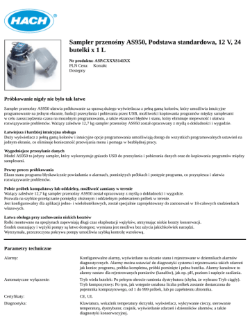 Sampler przenośny AS950, Podstawa standardowa, 12 V, 24 butelki x 1 L Nr produktu: ASP.CXXXS141XX PLN Cena: Kontakt Dostępny Próbkowanie nigdy nie było tak łatwe Sampler przenośny AS950 ułatwia próbkowanie za sprawą dużego wyświetlacza z pełną gamą kolorów, który umożliwia intuicyjne programowanie na jednym ekranie, funkcji przesyłania i pobierania przez USB, możliwości kopiowania programów między samplerami w celu zaoszczędzenia czasu na mozolnym programowaniu, a także ekranowi błędów i stanu, który eliminuje niepewność i ułatwia rozwiązywanie problemów. Ważący zaledwie 12,7 kg sampler przenośny AS950 został opracowany z myślą o dokładności i wygodzie. Łatwiejsza i bardziej intuicyjna obsługa Duży wyświetlacz z pełną gamą kolorów i intuicyjne opcje programowania umożliwiają dostęp do wszystkich programowalnych ustawień na jednym ekranie, co eliminuje konieczność przewijania menu i pomaga w bezbłędnej pracy. Wygodniejsze przesyłanie danych Model AS950 to jedyny sampler, który wykorzystuje gniazdo USB do przesyłania i pobierania danych oraz do kopiowania programów między samplerami. Pewny proces próbkowania Ekran stanu programu błyskawicznie powiadamia o alarmach, pominiętych próbkach i postępie programu, co przyspiesza i ułatwia rozwiązywanie problemów. Pobór próbek kompaktowy lub oddzielny, możliwość zamiany w terenie Ważący zaledwie 12,7 kg sampler przenośny AS950 został opracowany z myślą o dokładności i wygodzie. Pozwala na szybkie przełączanie pomiędzy złożonym i oddzielnym pobieraniem próbek w terenie. Jest konfigurowalny dla aplikacji jedno- i wielobutelkowych, został specjalnie zaprojektowany do zastosowań w 18-calowych studzienkach włazowych. Łatwa obsługa przy zachowaniu niskich kosztów Rolki montowane na sprężynach zapewniają długi czas eksploatacji wężyków, utrzymując niskie koszty konserwacji. Środek osuszający i wężyki pompy są łatwo dostępne; wymiana jest możliwa bez użycia jakichkolwiek narzędzi. Wytrzymała, przezroczysta pokrywa pompy umożliwia szybką kontrolę wzrokową. Parametry techniczne Alarmy: Konfigurowalne alarmy, wyświetlane na ekranie stanu i rejestrowane w dziennikach alarmów diagnostycznych. Alarmy można ustawiać do diagnostyki systemu i rejestrowania takich zdarzeń jak koniec programu, próbka kompletna, próbki pominięte i pełna butelka. Alarmy kanałowe to alarmy nastaw dla rejestrowanych pomiarów (kanałów), jak np. pH, poziom i napięcie zasilania. Automatyczne wyłączenie: Tryb wielu butelek: Po pełnym obrocie ramienia dystrybutora (chyba, że wybrano Tryb ciągły). Tryb kompozytowy: Po tym, jak wstępnie ustalona liczba próbek zostanie dostarczona do pojemnika kompozytowego, od 1 do 999 próbek, lub po zapełnieniu zbiornika. Certyfikaty: CE, UL Diagnostyka: Klawiatura, wskaźnik temperatury skrzynki, wyświetlacz, wykrywanie cieczy, sterowanie temperaturą, dystrybutor, czujnik, wyświetlanie zdarzeń i dzienników alarmów, a także diagnostyki konserwacyjnej. Dokładność objętości: Typowa: ±5% próbki o objętości 200 mL: wysokość zasysania 4,6 m, przewód doprowadzający winylowy 3/8 cala 4,9 m, pojedyncza butelka, system wyłącznika pełnej butelki w temperaturze pokojowej i 1524 m nad poziomem morza. Dopływ: Filtry siatkowe: materiał do wyboru z PTFEu i ze stali nierdzewnej 316, lub wszystkie ze stali nierdzewnej 316 w standardowych wymiarach, duża prędkość i niski profil do aplikacji przy małych głębokościach. Czyszczenie: przedmuchiwanie powietrzem przed i po każdej próbce; automatyczna kompensacja czasu trwania dla przewodów doprowadzających o różnej długości. Przepłukiwanie: Przewód doprowadzający jest automatycznie płukany badaną cieczą przed każdą próbką, od 1 do 3 płukań. Powtórzenia i usterki: Cykl pobierania próbek jest automatycznie powtarzany od 1 do 3 razy, jeśli próbka nie została pobrana podczas pierwszej próby. Ekran stanu: Komunikuje, który program jest uruchomiony, czy zarejestrowano pominięte próbki, kiedy zostanie pobrana następna próbka, jak wiele próbek pozostało do pobrania, liczbę zarejestrowanych kanałów, czas ostatniego pomiaru, dostępność wolnej pamięci, liczbę aktywnych kanałów, czy zostały uaktywnione alarmy, kiedy zostały wyzwolone uaktywnione alarmy, aktywne czujniki i temperaturę szafy Funkcja zabezpieczenia wyświetlacza: Kod dostępu zapobiega nieuprawnionemu dostępowi Interfejs użytkownika: Klawiatura z przełącznikami membranowymi z dwoma wielofunkcyjnymi przyciskami programowymi Interwał rejestracji: Ustawialny w krokach co jeden impuls w zakresie od 1 do 9999 impulsów przepływu, lub w krokach co jedną minutę w zakresie od 1 do 9999 minut. Języki: Chiński, angielski, francuski, niemiecki, włoski, hiszpański, portugalski Języki interfejsu użytkownika: Chiński, angielski, francuski, niemiecki, włoski, hiszpański, portugalski Konfiguracje butelek: 24 x 1 L Materiał obudowy: Odporne na uderzenia tworzywo sztuczne ABS, 3-częściowa konstrukcja, dwuścienna podstawa z 2,54 cm izolacją, bezpośredni kontakt lodu z butelkami (sampler). Objętość próbki: Programowalna w krokach co 10 mL od 10 do 10000 mL. Opcje komunikacji: USB oraz opcjonalnie RS485 (Modbus) Opcje wbudowane fabrycznie: PRZYŁĄCZE DESZCZOMIERZA/RS485 Obsługuje deszczomierz Hach (niedołączony do zestawu) lub może być używane do komunikacji jako złącze RS485. Pamięć: Historia próbkowania: 4000 zapisów; Dziennik danych: 325,000 zapisów; Dziennik zdarzeń: 2000 zapisów Pompa: Pompa perystaltyczna wysokiej prędkości, z dwoma rolkami, z wężykiem o wymiarach 0,95 cm śr. wewn. x 0,16 cm śr. zewn. (3/8-cala śr. wewn. x 5/8-cala śr. zewn.), obudowa pompy IP37, pokrywa poliwęglanowa. Port czujnika: 0 Powtarzalność objętości próbki: Typowy: ±5% dla próbki o objętości 200 mL: wysokość zasysania 4,6 m, wąż doprowadza