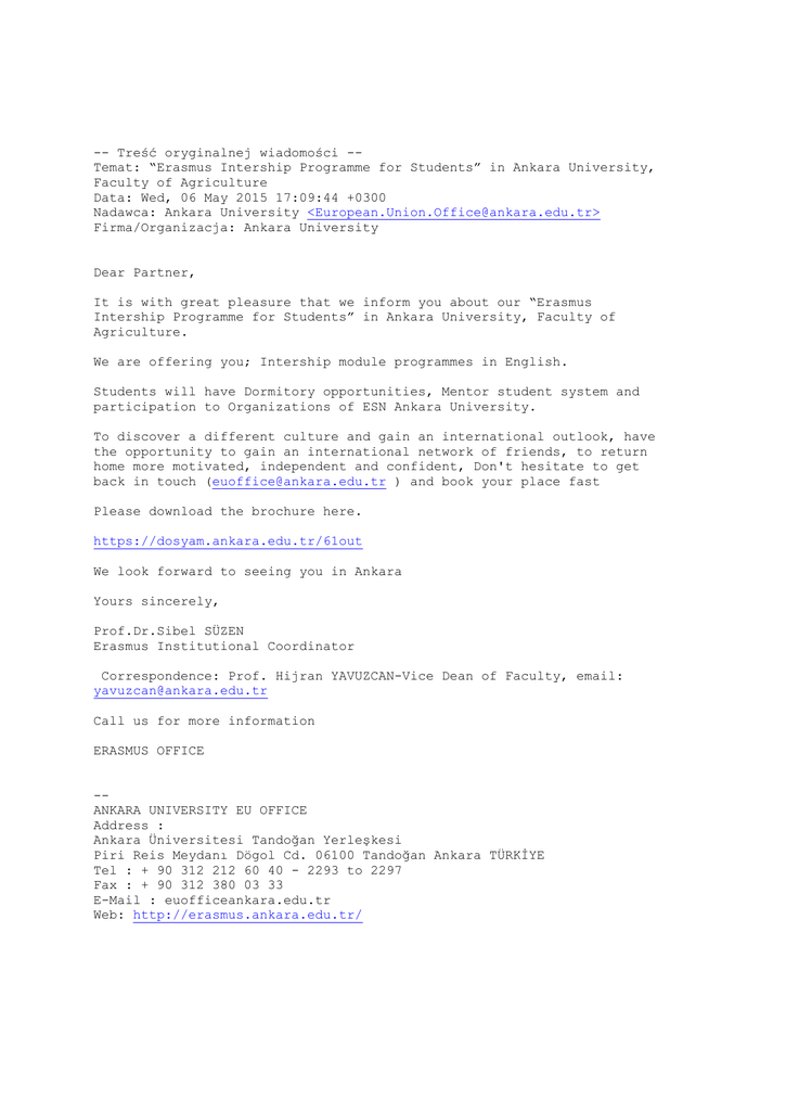 -- Treść oryginalnej wiadomości -Temat: “Erasmus Intership Programme for Students” in Ankara University, Faculty of Agriculture Data: Wed, 06 May 2015 17:09:44 +0300 Nadawca: Ankara University <[email protected]> Firma/Organizacja: Ankara University Dear Partner, It is with great pleasure that we inform you about our “Erasmus Intership Programme for Students” in Ankara University, Faculty of Agriculture. We are offering you; Intership module programmes in English. Students will have Dormitory opportunities, Mentor student system and participation to Organizations of ESN Ankara University. To discover a different culture and gain an international outlook, have the opportunity to gain an international network of friends, to return home more motivated, independent and confident, Don't hesitate to get back in touch ([email protected] ) and book your place fast Please download the brochure here. https://dosyam.ankara.edu.tr/61out We look forward to seeing you in Ankara Yours sincerely, Prof.Dr.Sibel SÜZEN Erasmus Institutional Coordinator Correspondence: Prof. Hijran YAVUZCAN-Vice Dean of Faculty, email: [email protected] Call us for more information ERASMUS OFFICE -ANKARA UNIVERSITY EU OFFICE Address : Ankara Üniversitesi Tandoğan Yerleşkesi Piri Reis Meydanı Dögol Cd. 06100 Tandoğan Ankara TÜRKİYE Tel : + 90 312 212 60 40 - 2293 to 2297 Fax : + 90 312 380 03 33 E-Mail : euofficeankara.edu.tr Web: http://erasmus.ankara.edu.tr/