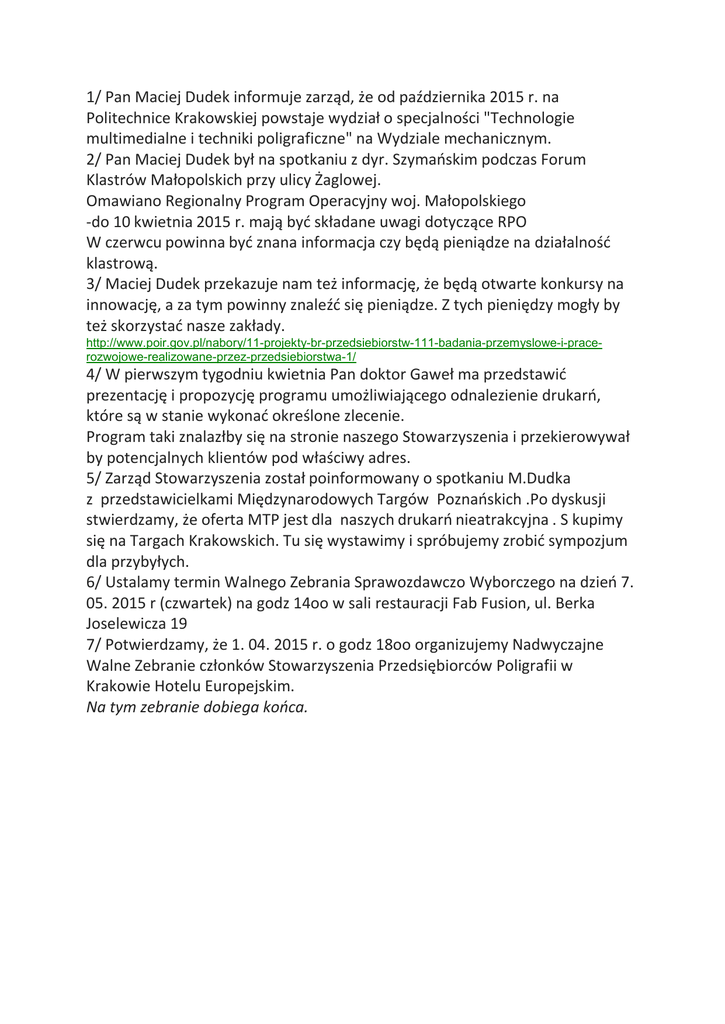 1/ Pan Maciej Dudek informuje zarząd, że od października 2015 r. na Politechnice Krakowskiej powstaje wydział o specjalności "Technologie multimedialne i techniki poligraficzne" na Wydziale mechanicznym. 2/ Pan Maciej Dudek był na spotkaniu z dyr. Szymańskim podczas Forum Klastrów Małopolskich przy ulicy Żaglowej. Omawiano Regionalny Program Operacyjny woj. Małopolskiego -do 10 kwietnia 2015 r. mają być składane uwagi dotyczące RPO W czerwcu powinna być znana informacja czy będą pieniądze na działalność klastrową. 3/ Maciej Dudek przekazuje nam też informację, że będą otwarte konkursy na innowację, a za tym powinny znaleźć się pieniądze. Z tych pieniędzy mogły by też skorzystać nasze zakłady. http://www.poir.gov.pl/nabory/11-projekty-br-przedsiebiorstw-111-badania-przemyslowe-i-pracerozwojowe-realizowane-przez-przedsiebiorstwa-1/ 4/ W pierwszym tygodniu kwietnia Pan doktor Gaweł ma przedstawić prezentację i propozycję programu umożliwiającego odnalezienie drukarń, które są w stanie wykonać określone zlecenie. Program taki znalazłby się na stronie naszego Stowarzyszenia i przekierowywał by potencjalnych klientów pod właściwy adres. 5/ Zarząd Stowarzyszenia został poinformowany o spotkaniu M.Dudka z przedstawicielkami Międzynarodowych Targów Poznańskich .Po dyskusji stwierdzamy, że oferta MTP jest dla naszych drukarń nieatrakcyjna . S kupimy się na Targach Krakowskich. Tu się wystawimy i spróbujemy zrobić sympozjum dla przybyłych. 6/ Ustalamy termin Walnego Zebrania Sprawozdawczo Wyborczego na dzień 7. 05. 2015 r (czwartek) na godz 14oo w sali restauracji Fab Fusion, ul. Berka Joselewicza 19 7/ Potwierdzamy, że 1. 04. 2015 r. o godz 18oo organizujemy Nadwyczajne Walne Zebranie członków Stowarzyszenia Przedsiębiorców Poligrafii w Krakowie Hotelu Europejskim. Na tym zebranie dobiega końca.