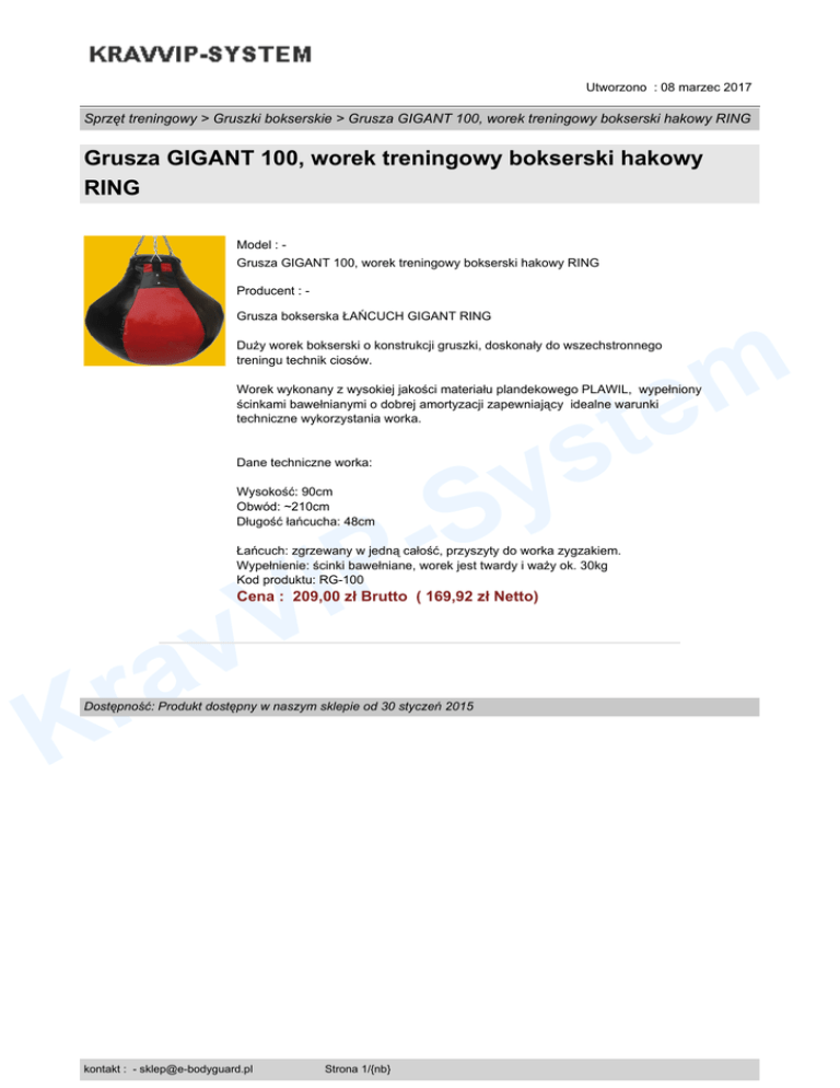 Utworzono : 08 marzec 2017 Sprzęt treningowy > Gruszki bokserskie > Grusza GIGANT 100, worek treningowy bokserski hakowy RING Grusza GIGANT 100, worek treningowy bokserski hakowy RING Model : Grusza GIGANT 100, worek treningowy bokserski hakowy RING Producent : Grusza bokserska ŁAŃCUCH GIGANT RING m te Duży worek bokserski o konstrukcji gruszki, doskonały do wszechstronnego treningu technik ciosów. Worek wykonany z wysokiej jakości materiału plandekowego PLAWIL, wypełniony ścinkami bawełnianymi o dobrej amortyzacji zapewniający idealne warunki techniczne wykorzystania worka. Dane techniczne worka: s y S IP Wysokość: 90cm Obwód: ~210cm Długość łańcucha: 48cm Łańcuch: zgrzewany w jedną całość, przyszyty do worka zygzakiem. Wypełnienie: ścinki bawełniane, worek jest twardy i waży ok. 30kg Kod produktu: RG-100 V v a r Cena : 209,00 zł Brutto ( 169,92 zł Netto) K Dostępność: Produkt dostępny w naszym sklepie od 30 styczeń 2015 kontakt : - [email protected] Strona 1/{nb}